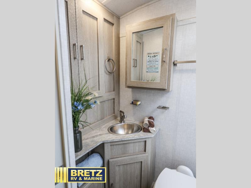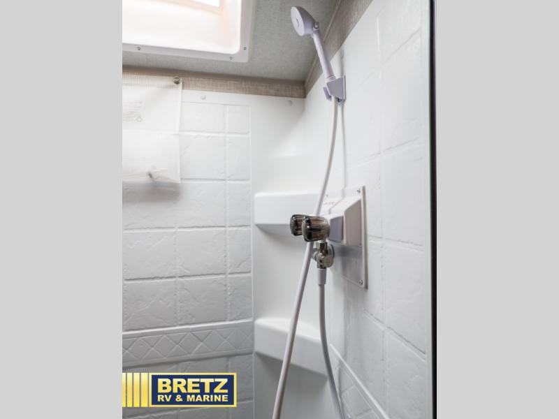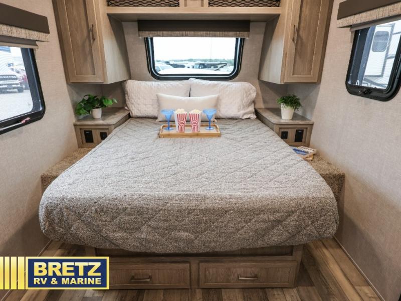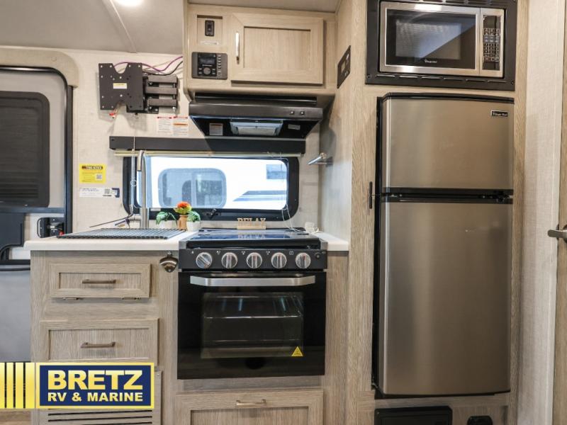 Get ready for a spacious and comfortable trip in this trailer, plus you will have a convenient rear full bathroom with an oversized shower and linen storage to utilize instead of using the campground's facilities. The walk-around full bed gives you two sides with wardrobes to claim as your own.  And the kitchen offers full amenities to make meals, and the outside griddle gives you even more choices when cooking.  You can relax, dine or even work from the slide out sofa with table and watch the TV. You will find storage along the exterior for your outdoor gear, plus a 14' power awning