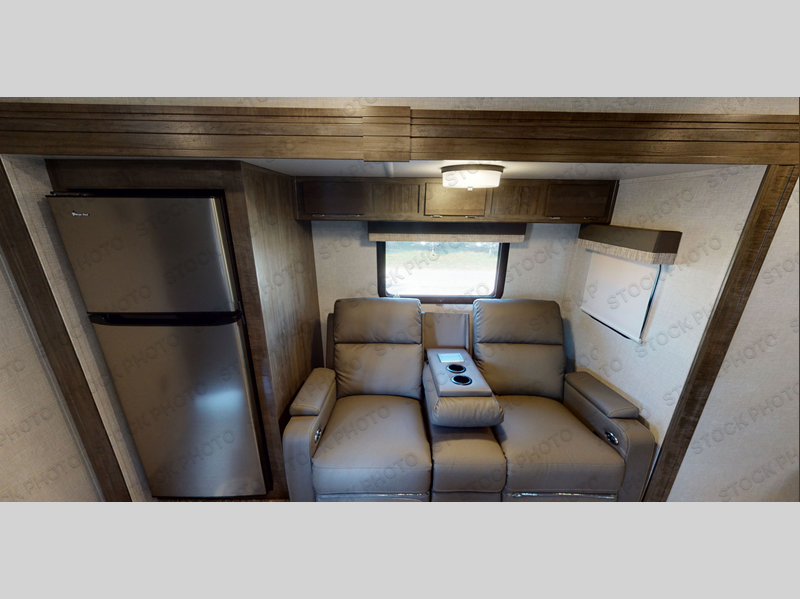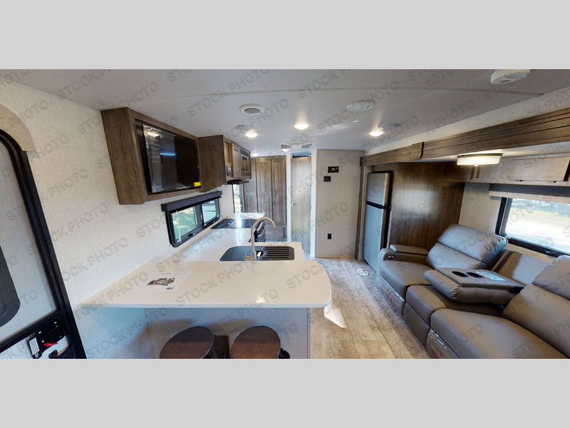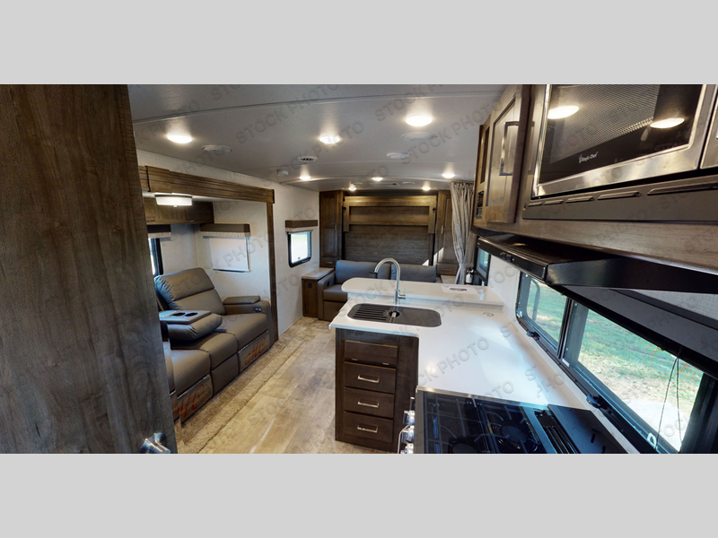 You are going to absolutely love this Flagstaff Micro Lite travel trailer! One feature found on this trailer that will make life easier is the set of two entry doors. Now you can choose whether or not you want to enter the front portion or the back portion of this trailer. If you enter through the rear entry door, you will be able to walk straight into the full bathroom, and that will make it convenient for those times when you are outside playing and need to come in quickly. Up at the front of this trailer is a Murphy bed that can be folded away during the day to reveal a 72" sofa for lounging. You can also choose to sit in one of the two bar stools at the breakfast bar, or you may want to put your feet up in the 67" theater seating. The kitchen also has a countertop extension so that you can add some extra prep space while you cook.