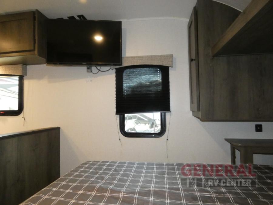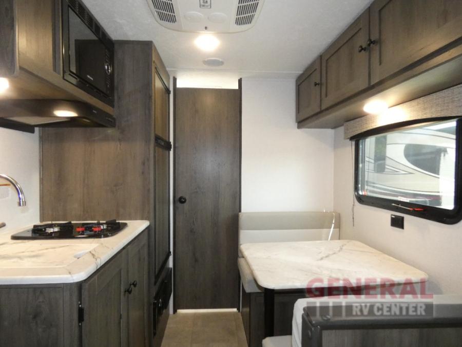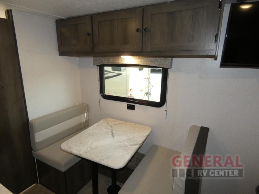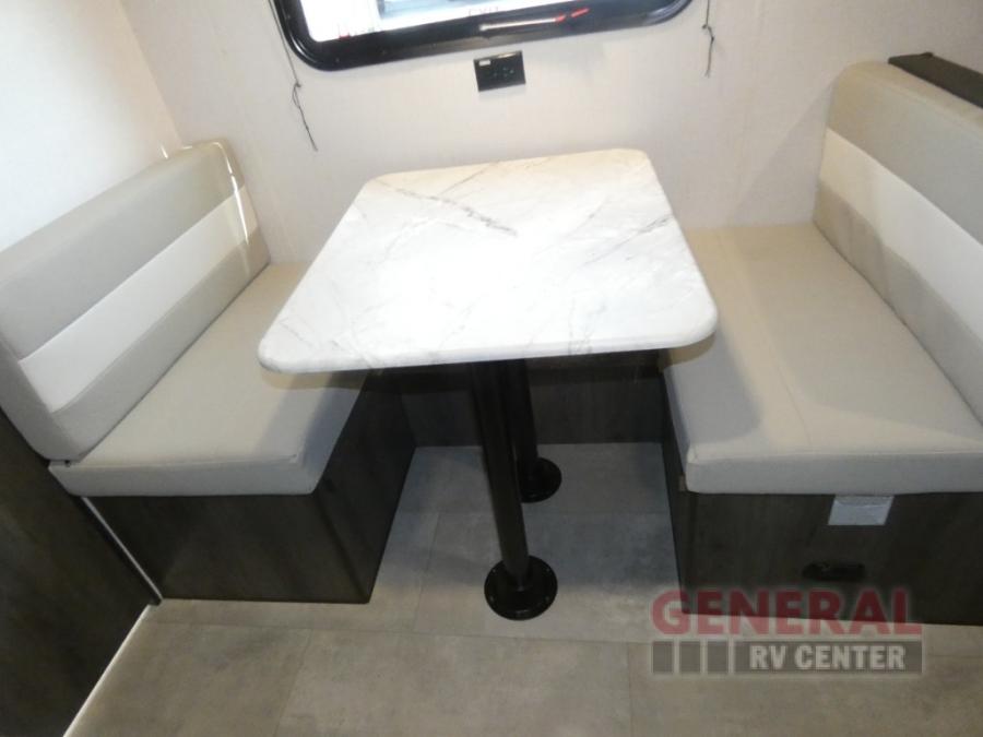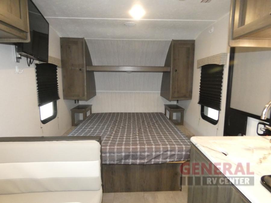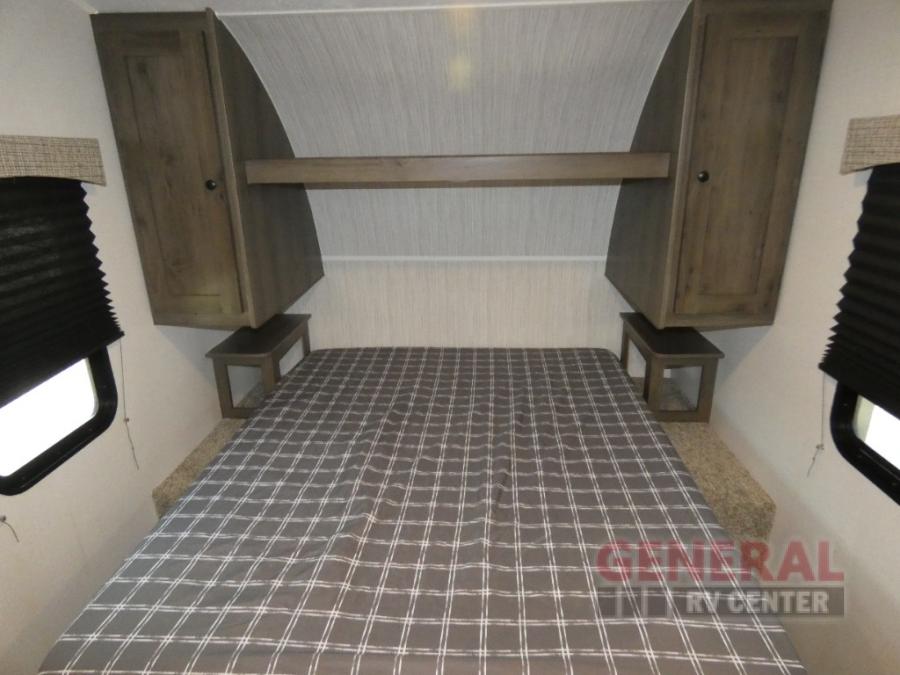 Go camping in this travel trailer at your favorite spot with your favorite person! Get a good night's rest each night on the front 60" x 74" queen bed then grab some eggs from the 7 cu. ft. gas/electric refrigerator and fry them up on the two burner cooktop. Enjoy your meals at the booth dinette and you can even transform it into an extra sleeping space for a guest or two depending on their size. Freshen up each morning in the full rear bathroom with the shower that has a skylight above to bring the outdoors inside. Set up a table and chairs under the 12' power awning to breathe in some fresh air while you relax!