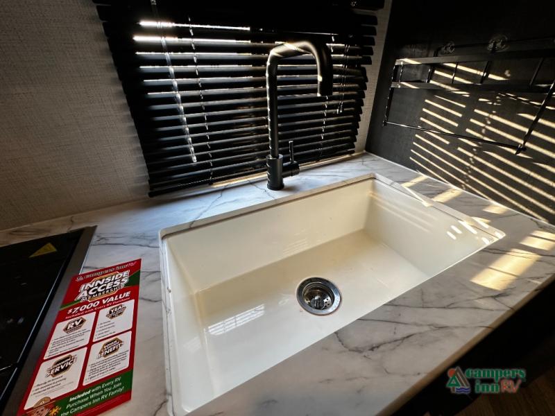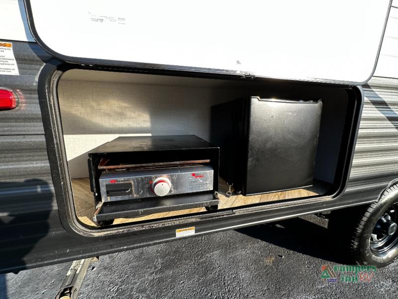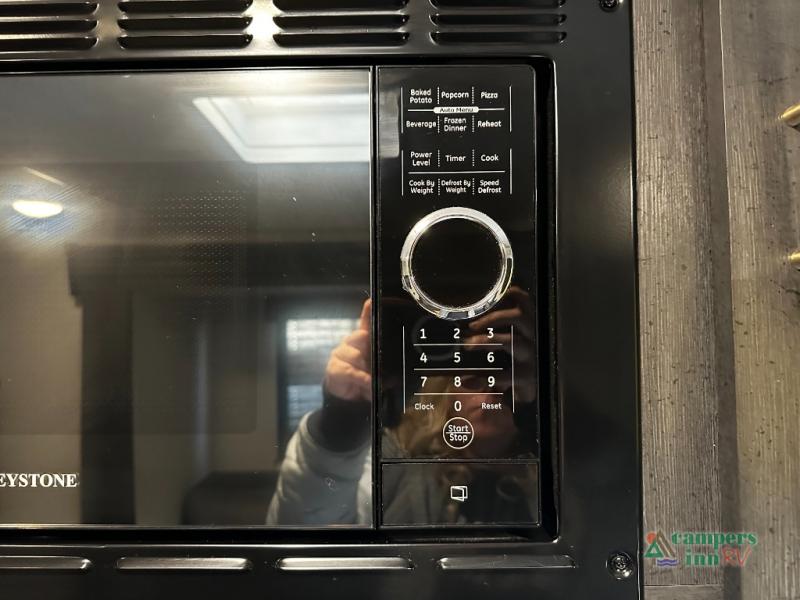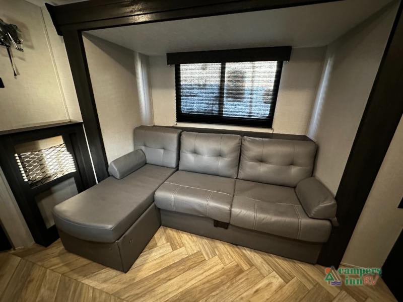 You can create the perfect oasis with this Ozark travel trailer! The exterior is outfitted with many useful features, like a 15' power awning to protect you, an outside shower with hot/cold water to rinse you off, an exterior LP griddle and refrigerator to allow you to prepare meals in the fresh air, a spare tire to use if you find yourself in need of a replacement, and an oversized door for storage access to the interior. On the interior, there is extra room thanks to the single slide. This slide is what holds the convertible chaise lounge with storage, and there is also a removable table in front of the chaise lounge for a place to eat when dinner is ready. The Murphy bed is especially useful when you are trying to be frugal with your space because it can fold away to reveal a sofa during the day.