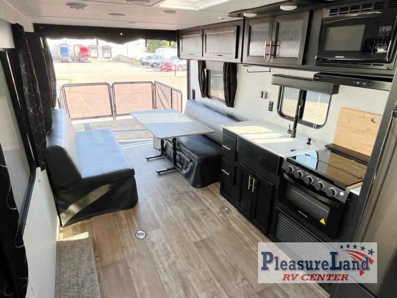 Take this Patriot Edition toy hauler out to the campground of your choice for loads of outdoor fun! Create delicious dinners with the fabulous features found in the kitchen, like the three-burner range top, microwave, and residential farm-style stainless steel sink. For a comfortable night of rest, head to the front master suite where you will find a queen-size bed, dual wardrobes, and a TV mount. You will even be able to host any neighbors that drop by with the fold-down sofas and dinette table.