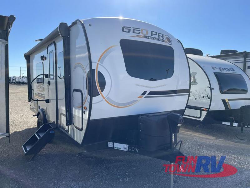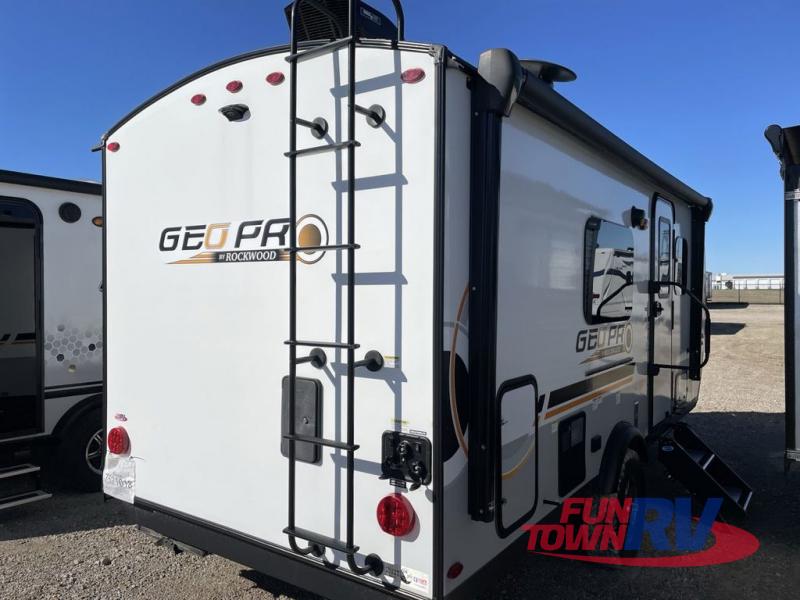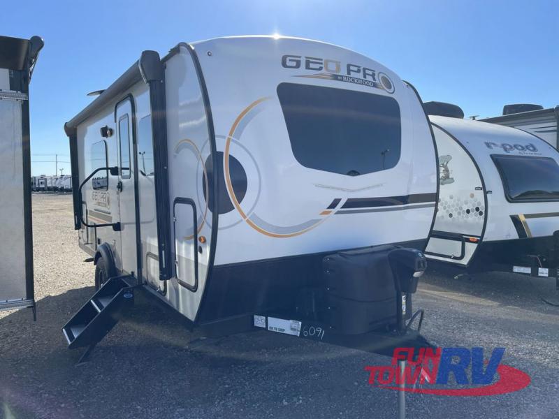The Rockwood GEO Pro travel trailers and toy hauler by Forest River are ready for all your adventures. The interior and exterior Azdel construction, along with the vacuum laminated roof and walls provide a durable trailer, and the Dexter torsion axles with aluminum wheels make towing easier than ever. There are many convenient amenities, like the 13,500 BTU A/C, the Bluetooth system control panel, and the all-in-one Teton HD TV/WiFi/FM antenna with LTE prep. Each model includes frameless windows, fabric valances and roller shades, and a modern interior that will make you feel right at home. Everything you're looking for in your next RV is in a Rockwood GEO pro by Forest River!
