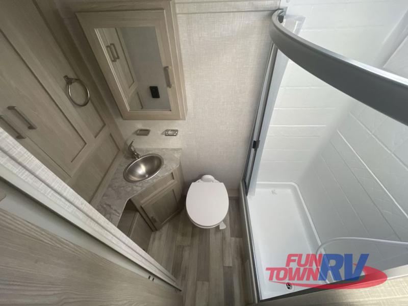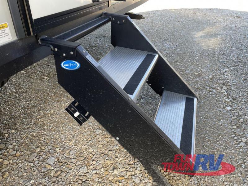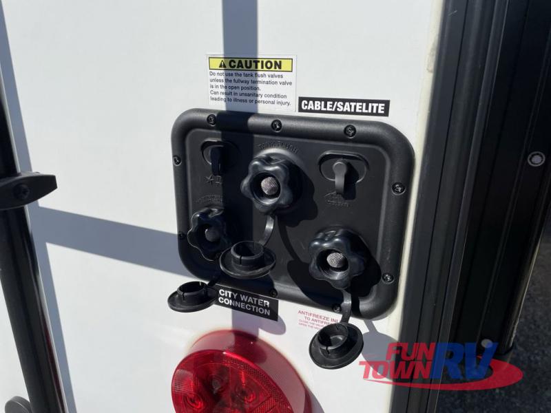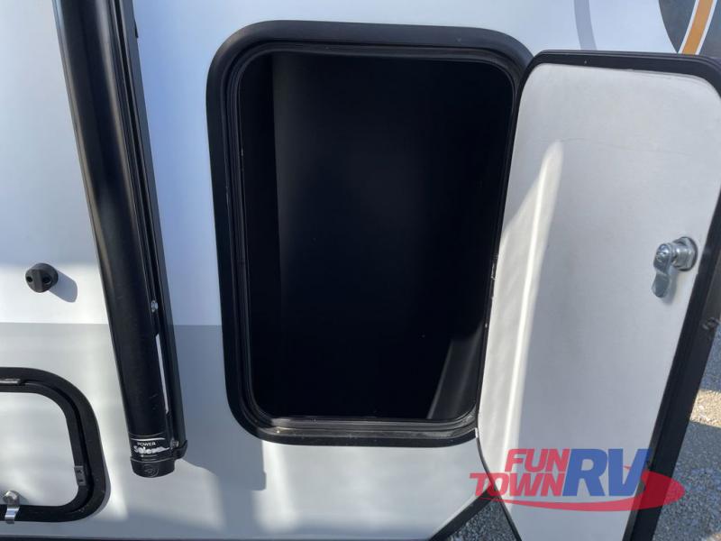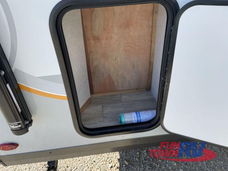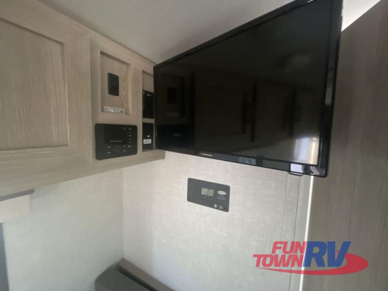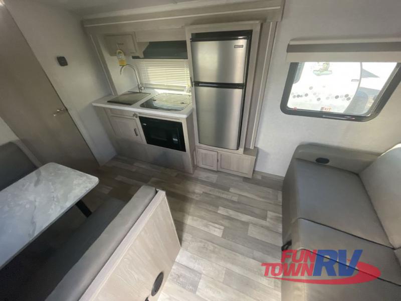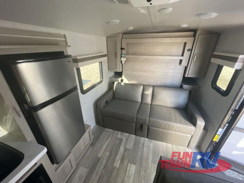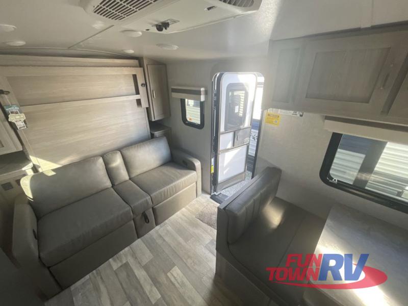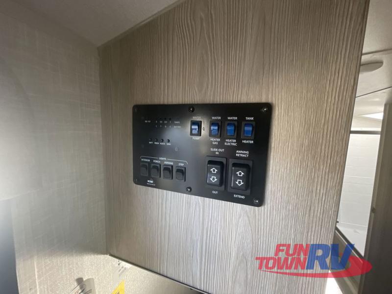 Comfortable sleeping space, convenient seating space, and a full rear bath makes this couple's trailer the one! You will love being able to relax on the sofa during the day, and sleep on the Murphy bed at night. There is a single slide out that will provide you more space to move around or cook meals, and the full bath includes a large shower so you won't feel cramped. If it's a rainy day you can watch movies on the 12V TV, and if it's nice out, sit under the 14' power awning and cook lunch on the outside griddle. The possibilities are endless with this couple's trailer!