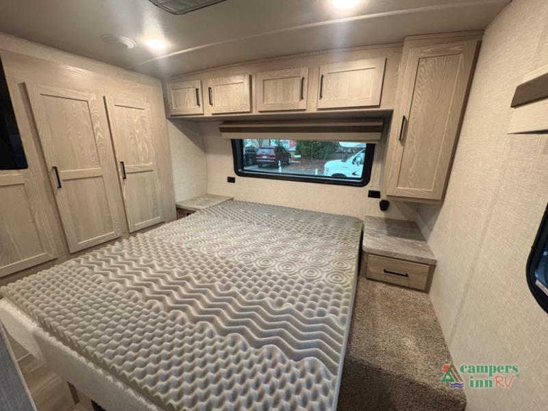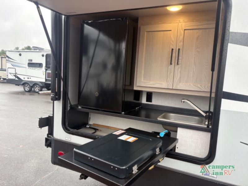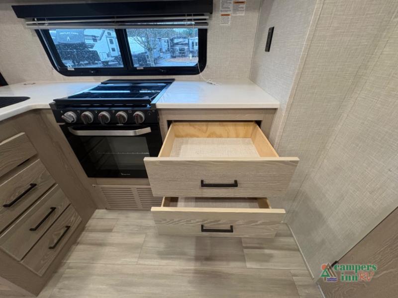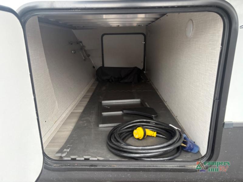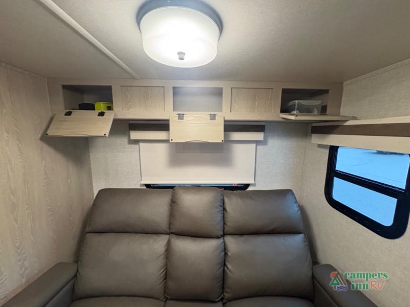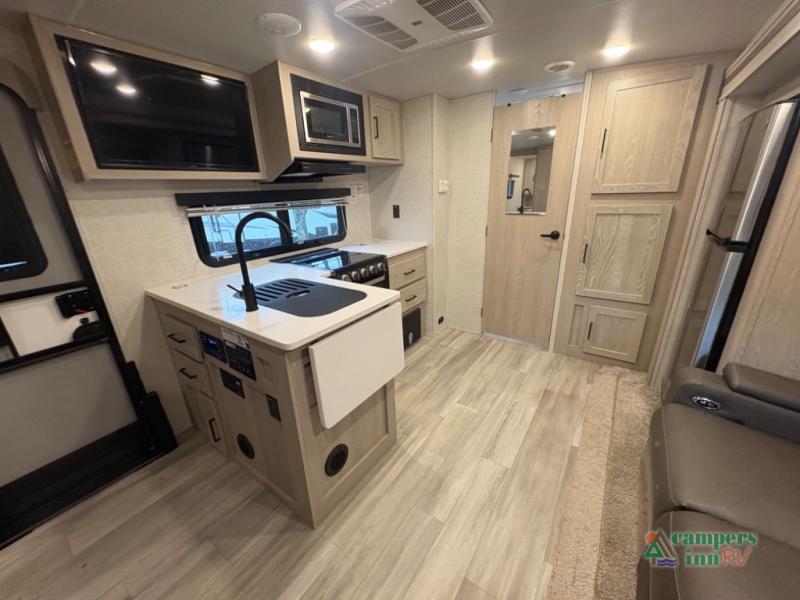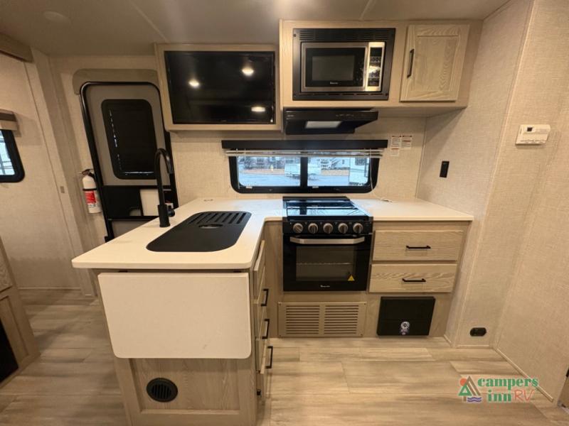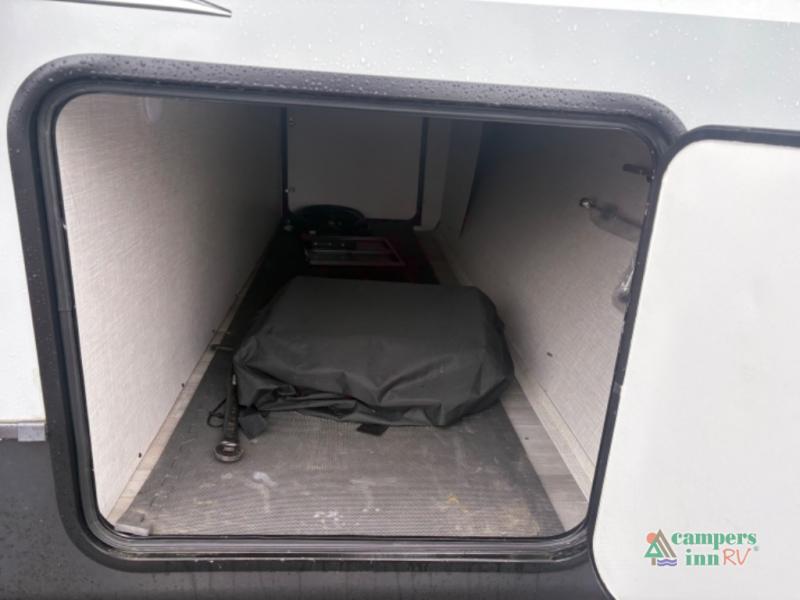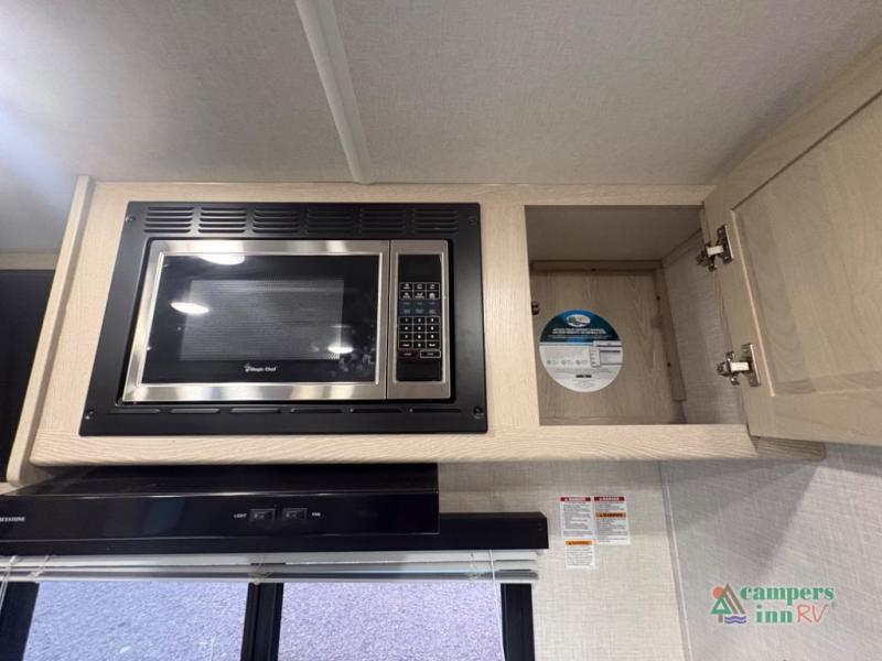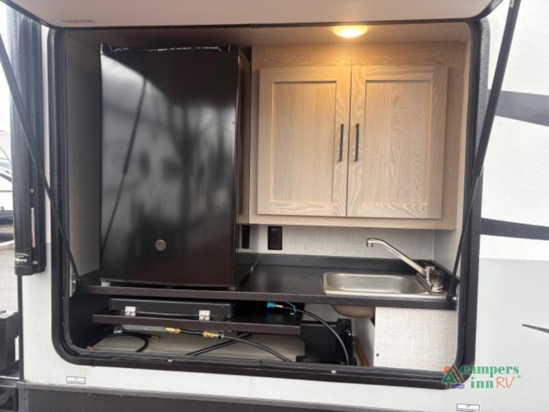 This is the perfect travel trailer for two people looking for comfortable camping trips! You will have your own RV queen bed to sleep on in the front private bedroom, and an optional TV can be added if you enjoy the morning news in bed. Breakfast can be made on the three burner cooktop, or head outdoors to cook on the outside kitchen. The theater seating with a table will provide a place to relax and dine together, and the spacious full rear bath will allow you to clean up before you head out for the day. This model includes plenty of storage space, including two pantries, a wardrobe slide out in the bedroom, plus a drop-frame pass-through storage for larger camp gear!