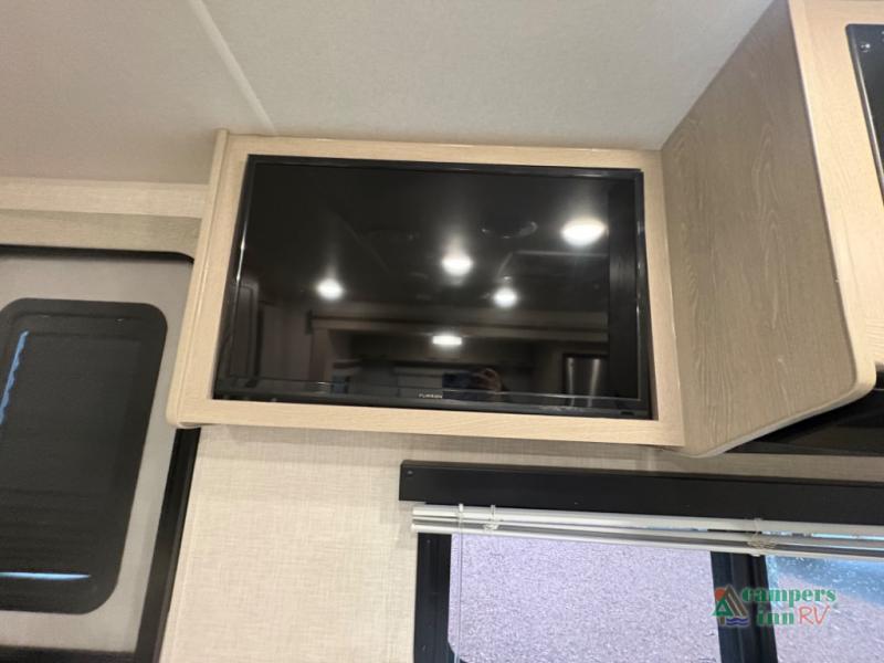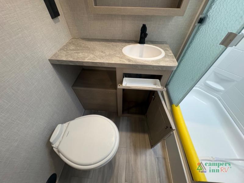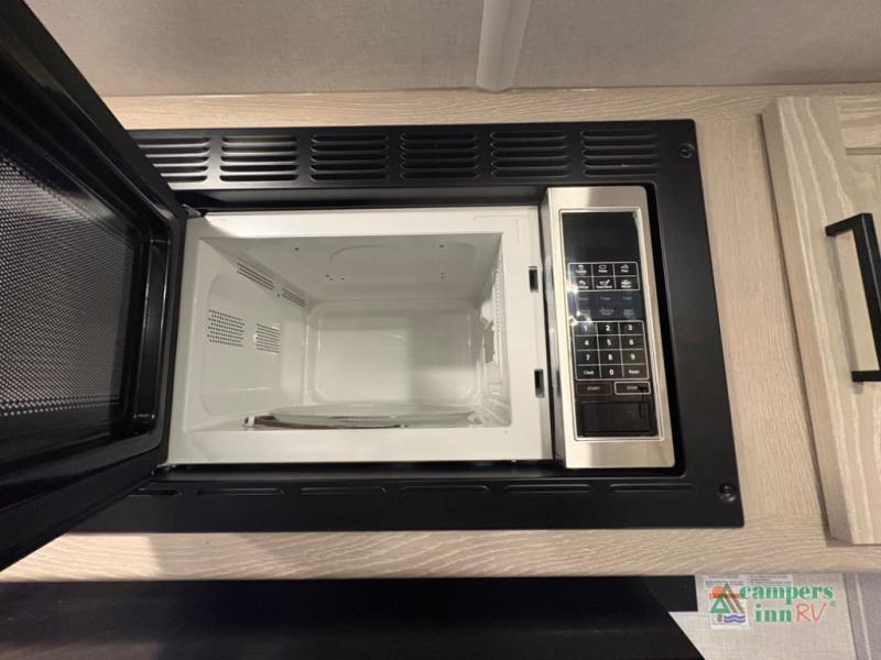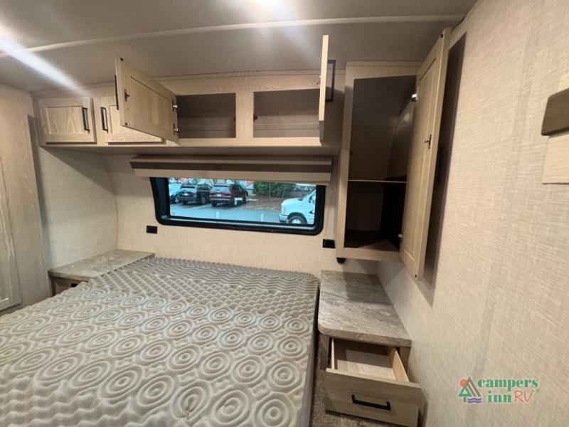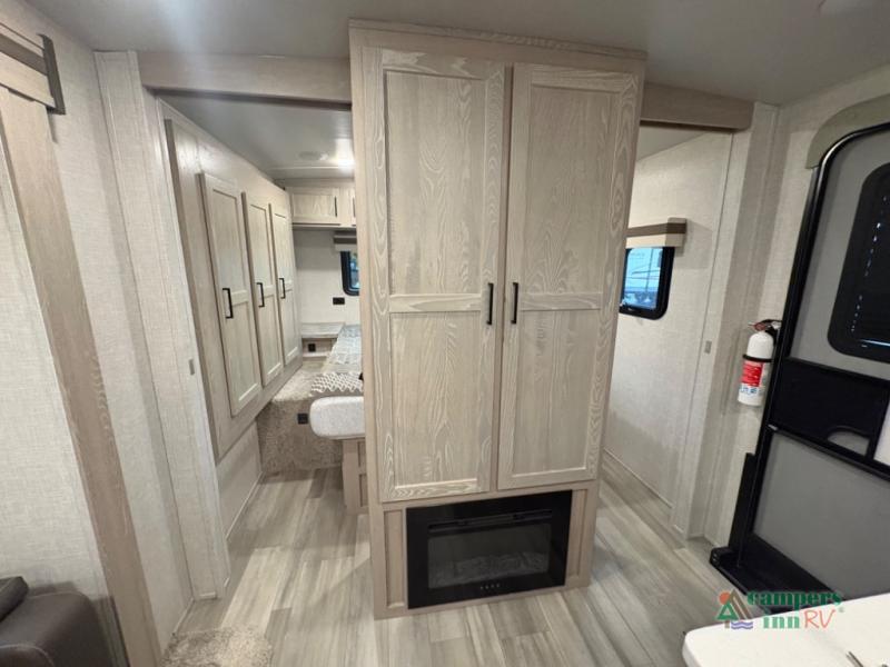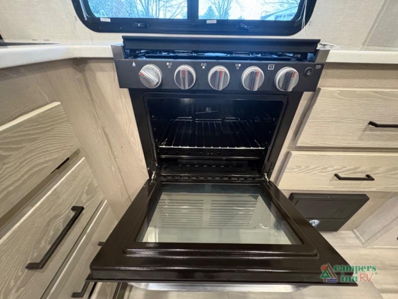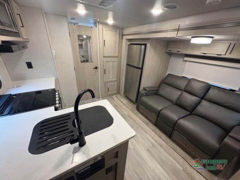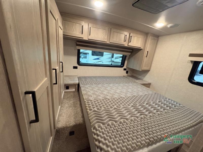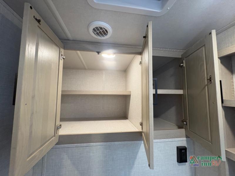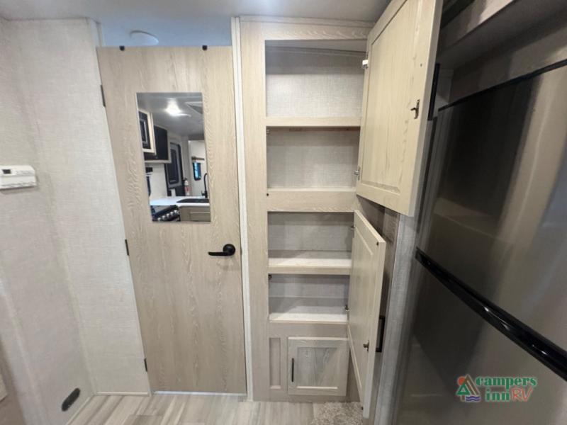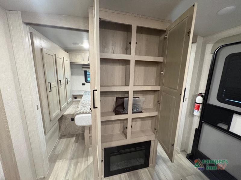 This is the perfect travel trailer for two people looking for comfortable camping trips! You will have your own RV queen bed to sleep on in the front private bedroom, and an optional TV can be added if you enjoy the morning news in bed. Breakfast can be made on the three burner cooktop, or head outdoors to cook on the outside kitchen. The theater seating with a table will provide a place to relax and dine together, and the spacious full rear bath will allow you to clean up before you head out for the day. This model includes plenty of storage space, including two pantries, a wardrobe slide out in the bedroom, plus a drop-frame pass-through storage for larger camp gear!