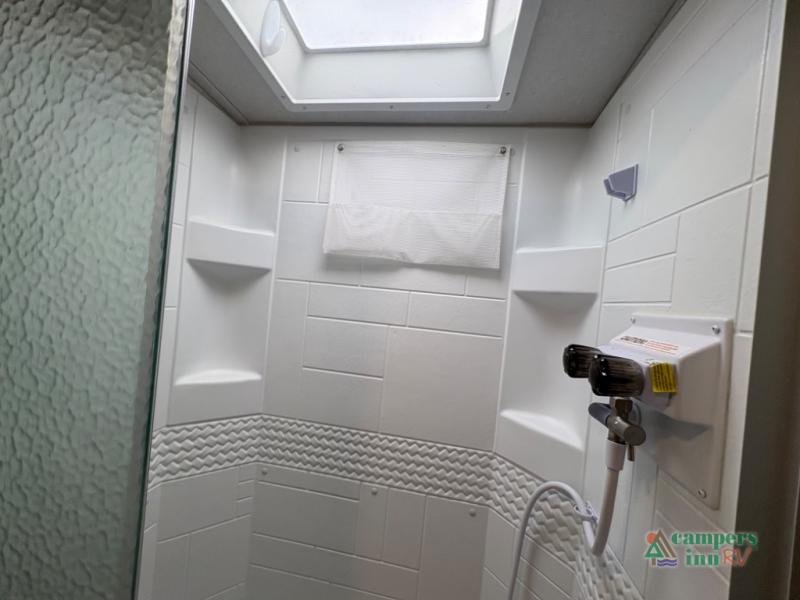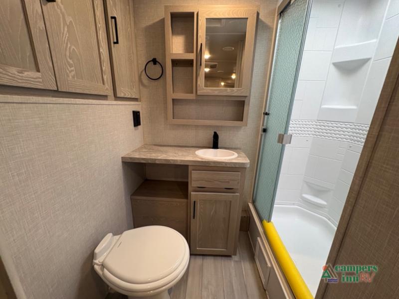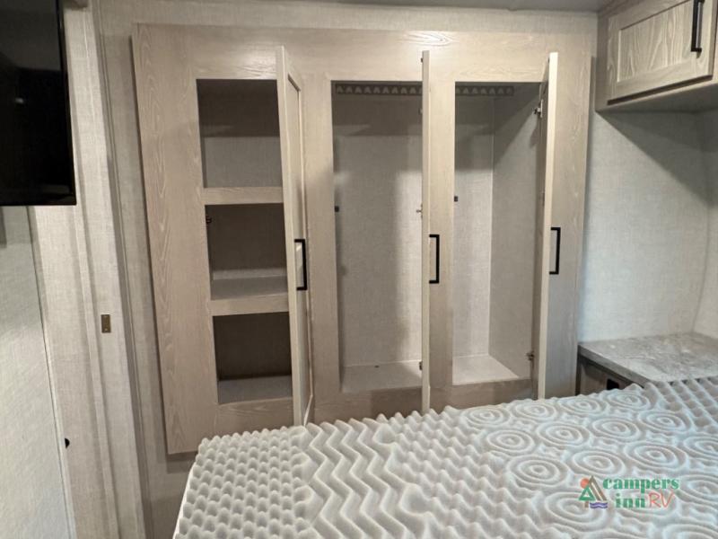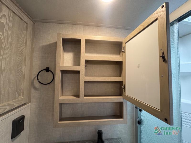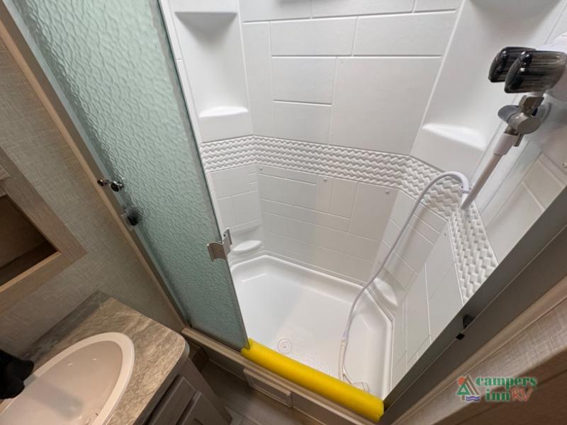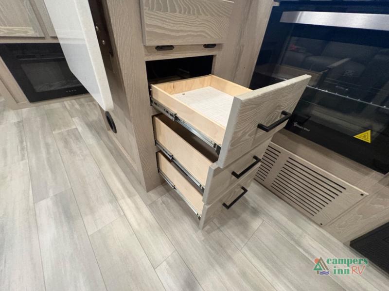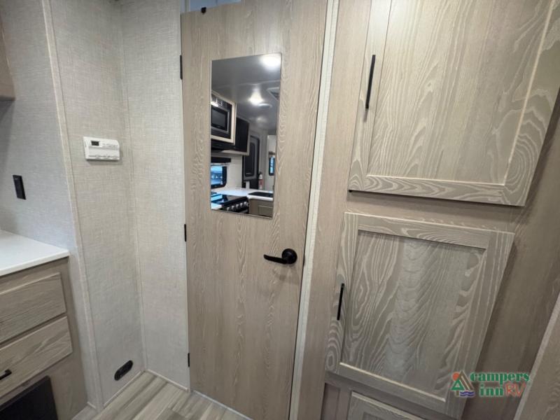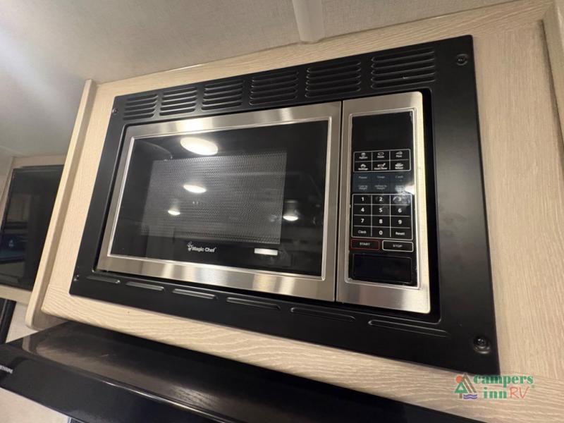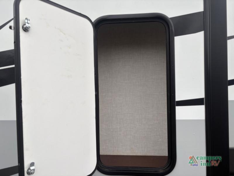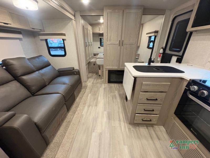This is the perfect travel trailer for two people looking for comfortable camping trips! You will have your own RV queen bed to sleep on in the front private bedroom, and an optional TV can be added if you enjoy the morning news in bed. Breakfast can be made on the three burner cooktop, or head outdoors to cook on the outside kitchen. The theater seating with a table will provide a place to relax and dine together, and the spacious full rear bath will allow you to clean up before you head out for the day. This model includes plenty of storage space, including two pantries, a wardrobe slide out in the bedroom, plus a drop-frame pass-through storage for larger camp gear!