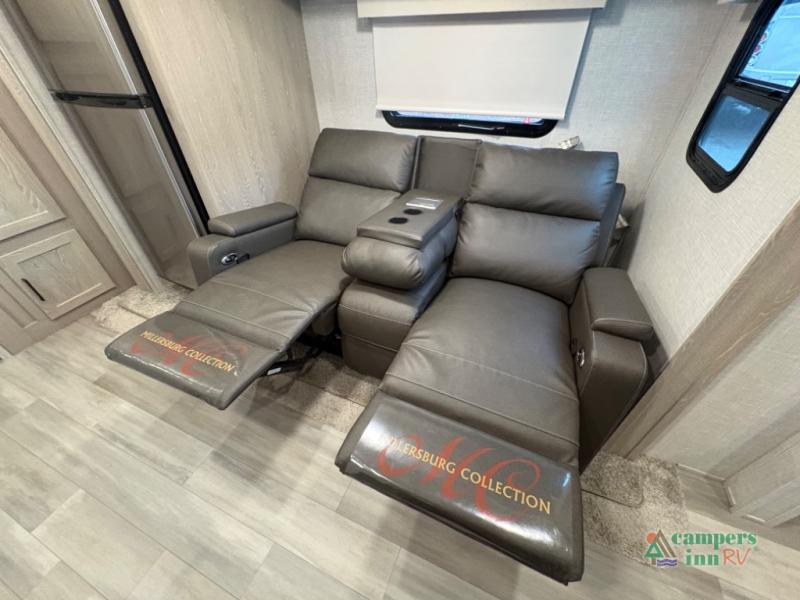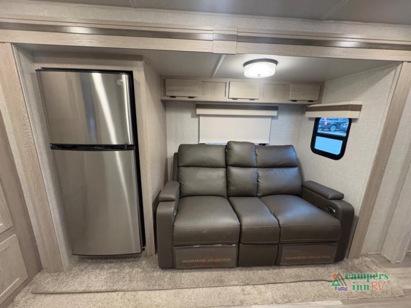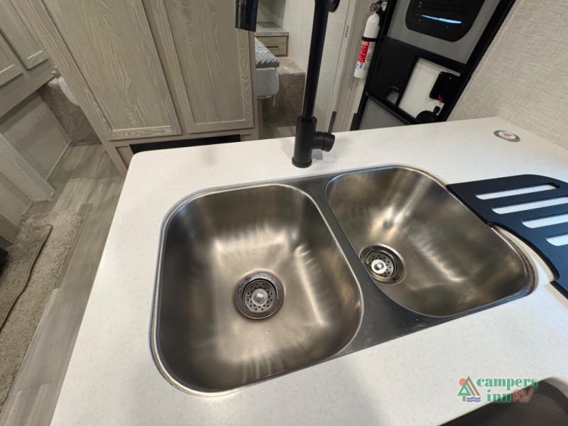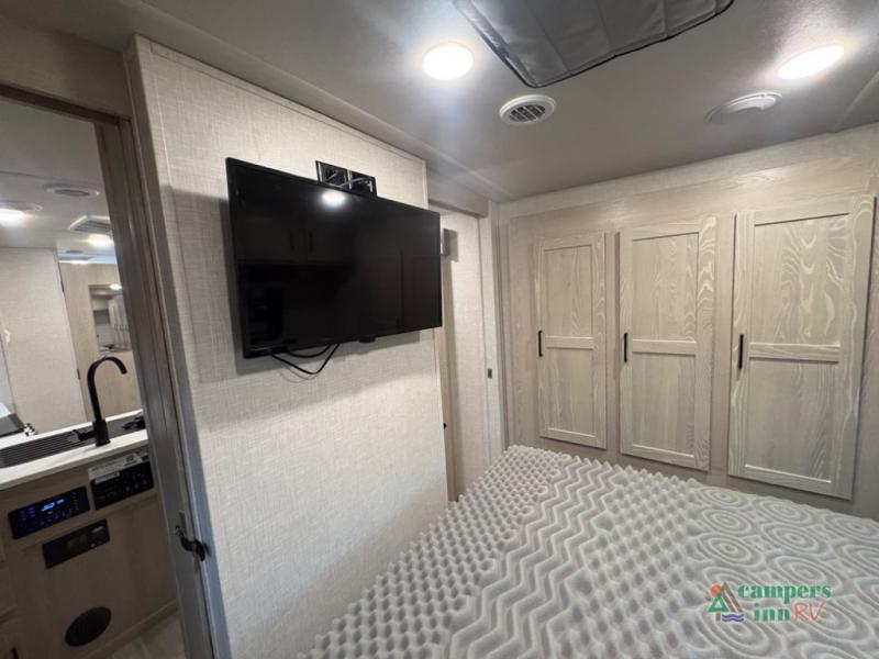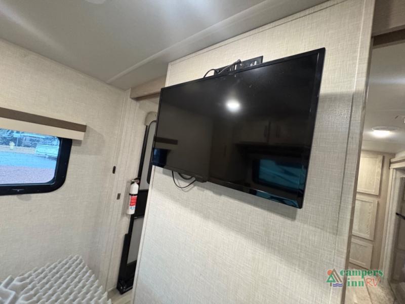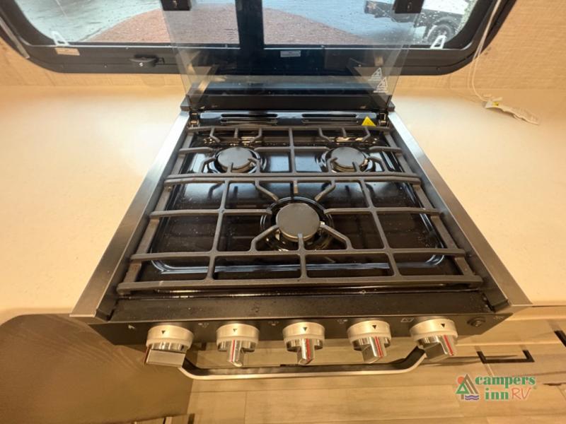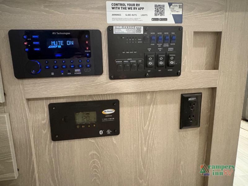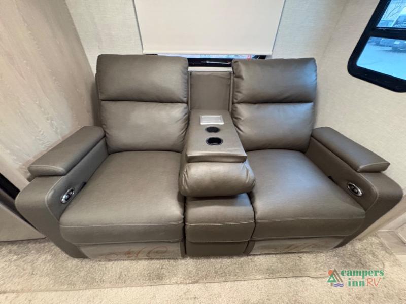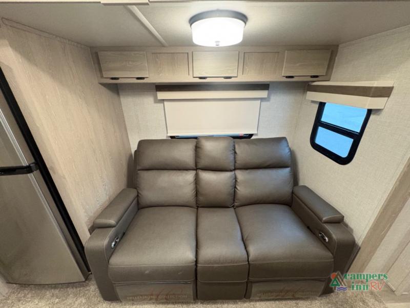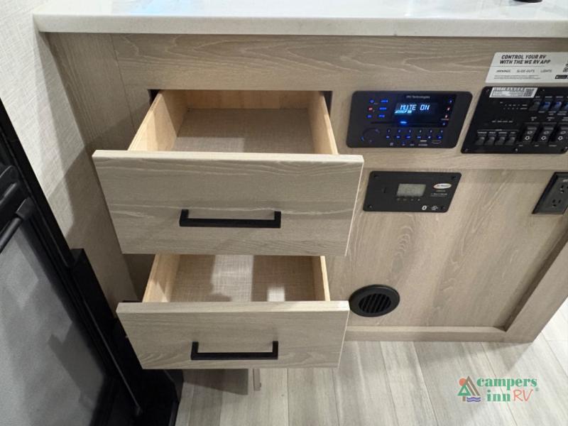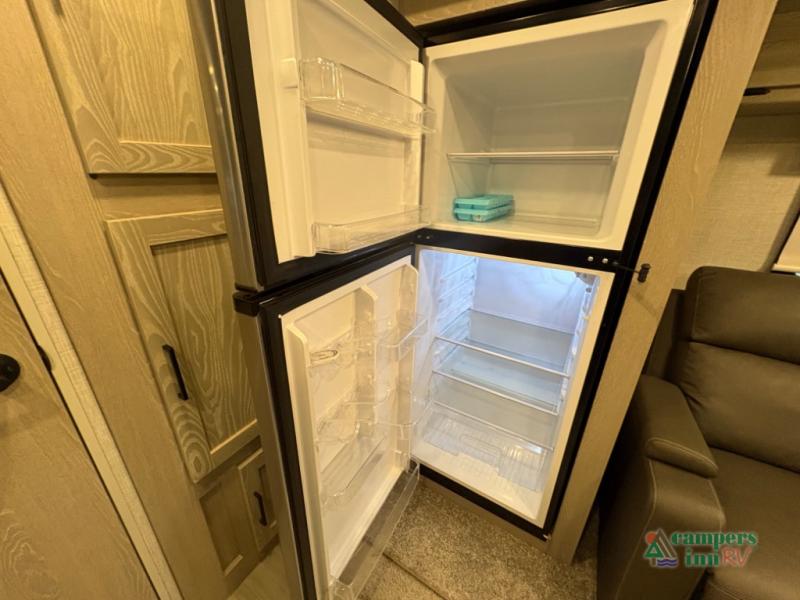 This is the perfect travel trailer for two people looking for comfortable camping trips! You will have your own RV queen bed to sleep on in the front private bedroom, and an optional TV can be added if you enjoy the morning news in bed. Breakfast can be made on the three burner cooktop, or head outdoors to cook on the outside kitchen. The theater seating with a table will provide a place to relax and dine together, and the spacious full rear bath will allow you to clean up before you head out for the day. This model includes plenty of storage space, including two pantries, a wardrobe slide out in the bedroom, plus a drop-frame pass-through storage for larger camp gear!