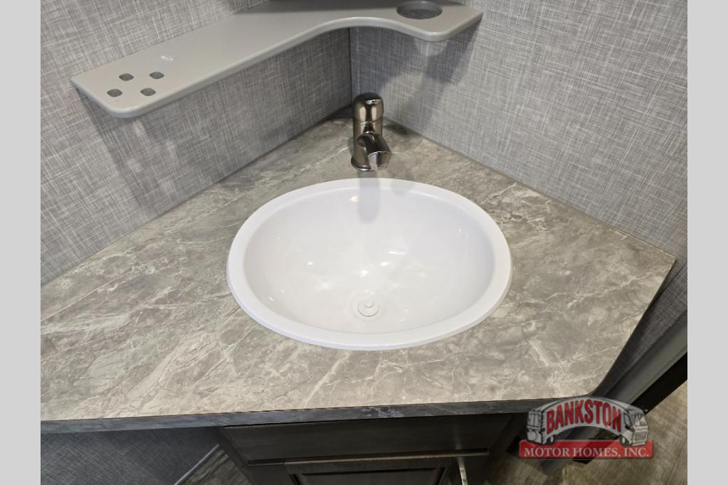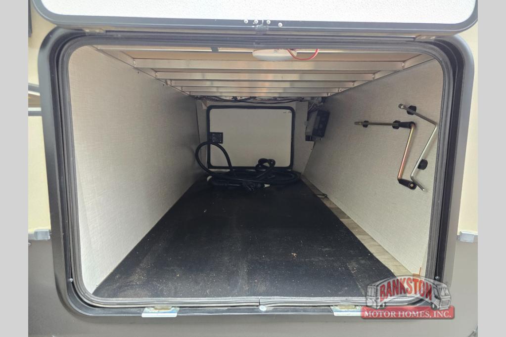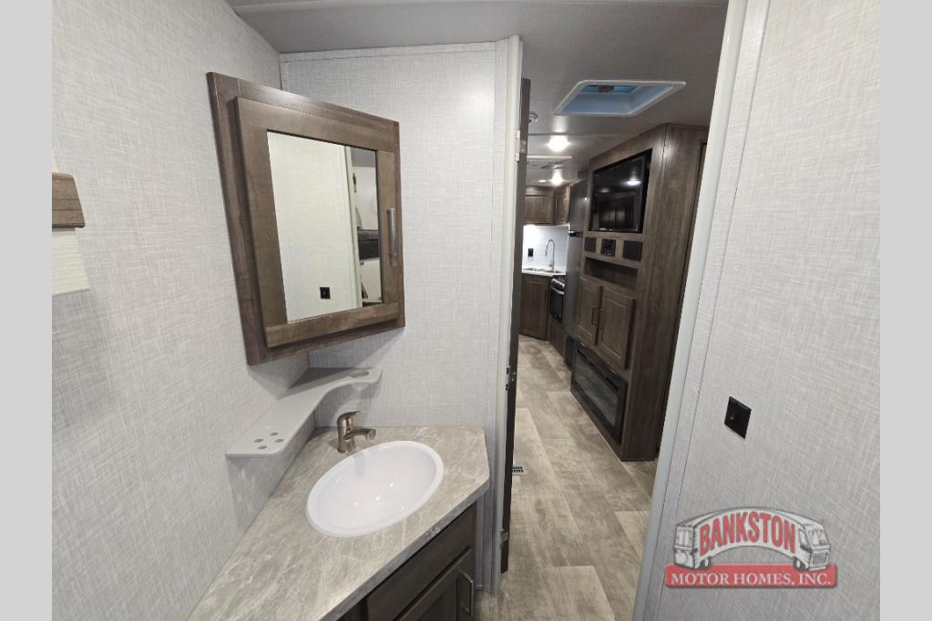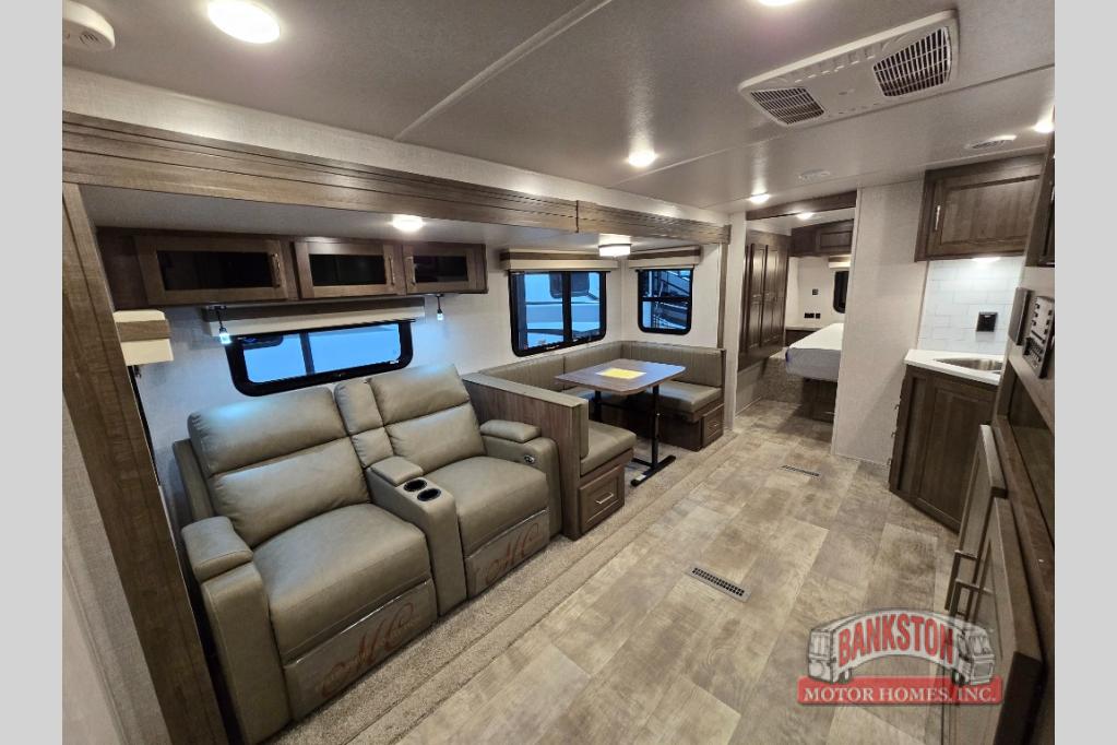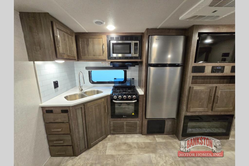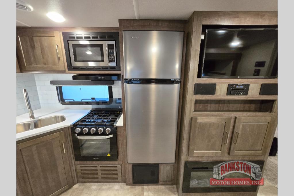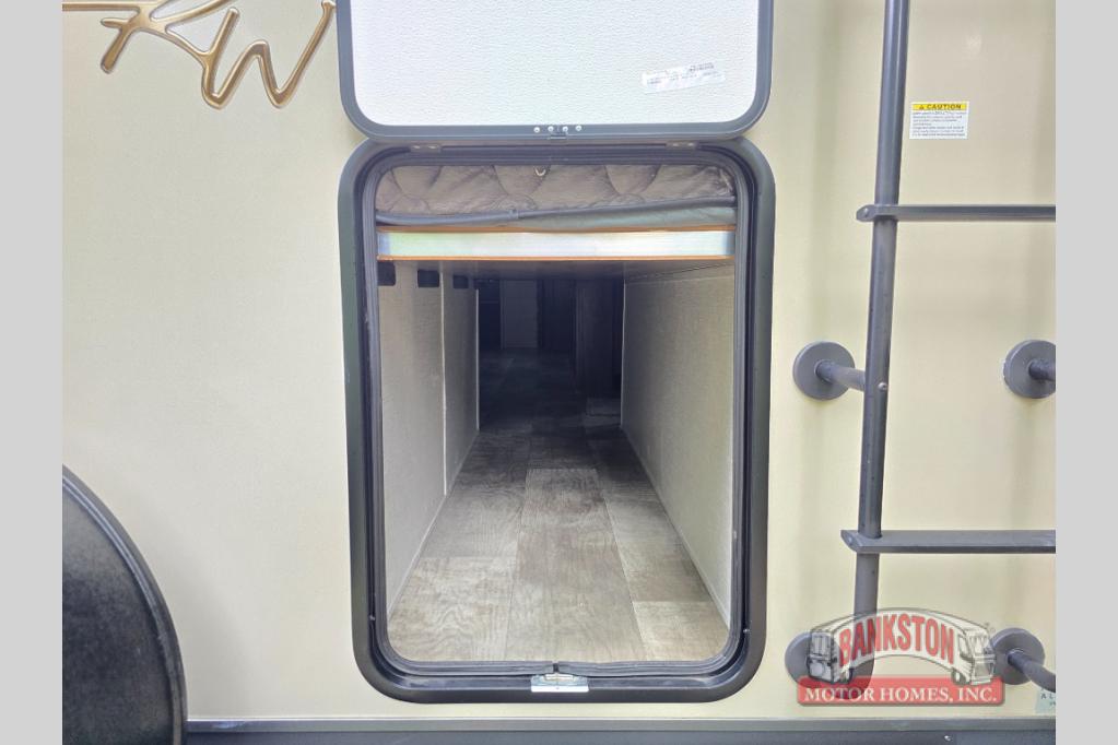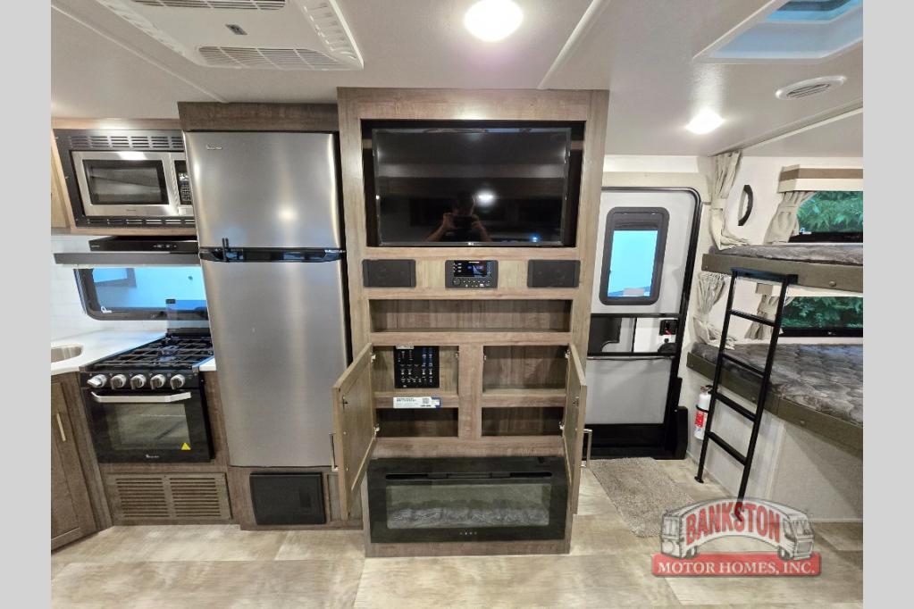 Looking for a trailer that sleeps eight, allows you to cook indoors or outdoors, and offers dual entry for convenience when you travel with a bigger group? This trailer provides for those wants and needs, and offers even more! The outside camp kitchen gives you more choices when feeding the masses along with the outside griddle, and the interior kitchen includes an L-shaped area for the cook to have their own space with full amenities including a counter extension and a walk-in pantry to bring along everything they need. The full bathroom will keep everyone refreshed, and the theater seating along with the U-shaped dinette offer seating inside to enjoy the LED TV and fireplace. There is plenty of storage found throughout the interior, and along the exterior you will find several places to stow your outdoor items including in the drop frame storage.