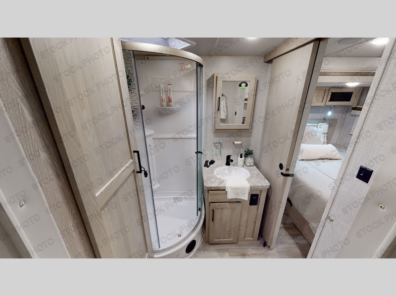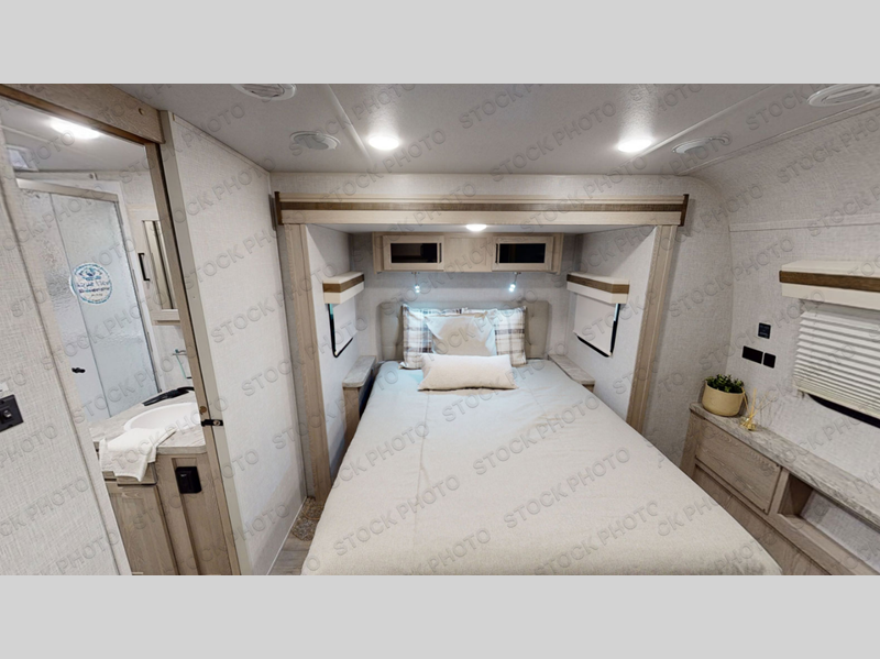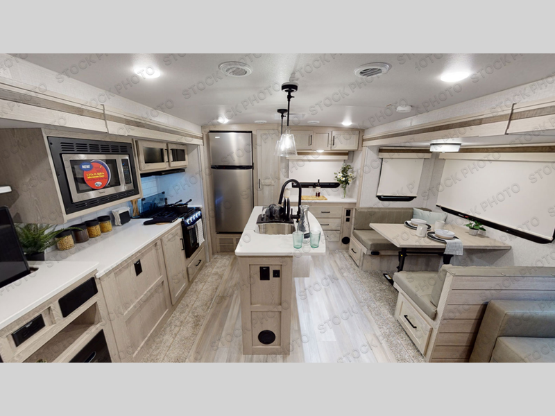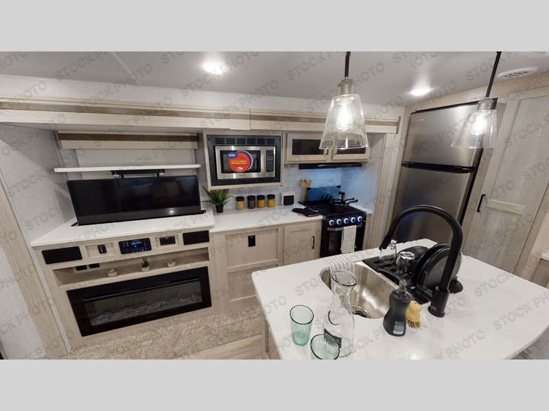 Hike the trails, fish the lake, and relax indoors after the cook whips up a meal with full amenities in the rear kitchen which also includes extra counter space that can be utilizes as a desk as well, and a center island that provides more prep and serving surface, and a place to dry the dishes. The 44" booth dinette allows you to eat your meals together and watch the LED TV with fireplace below. The theater seating is another comfortable place to relax, and the double entry bathroom is convenient especially at night. And the cook will love having an outside kitchen with a burner top and refrigerator, plus there is an outside griddle.