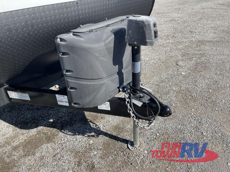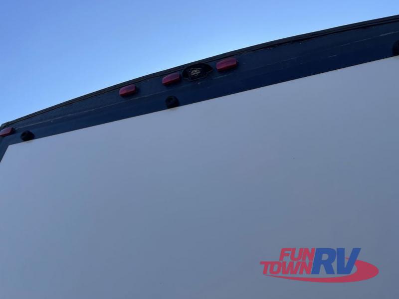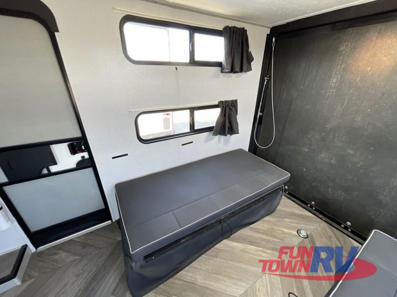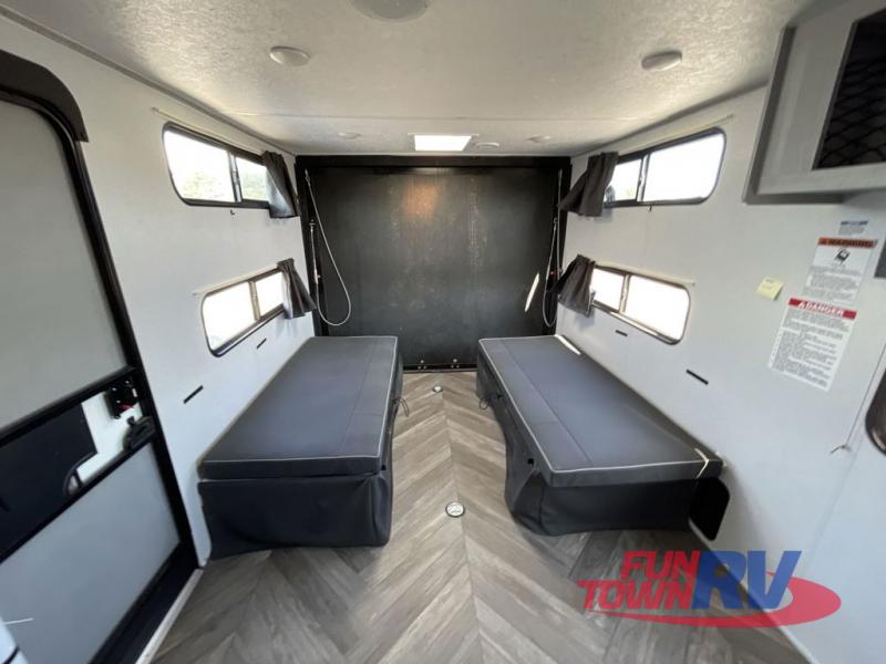 This toy hauler has everything you need for a fun camping trip with the whole family! Easily load and unload your toys with the 90" x 75" 3,000 lb. ramp door into the 11' 3" garage area and secure them with the 1,500 lb. tie downs. Once you have arrived, you can set up the opposing 30" x 72" sofa sleepers with a table in between or if you added the optional stow n load quad bunk system then you can set that up. One of the dual entry doors leads directly into the front living area where you will find a sofa with storage access that converts into a 60" x 74" Murphy bed to sleep on at night. The U-shaped dinette slide can also transform into an extra sleeping space. Everyone can freshen up in the walk-through bathroom with the 36" x 24" shower with a skylight above for added natural lighting!