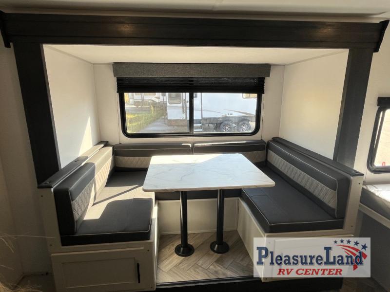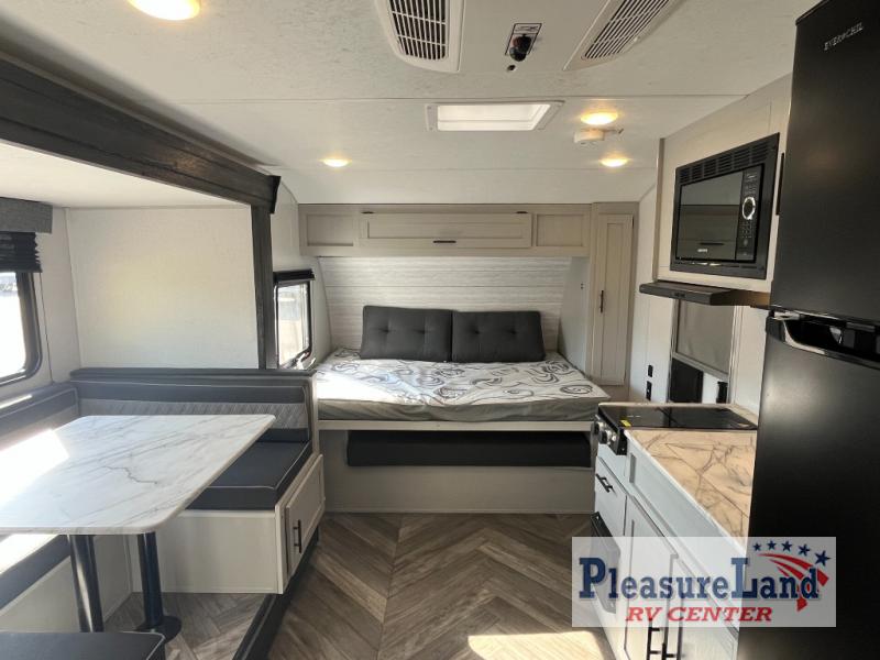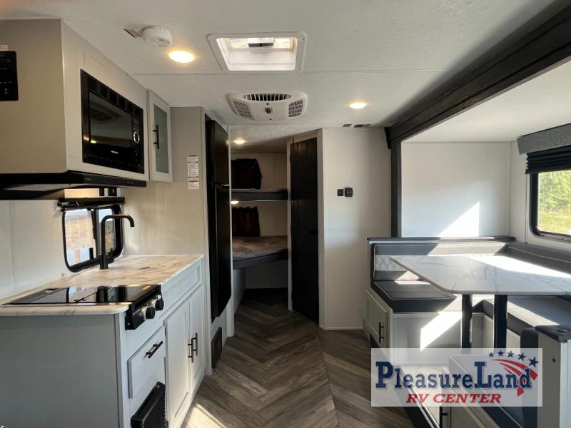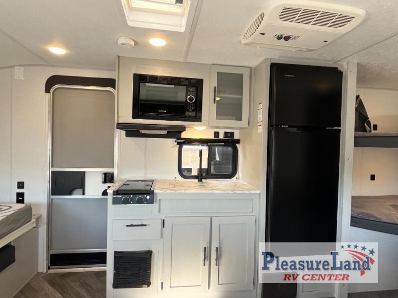 Start camping the right way in this travel trailer! It features a front Murphy bed that has a 60" x 74" queen bed to sleep on and a sofa with storage access to sit on during the day. The corner set of 48" x 72" double bunk beds come with storage to keep things out of the way and are conveniently next to the rear corner bathroom which has a 36" x 24" shower to freshen up in each morning. You can prepare your best home cooked meals indoors with the two burner cooktop or head to the outside LP griddle to fry up some burgers while breathing in some fresh air. Enjoy your meals, play card games, and even sleep at the U-shaped dinette slide. You will also appreciate the outside shower and the exterior front oversized door for storage access.