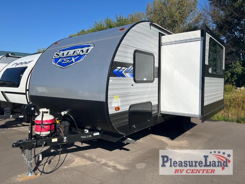 Each one of these Forest River Salem FSX travel trailer and travel trailer toy haulers are fully featured, light weight, and easy to tow making them perfect for a first time or seasoned camper! They are built with a SuperFlex one piece roof, a powder coated I-beam frame, and an aerodynamic front radius profile for better wind resistance. With the largest in class opening panoramic windows, you will have a great view of your beautiful surroundings and enjoy fresh breezes of air throughout. A diamond plate front rock guard will protect your unit from road debris and the Tuffcoat scratch resistant exterior paint helps to keep any dings or bumps from scratching it. The Best-In-Class package comes with an AccessiBelly enclosed underbelly to keep your units vitals safe through every season, a XL folding grab assist handle to safely enter and exit, and an upgraded appliance package to prepare your best meals. Come find the model that best fits your needs today!