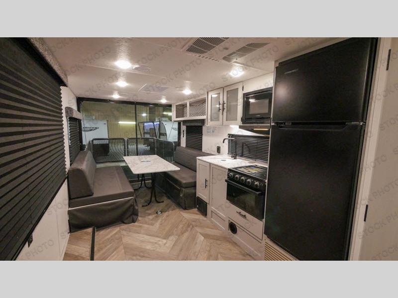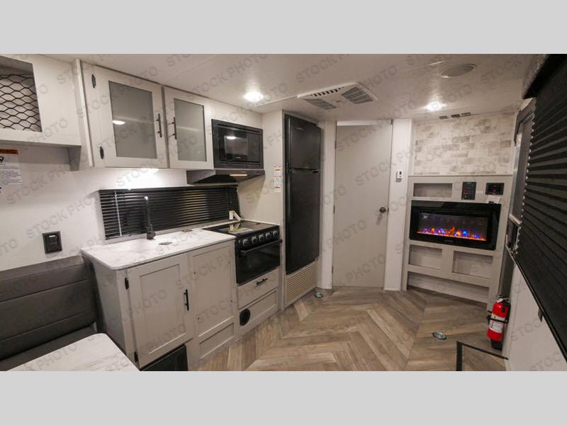 Step inside and unwind in a cozy, thoughtfully designed interior. The private front queen bed ensures restful nights, while the residential-style kitchen makes meal prep easy. A microwave, cooktop, refrigerator, and deep stainless-steel sink give you everything you need to stay fueled for the road ahead.
