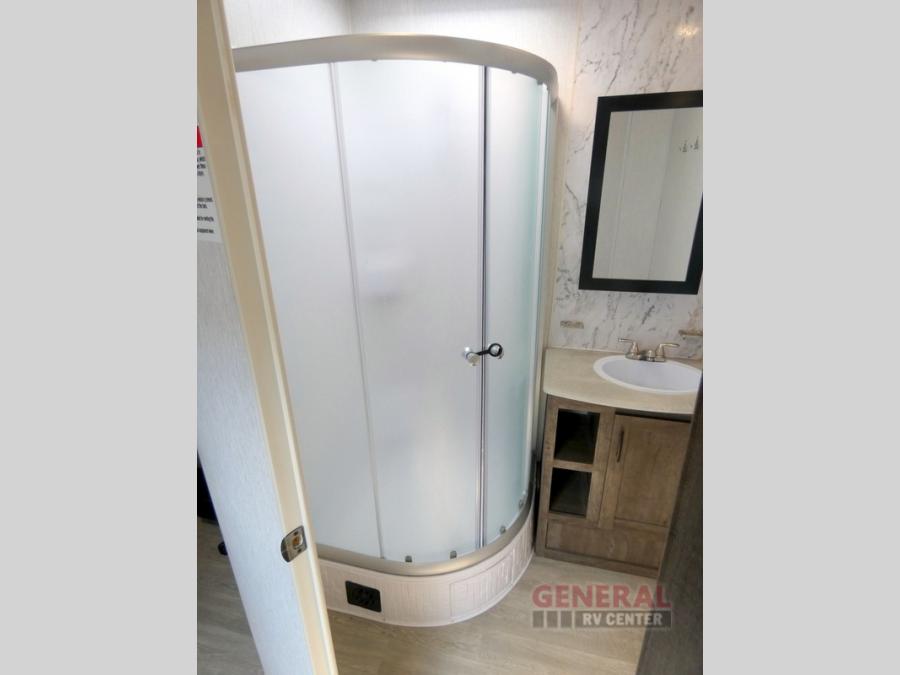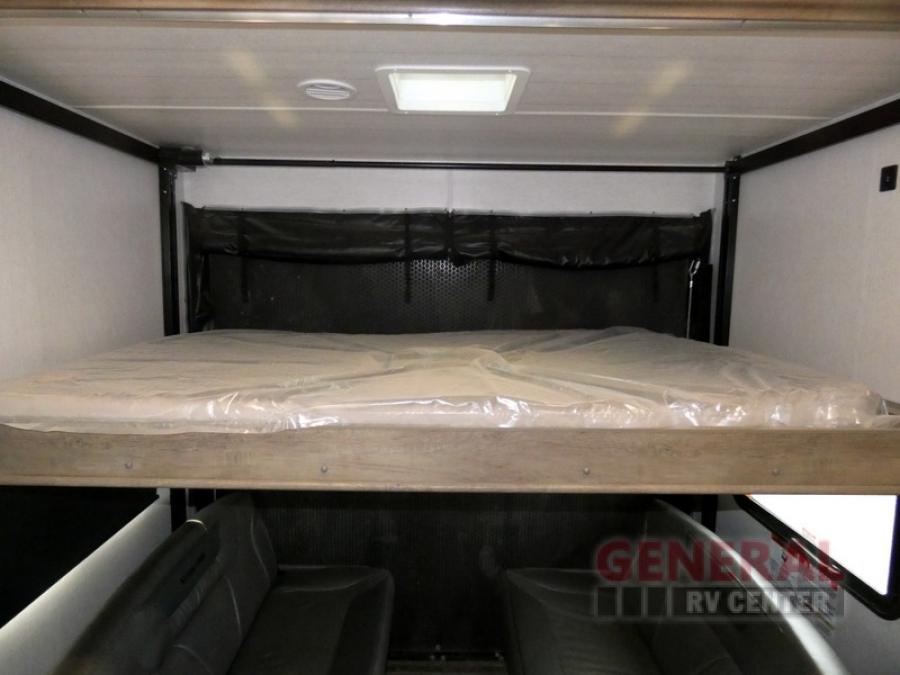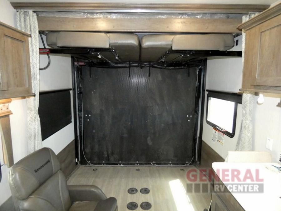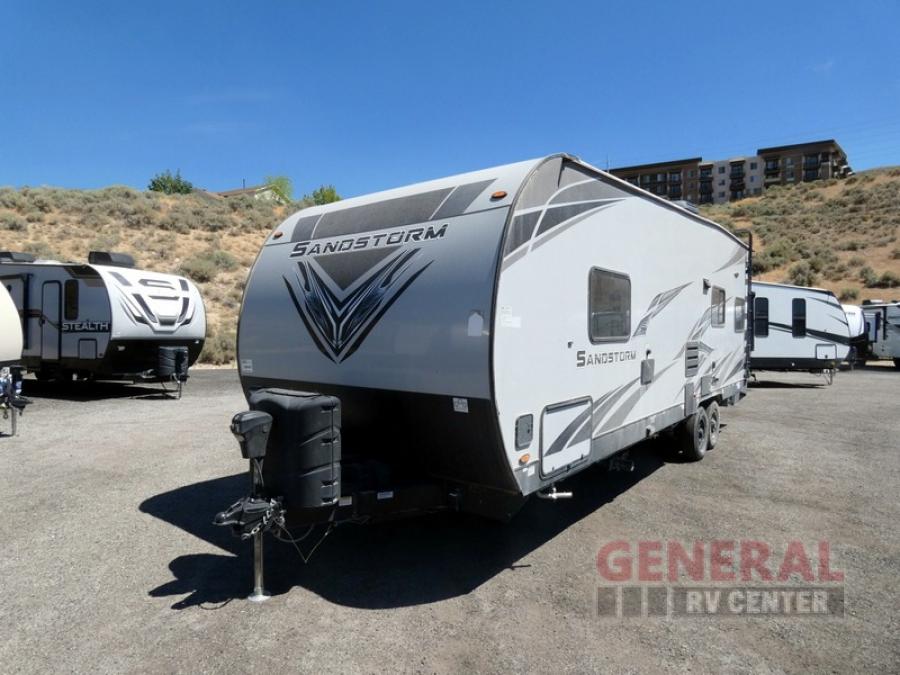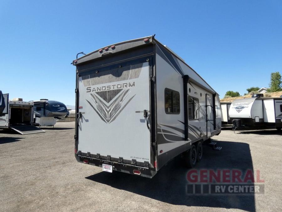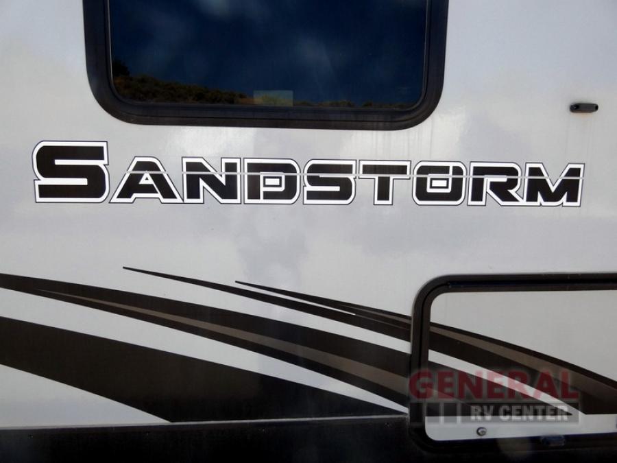 Each Sandstorm toy hauler fifth wheel and travel trailer by Forest River features a 102" wide-body construction to bring along four-wheelers, dirt bikes, or kayaks! You will find convenient amenities, such as 220 watts of solar power and a regulator with power boost, a 35 gallon fuel station, an outside shower to wash off your gear, and more. There is also a power awning with LED lights outdoors to create an outdoor living space, plus heated and enclosed tanks to camp all year long. The interior includes LED accent lighting, black night shades throughout, and a glass shower to name a few comforts.