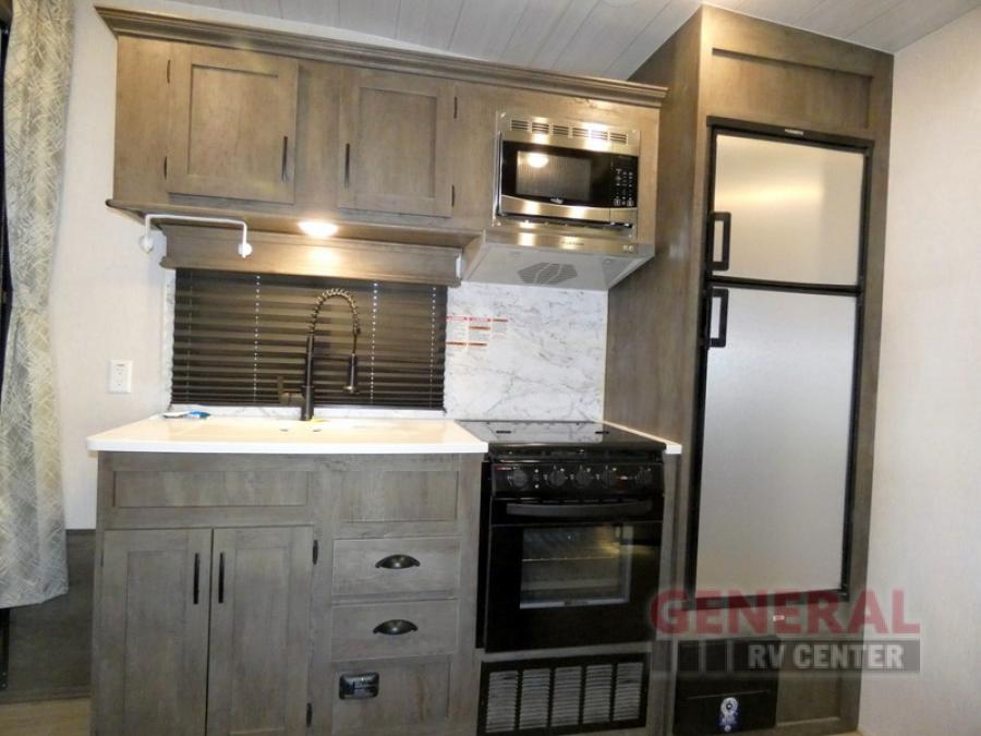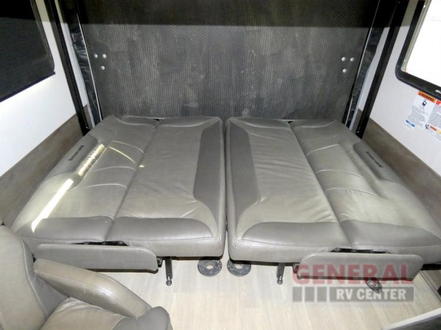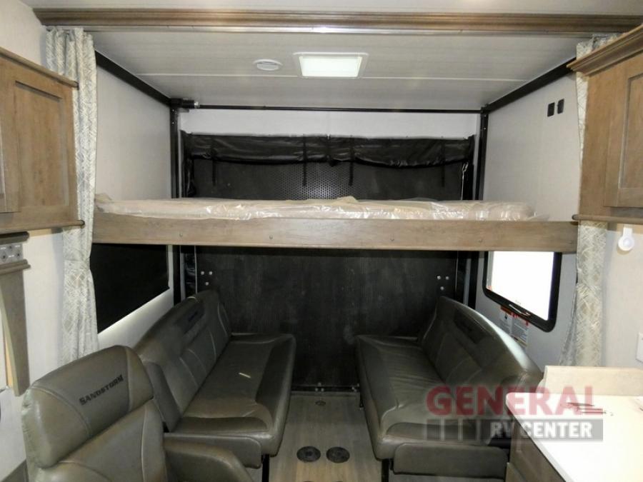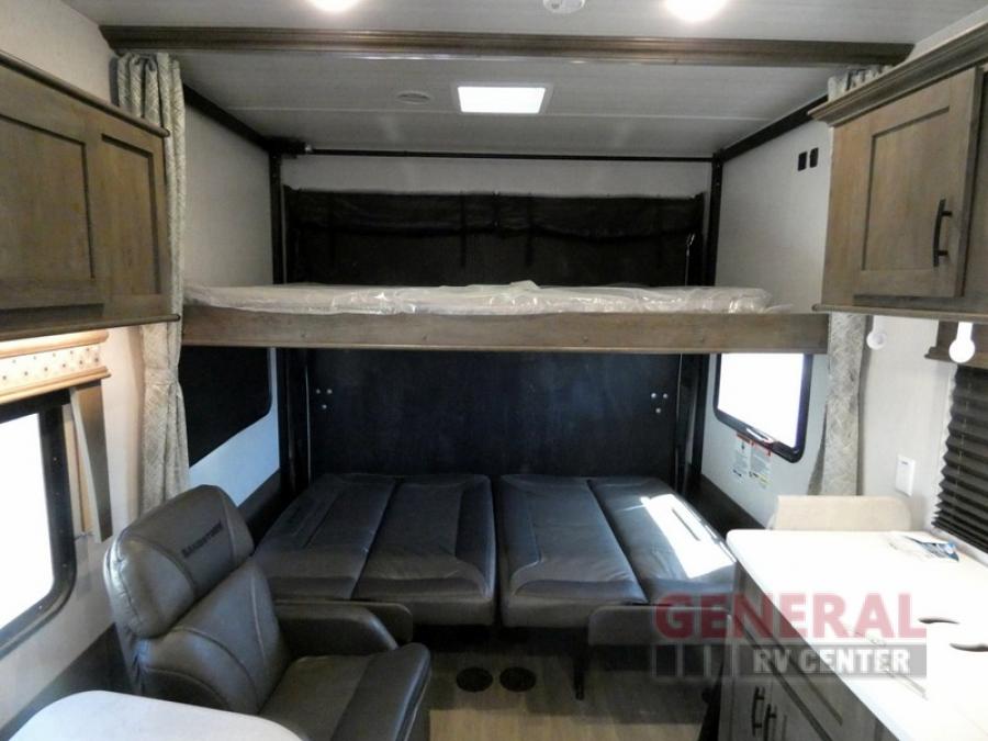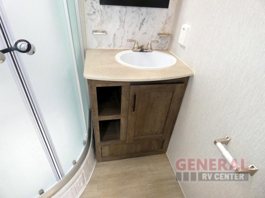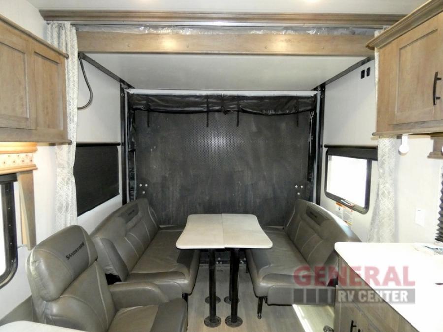Each Sandstorm toy hauler fifth wheel and travel trailer by Forest River features a 102" wide-body construction to bring along four-wheelers, dirt bikes, or kayaks! You will find convenient amenities, such as 220 watts of solar power and a regulator with power boost, a 35 gallon fuel station, an outside shower to wash off your gear, and more. There is also a power awning with LED lights outdoors to create an outdoor living space, plus heated and enclosed tanks to camp all year long. The interior includes LED accent lighting, black night shades throughout, and a glass shower to name a few comforts.