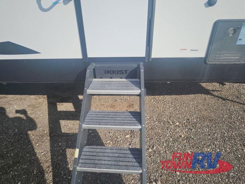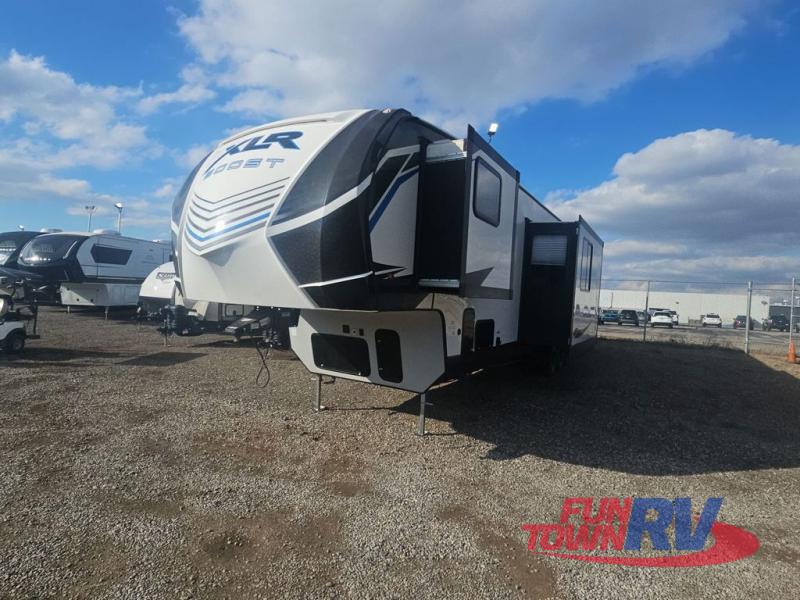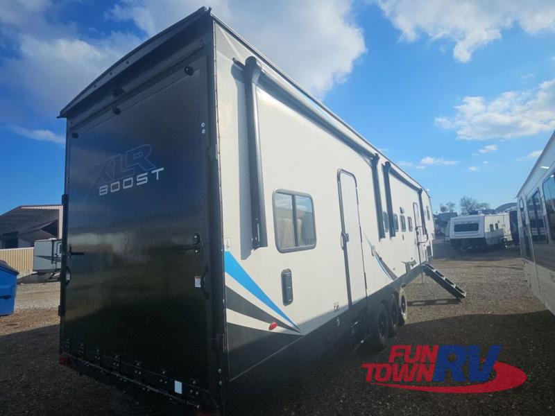 Boost into action camping with one of these Forest River XLR Boost fifth wheel toy haulers or travel trailer toy haulers! The 102" wide body not only provides ample walking around space, but also packs in all of the luxurious features to make your trips great. A seamless PVC roof system prevents water from leaking inside, and the moisture barrier floor enclosure and the oil and gas resistant residential linoleum throughout keeps your unit from falling apart. You can easily load and unload your toys with the laminated aluminum framed weather proof ramp door. Keep the dirt outside where it belongs with the outside hot/cold shower box and enjoy the perfect view of your beautiful surroundings even indoors through the large panoramic windows. Come find the model that best fits your needs today!