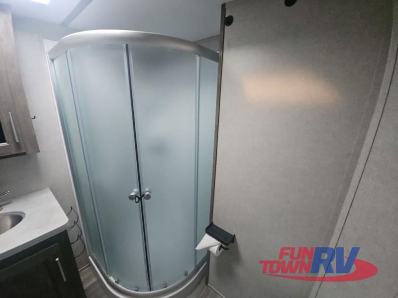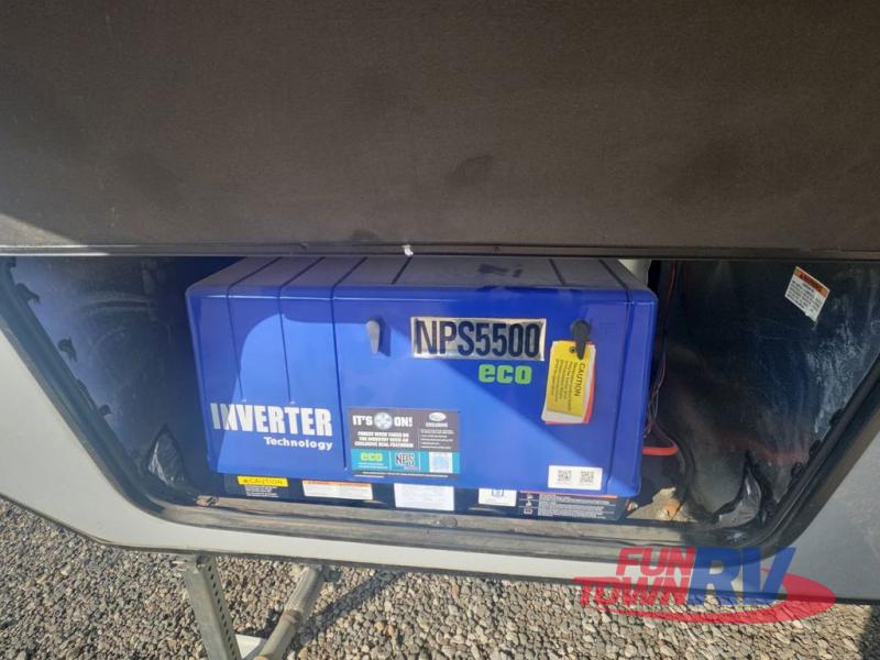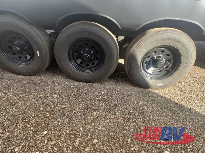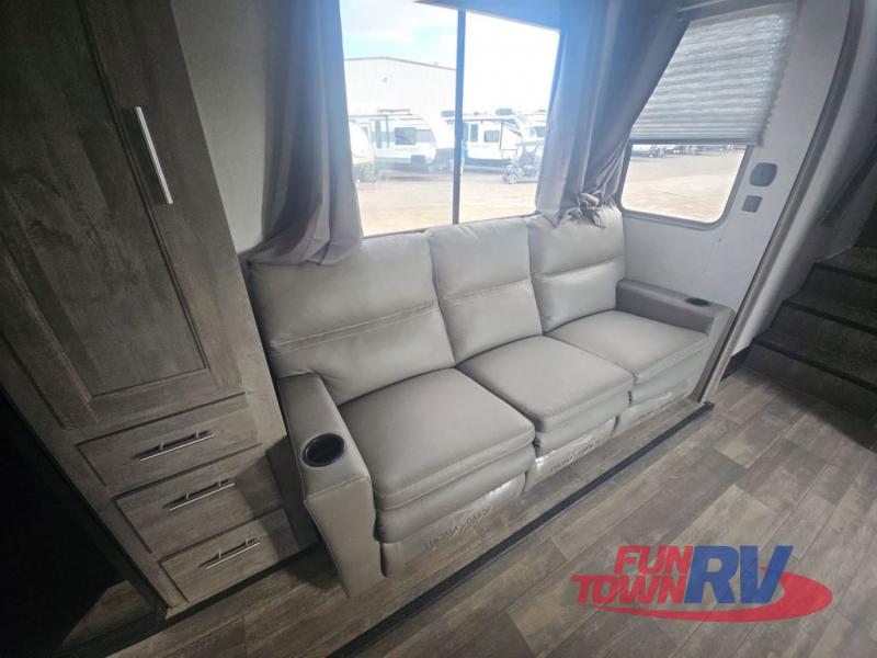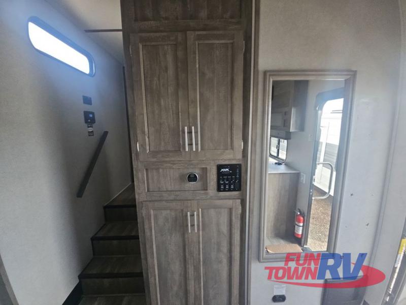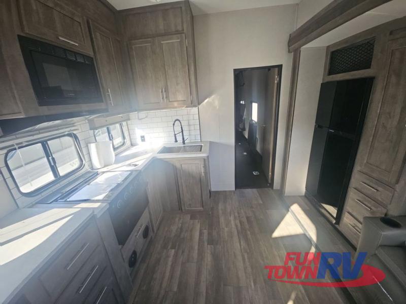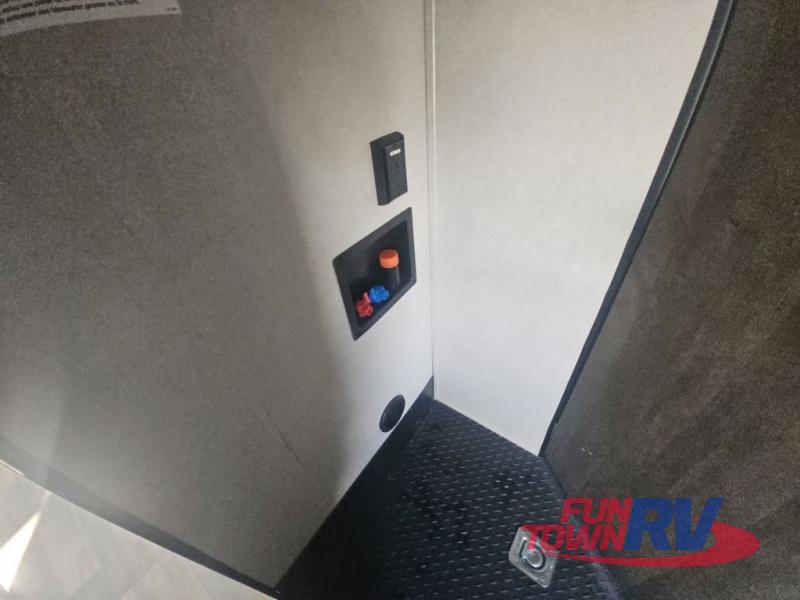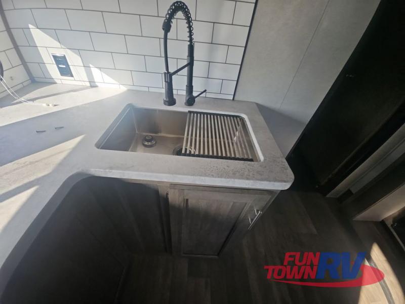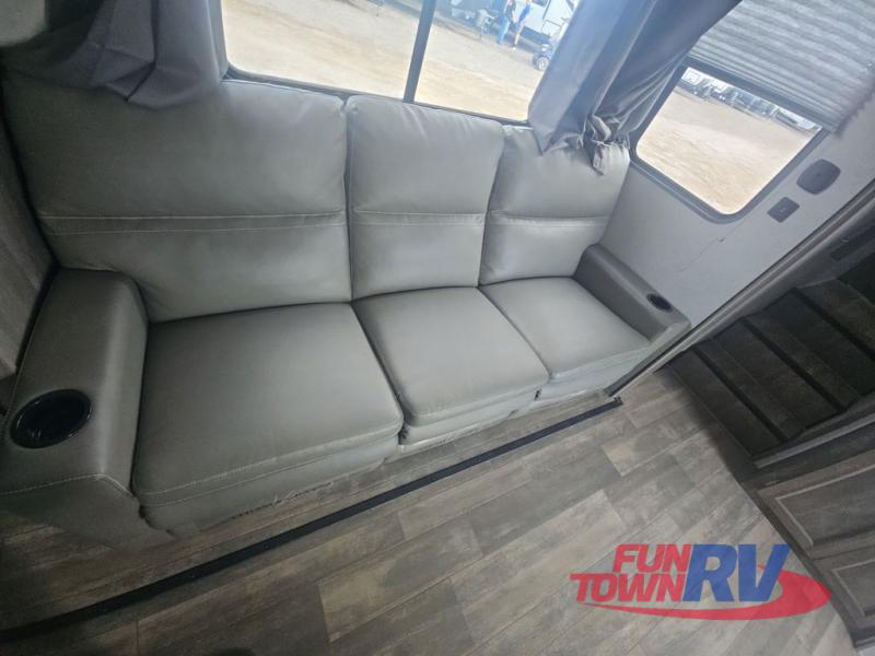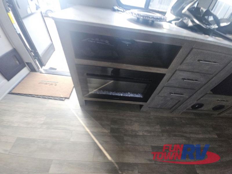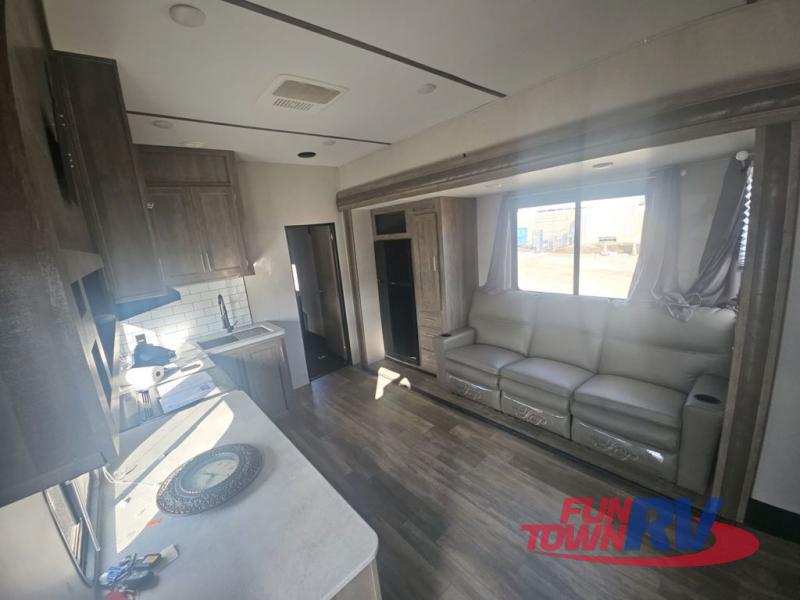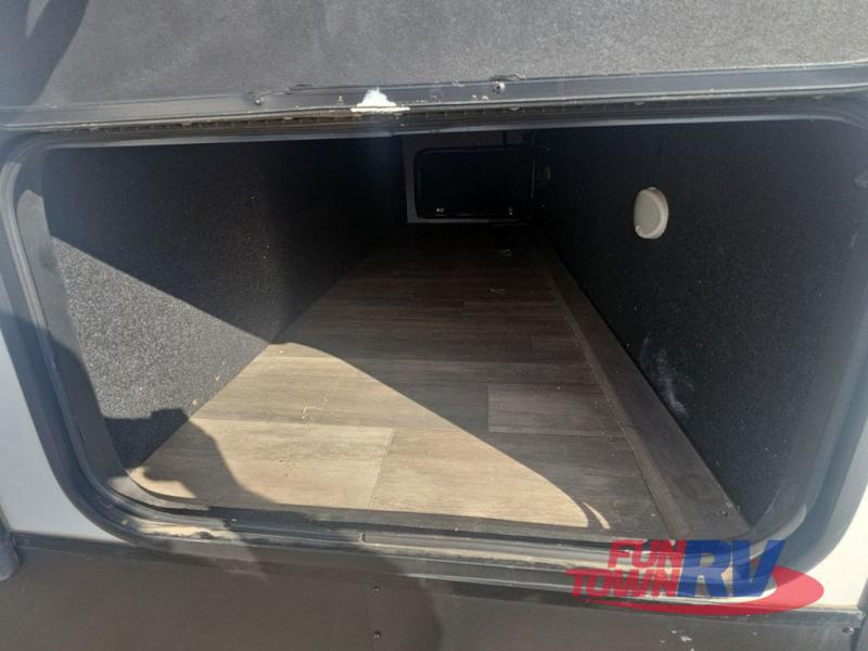 Pack your bags and load up your favorite toys into the 16' garage area of this toy hauler! Once you have arrived, you can set up the Sit N Sleep with quick release sofas that have a table in between and a Sleep N Store manual bed system above them, plus there is a half bathroom, one of the dual entry doors to the unit, and a patio deck. Get a good night's rest each night on the RV king bed in the front private bedroom and rinse the mud out of your hair after each trail ride in the dual entry bathroom with the radius shower that has a skylight above for more headroom and natural lighting. The fully equipped kitchen has everything you need to prepare your best home cooked meals, and you can relax in true comfort on the theater sofa across from the fireplace at the entertainment center with TV prep!