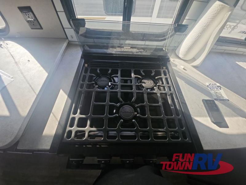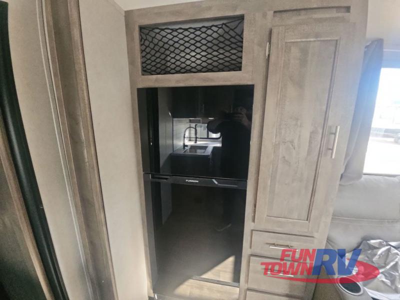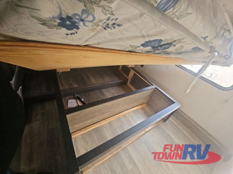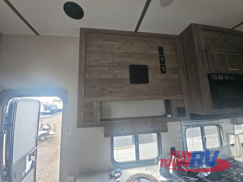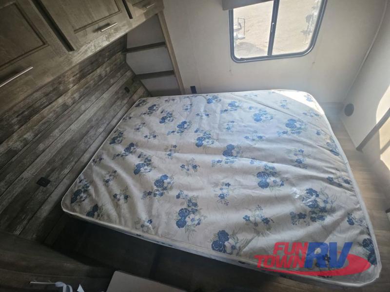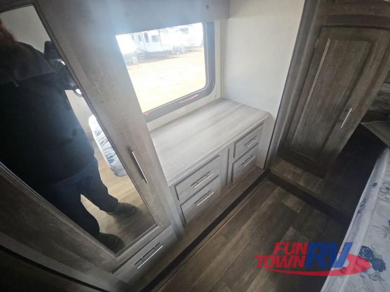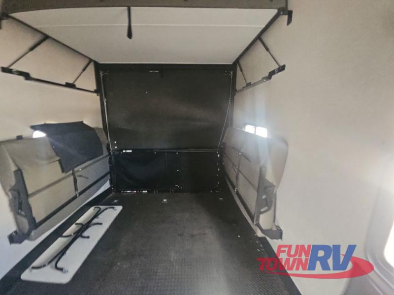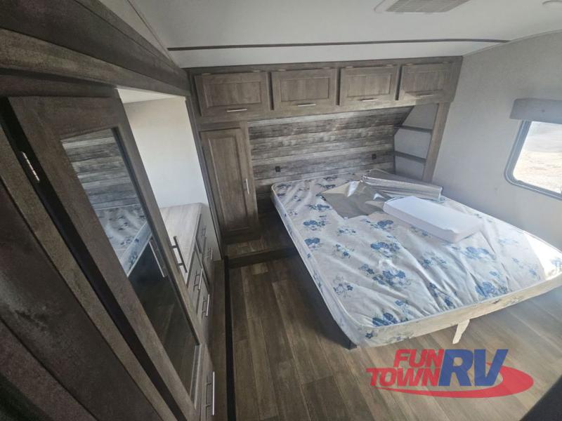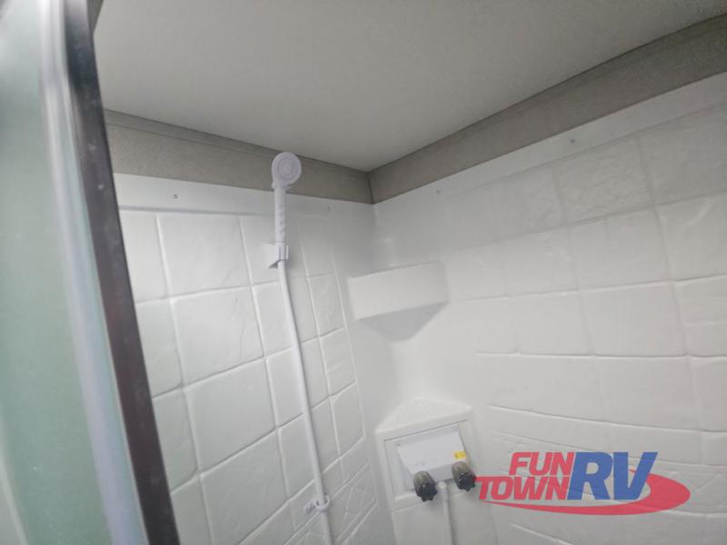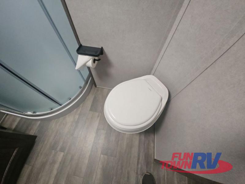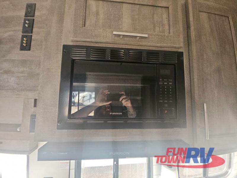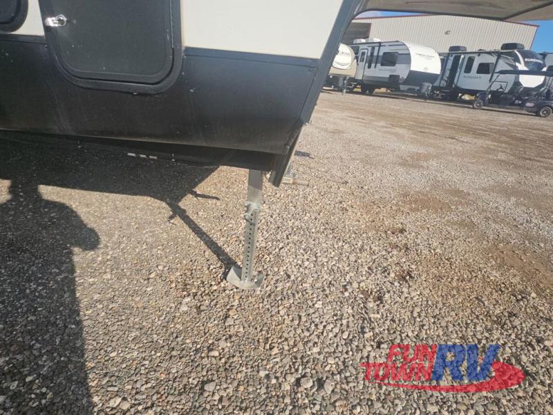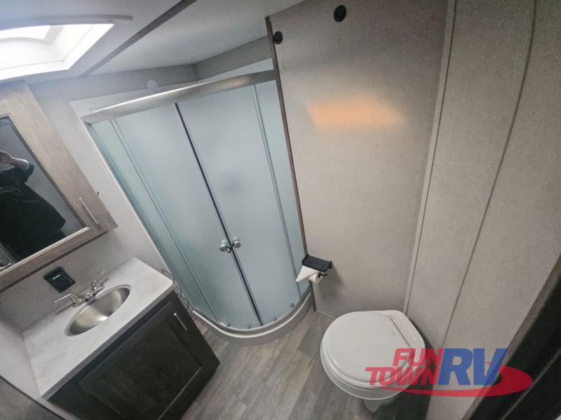 Pack your bags and load up your favorite toys into the 16' garage area of this toy hauler! Once you have arrived, you can set up the Sit N Sleep with quick release sofas that have a table in between and a Sleep N Store manual bed system above them, plus there is a half bathroom, one of the dual entry doors to the unit, and a patio deck. Get a good night's rest each night on the RV king bed in the front private bedroom and rinse the mud out of your hair after each trail ride in the dual entry bathroom with the radius shower that has a skylight above for more headroom and natural lighting. The fully equipped kitchen has everything you need to prepare your best home cooked meals, and you can relax in true comfort on the theater sofa across from the fireplace at the entertainment center with TV prep!