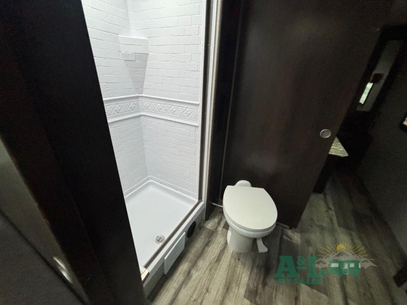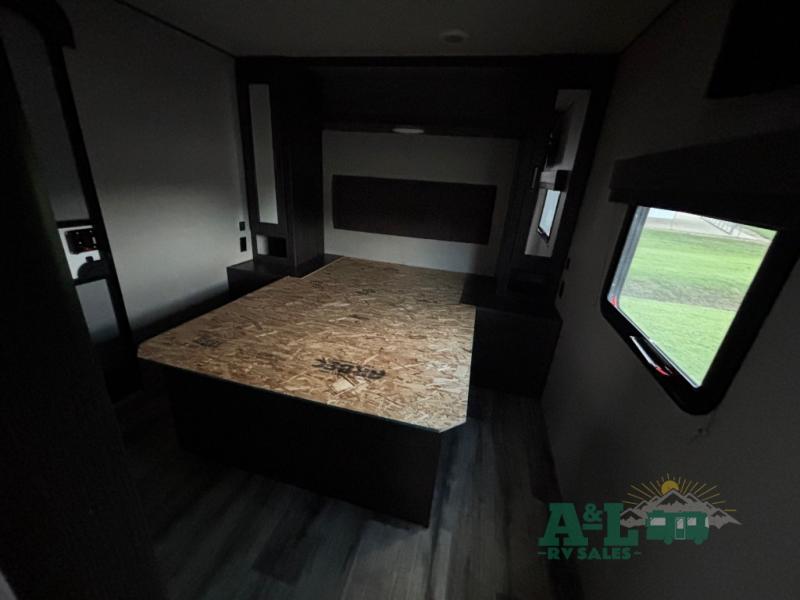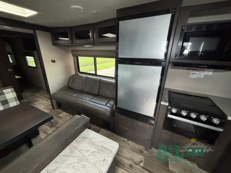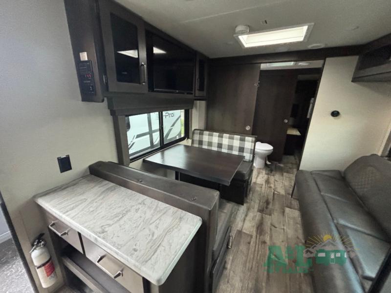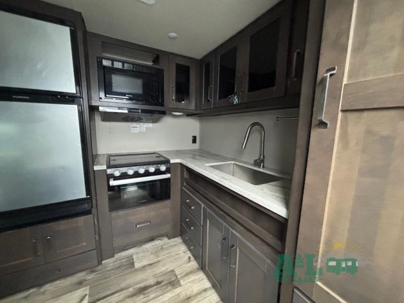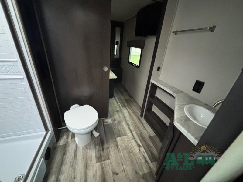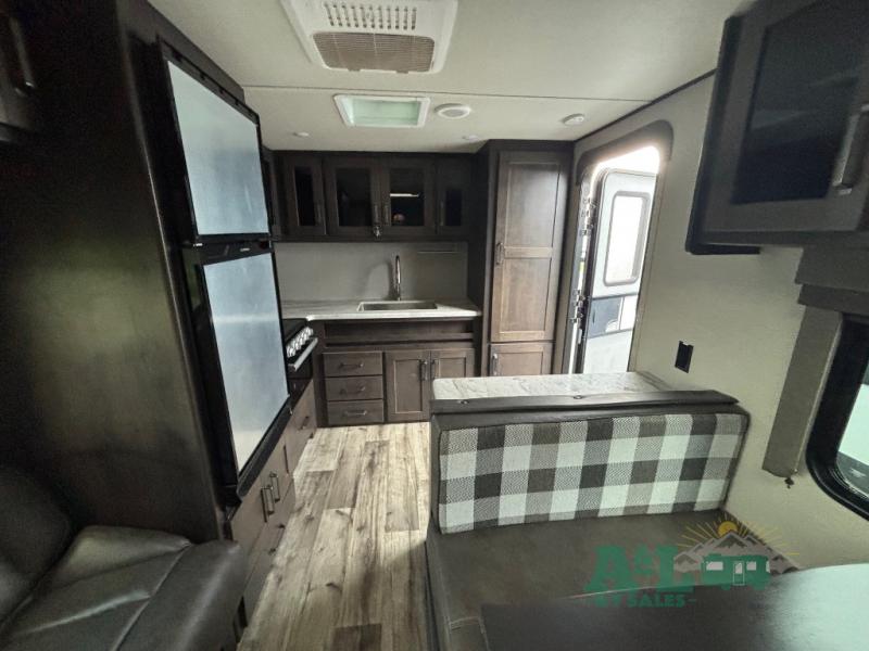 This Transcend Xplor travel trailer is a perfect trailer for couples who are looking to get away with each other! It has a large walk-through bathroom that leads right into the rear private bedroom, so you'll have an easy time getting ready in the morning. The large windows offer great airflow, and the front pass-through storage has plywood backing for different storage options. You can relax on the 69" rollover sofa across from the LED HDTV, and there is also seating at the booth dinette which is directly below the TV. To your left when you enter this trailer, you'll find a countertop with shoe rack, so you can set your wallet and keys down when you come and go.