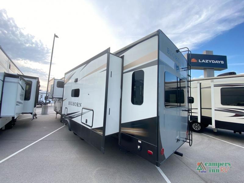 With any Bighorn fifth wheel by Heartland, there is in-house constructed laminated fiberglass sidewalls, double-welded aircraft quality aluminum superstructure cage construction, walkable roof decking with wood roof trusses, a heated and enclosed underbelly plus heated and insulated holding tanks and gate valves for any climate camping, plus color-coded Plumb-PLEX water lines. You can easily setup camp with the 6-point hydraulic landing gear and auto leveling system, and stow away lots of outdoor gear in the Super Store-More 3-sided accessed basement with 30% more storage. There is easy-to-care for vinyl flooring on all main floors and woven flooring on slide floors, a Whisper quiet A/C system with dual high output 15,000 BTU A/C units for maximum comfort, Amish-crafted 100% hardwood cabinetry, fascia and doors with hidden hinges and drawers, in-house milled and finished solid surface countertops throughout the kitchen, plus a "Spa Bath" and more!. And each is pre-wired for satellite systems and wi-fi internet.