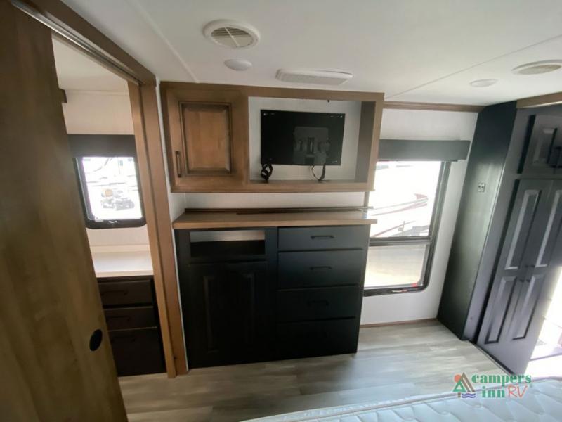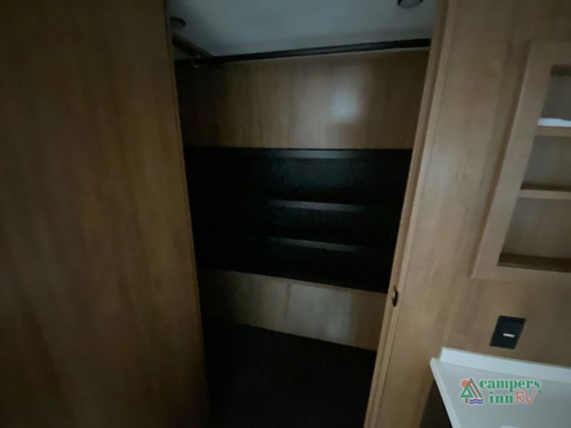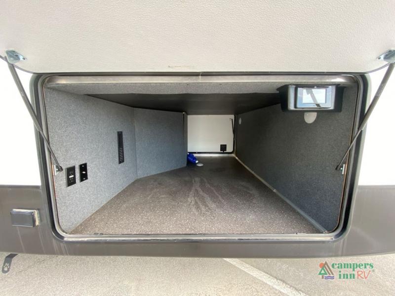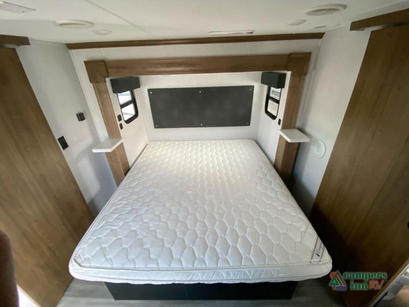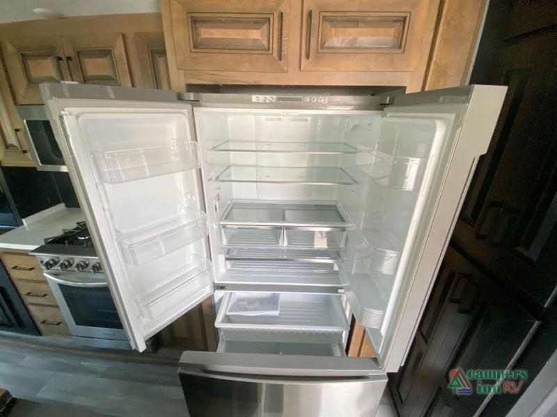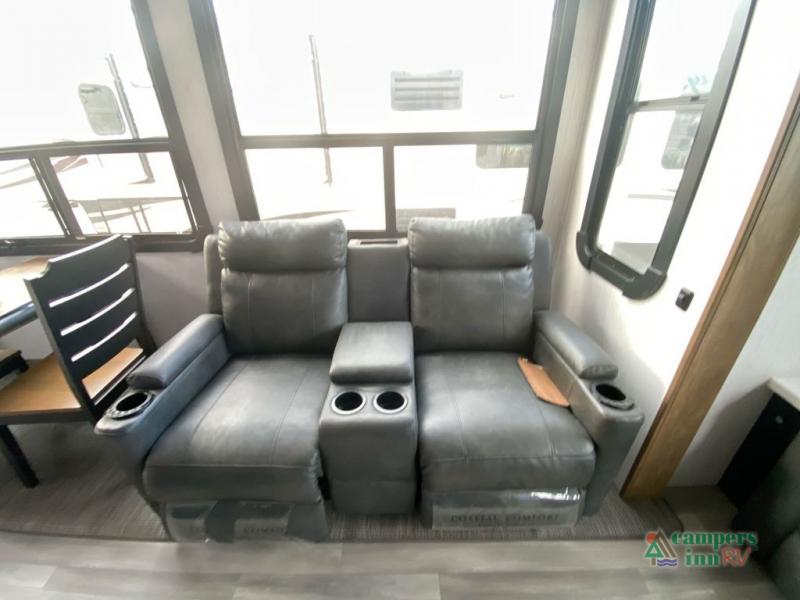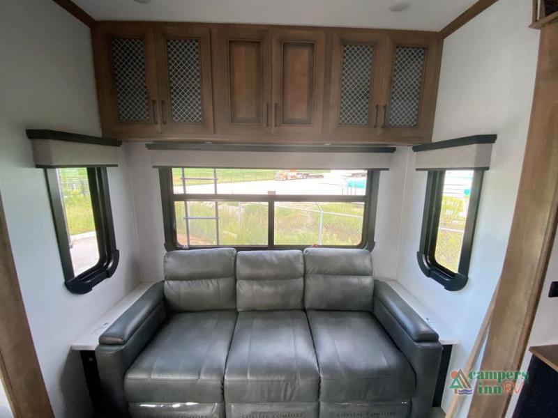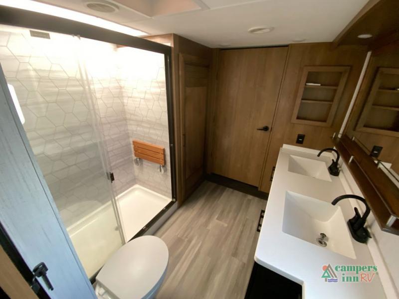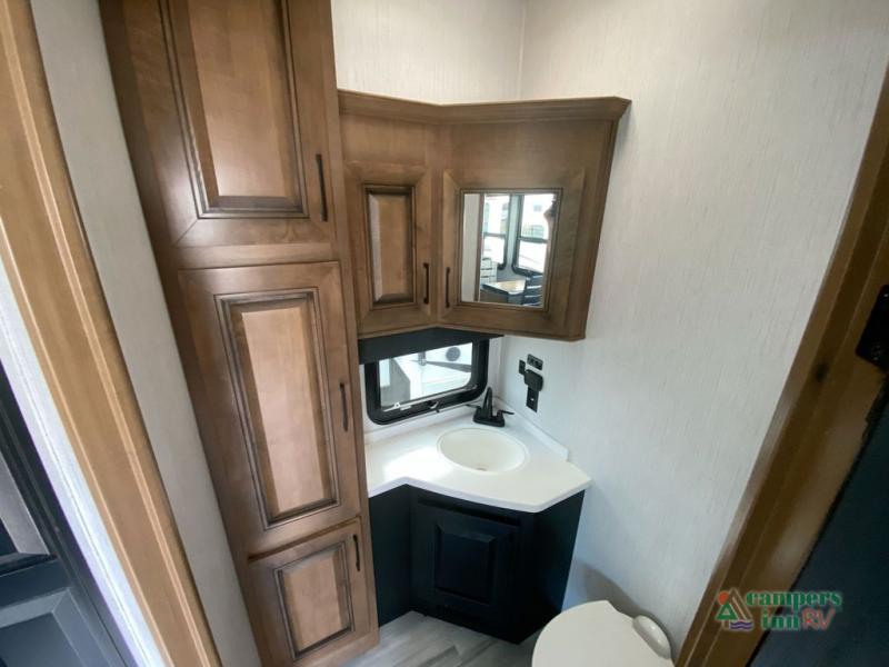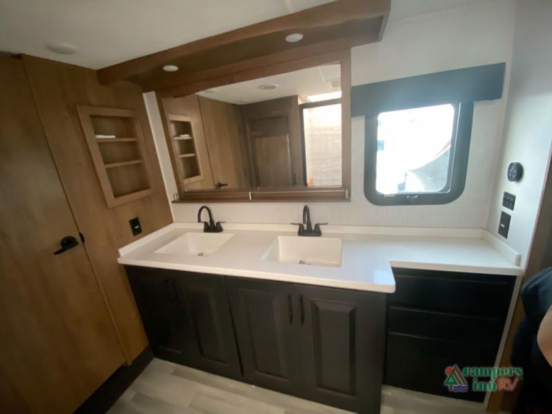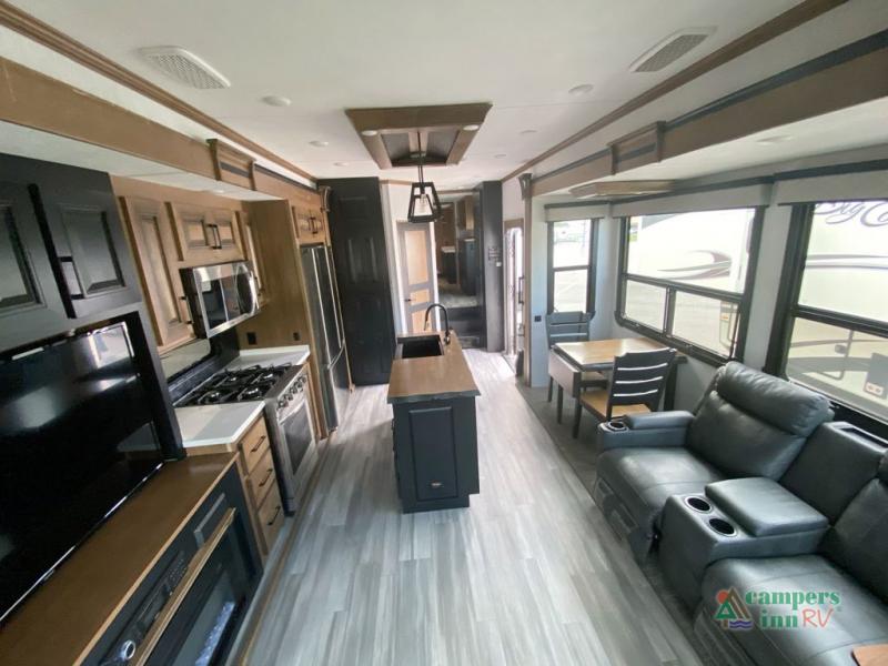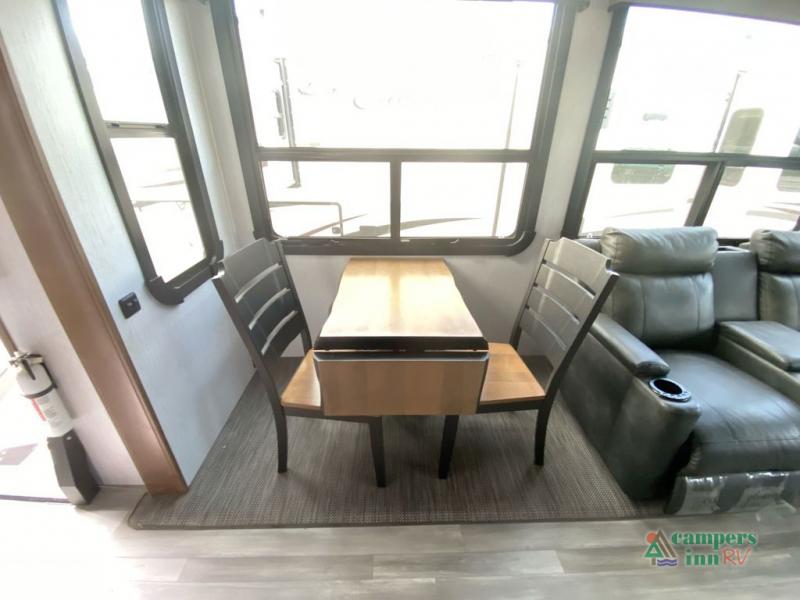This Bighorn gives you big features with a spacious bathroom that offers a large walk-in closet, a space prepped for a washer/dryer option, plus a shower with a teak seat, and a single sink. The sliding door leads you into the full bathroom with a slide out king bed with two windows for good circulation of fresh air when you want it, plus there is a bench seat with 32" LED TV above, and storage. The handy half bathroom is across from the entry for easy in and out access, and the combined living and kitchen area offers dual opposing slides. The cook will love the kitchen island and single basin stainless steel sink to prepare and serve meals from, the residential refrigerator when wanting to stock up on cold items and beverages, plus the four-burner cooktop and two pantries are a must. Everyone can sit at the rear flip and fold sleeper sofa which offers sleeping space at night for two, or the power theater seats with heat and massage. The live edge dinette table includes two standard chairs and two folding chairs so everyone can gather for meals or game night.