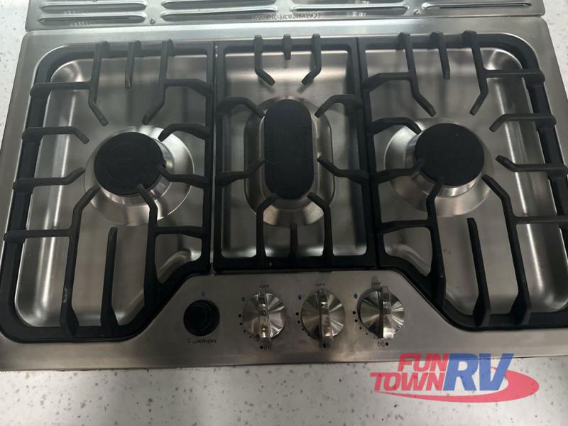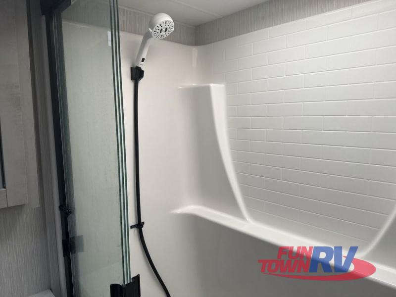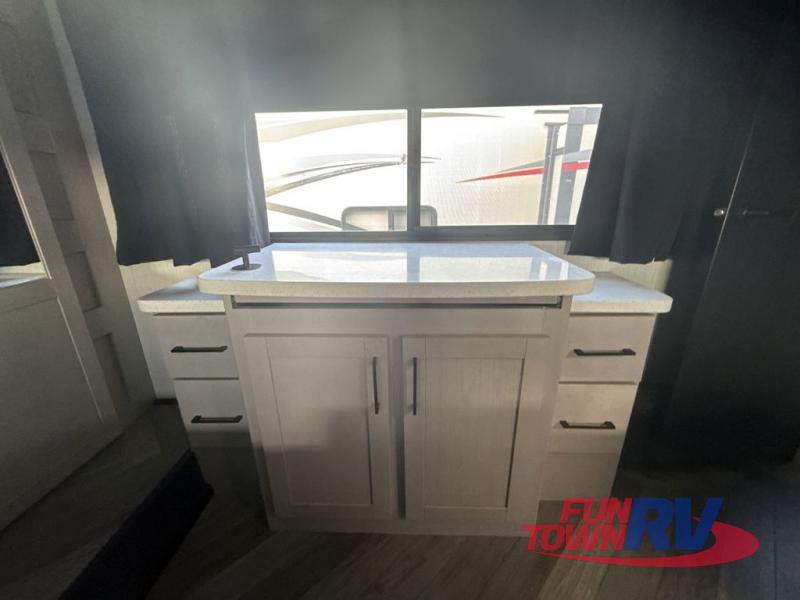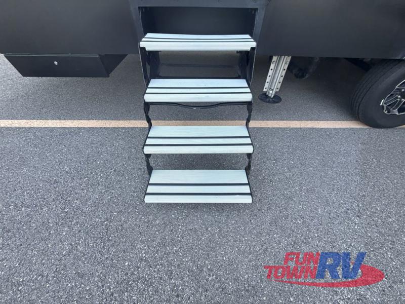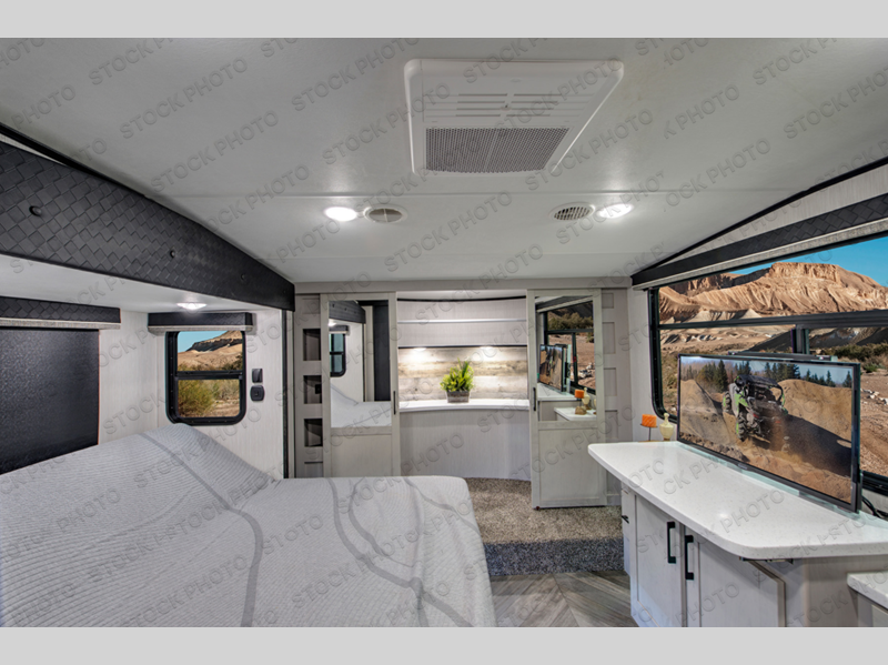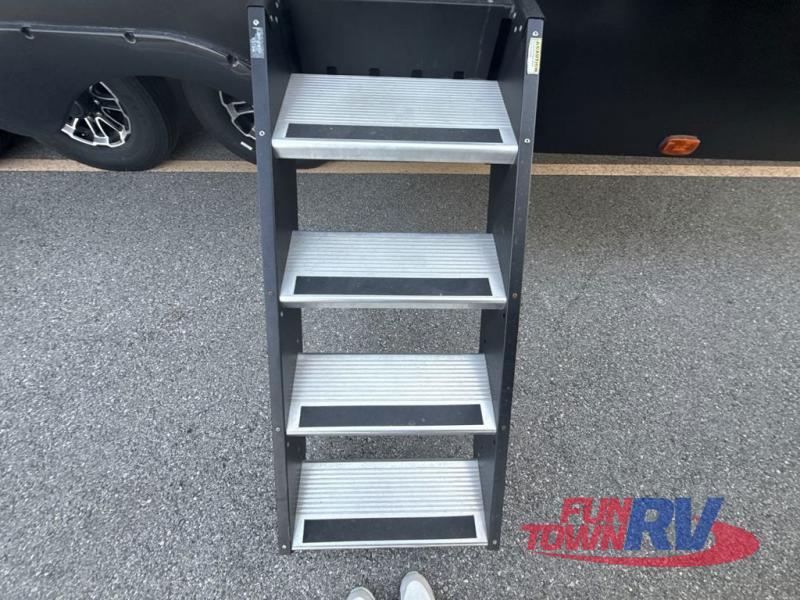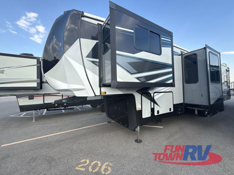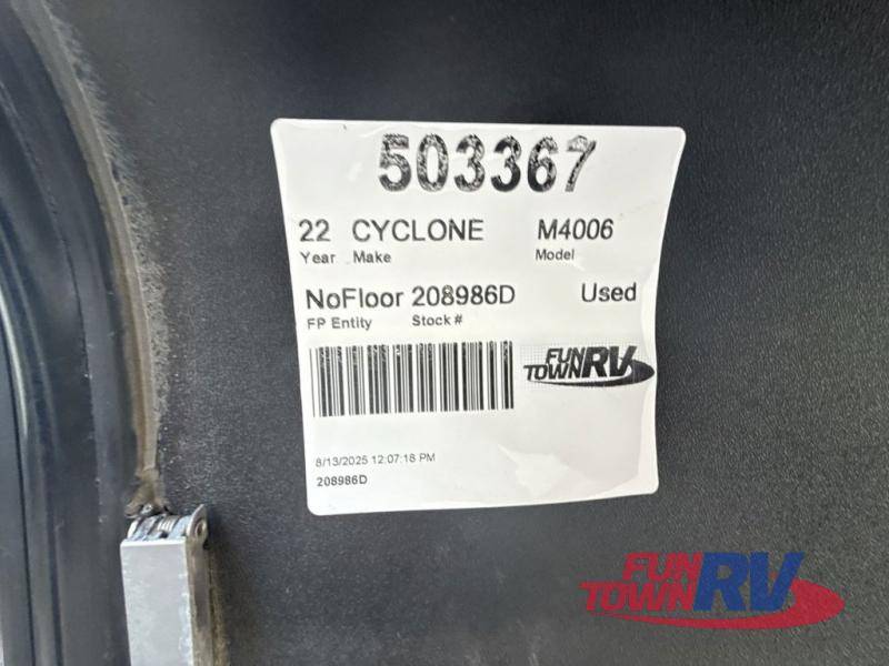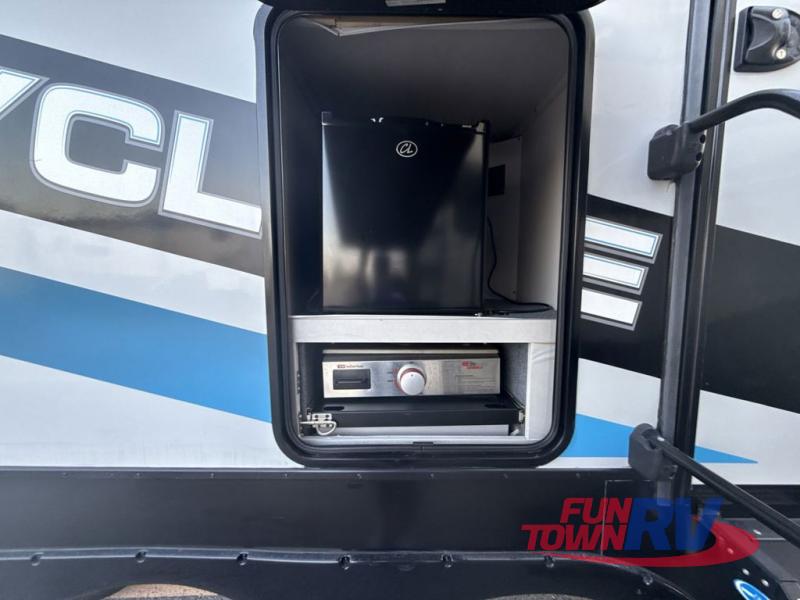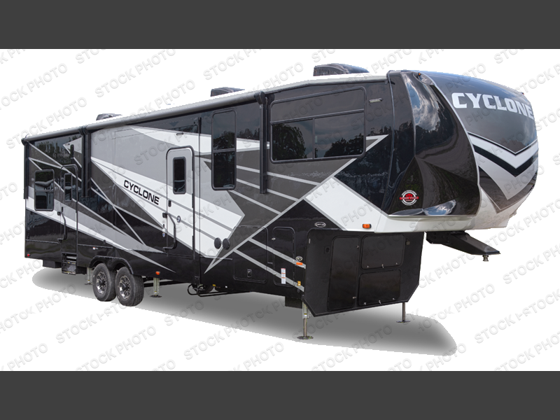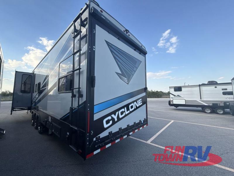 Satisfy your wanderlust with a Heartland Cyclone fifth wheel toy hauler! You won't have to sacrifice any luxury either with indulgent features like the king bedroom suite with a "swift space" work station that pulls out from the dresser, a Stor-Mor three-sided access to the basement with 30% more storage capacity, and Step Caddy folding patio step for better stability as you enter or exit the patio. The industry first Grill and Go 25" residential pull out 3 burner griddle combo comes on models with an exterior kitchen for an easier cooking experience. Full height shaker cabinetry provides 25% more storage space so you can bring more camping necessities with you. If you like to dry camp longer then you will appreciate the industry's largest 150 gallons fresh water tanks. Come find the perfect model for you today!