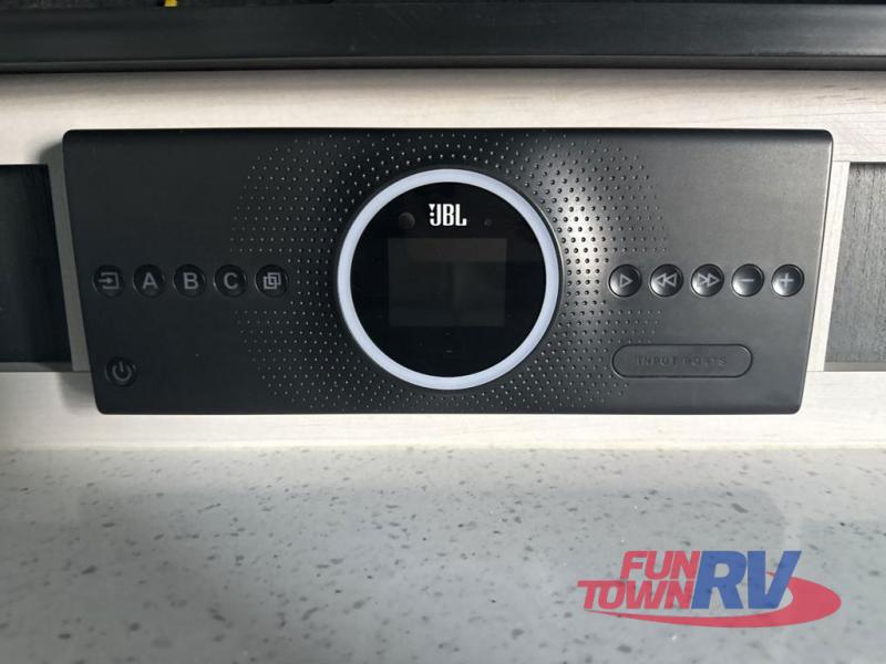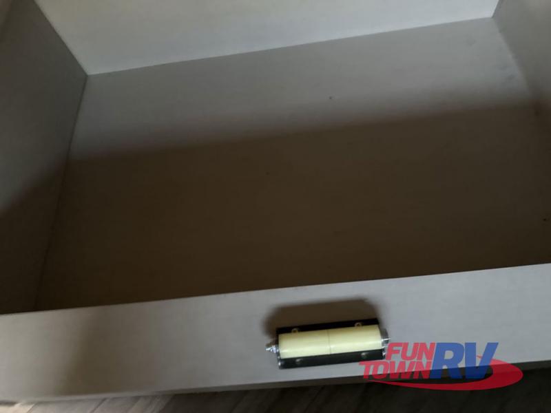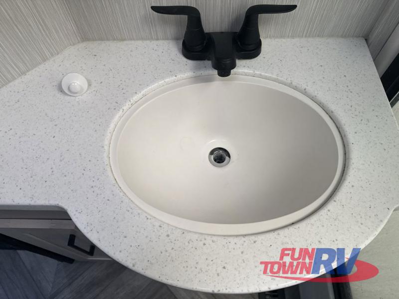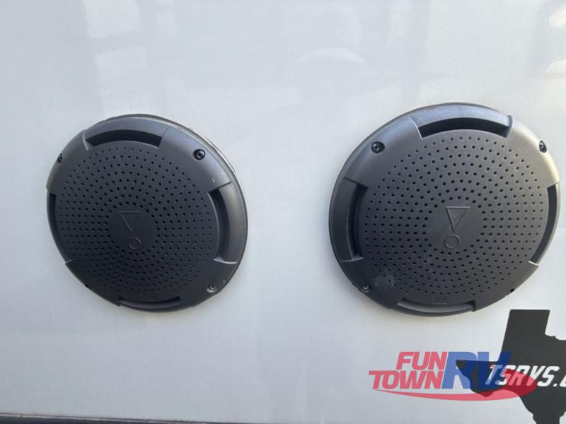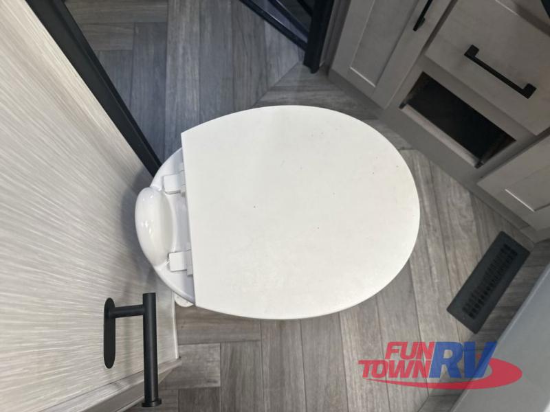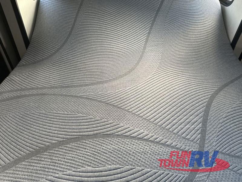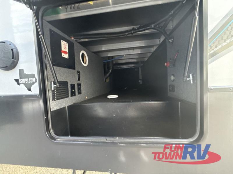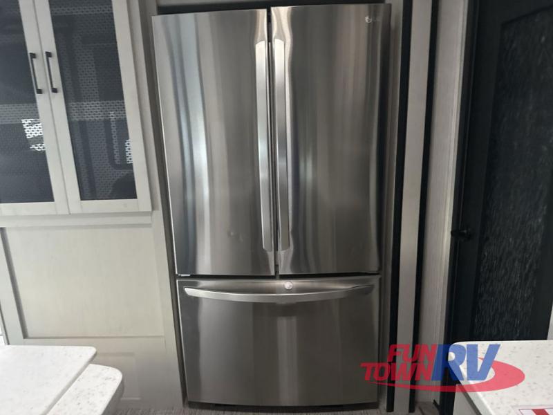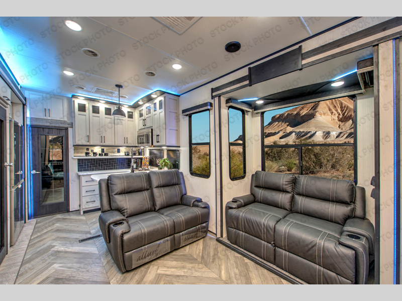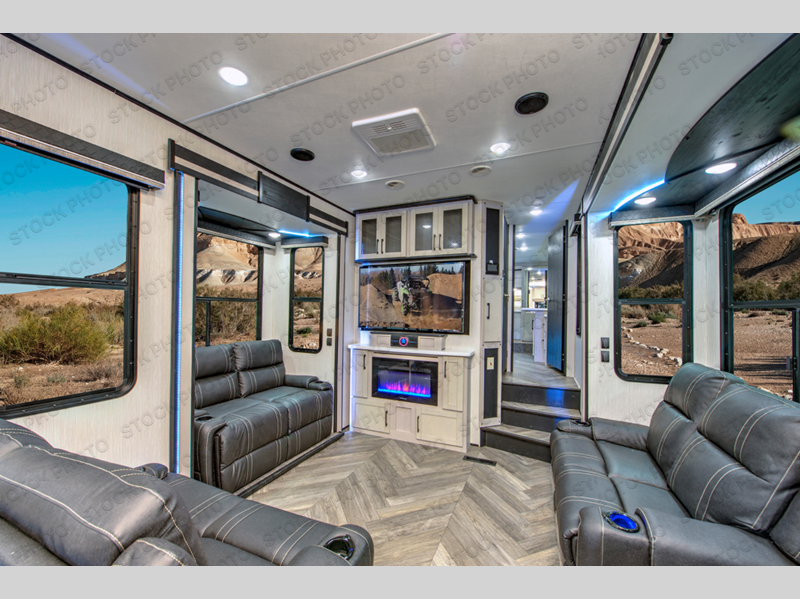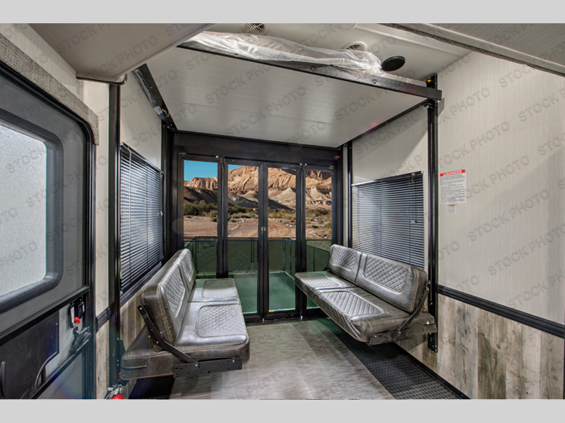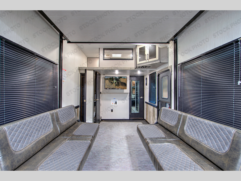 Everyone will have a comfortable place to sit in this toy hauler with the dual opposing theater seating slides and the third theater seating across from the 50" LCD HDTV! The 3,000 lb. weather resistant 8' ramp door makes it easy to load your toys into the 13' garage and then unload them once you have arrived and set up the electric queen bed above the split bench seating, the loft, the half bathroom, and there is even an area prepped to add an optional washer and dryer. There is plenty of countertop space in the U-shaped kitchen to prepare your best home cooked meals, and you even have an outside refrigerator to enjoy a cold beverage underneath the two awnings!