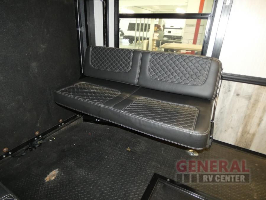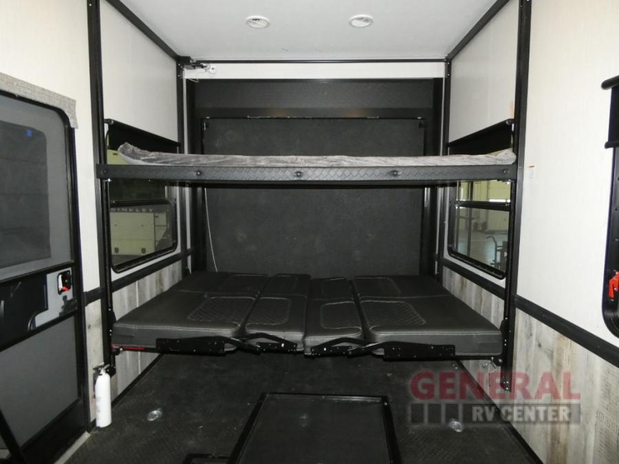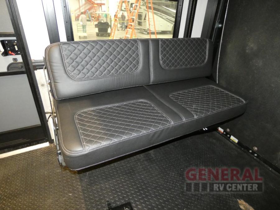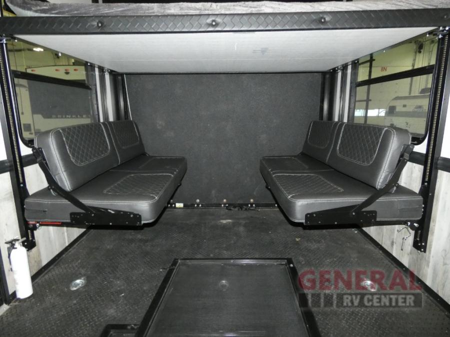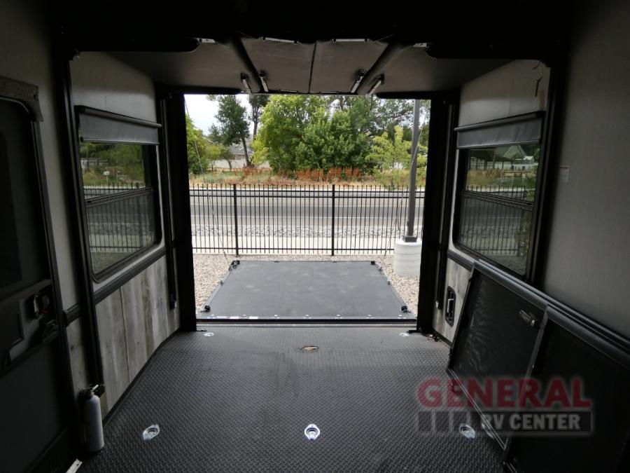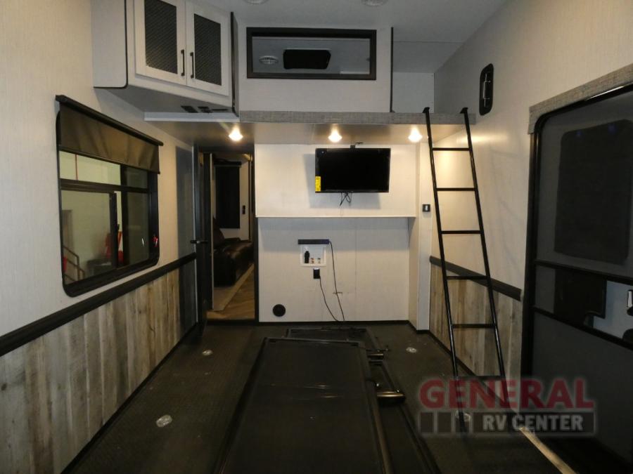 With the convenience of two kitchens (one inside and one outside) who wouldn’t want this 4115 Cyclone toy hauler fifth wheel by Heartland RV? The outside kitchen lets you breathe in some fresh air and watch the kids playing while you cook dinner. With the large garage (15’1”) you can easily bring along your favorite off-road toys whether that is a few dirt bikes or a four wheeler.  At night this area offers an electric queen bed and during the day the split bench seat is below so you can relax and unwind after a fun outdoors on the toys. And someone can retire in the comfortable front bedroom where you will find a tilting king bed, and plenty of storage with the wardrobe slide and cabinet that stretches into the hallway!