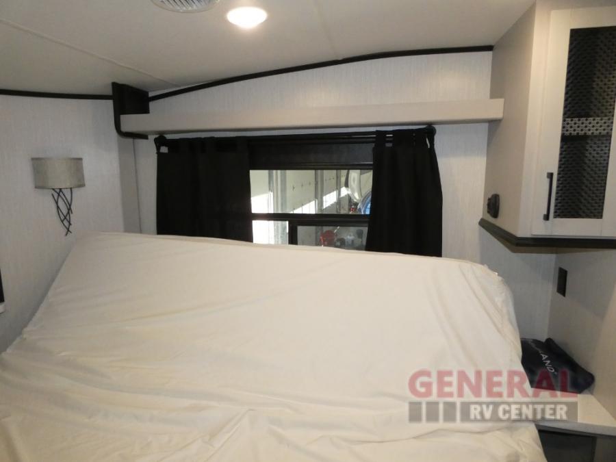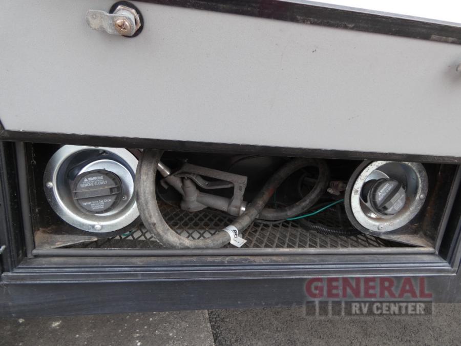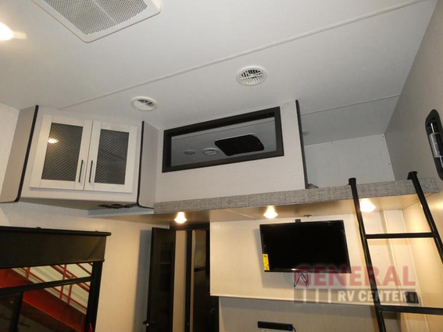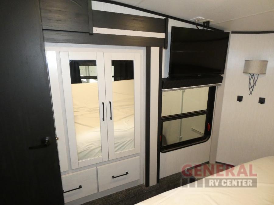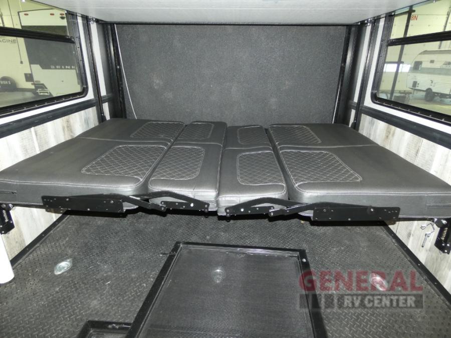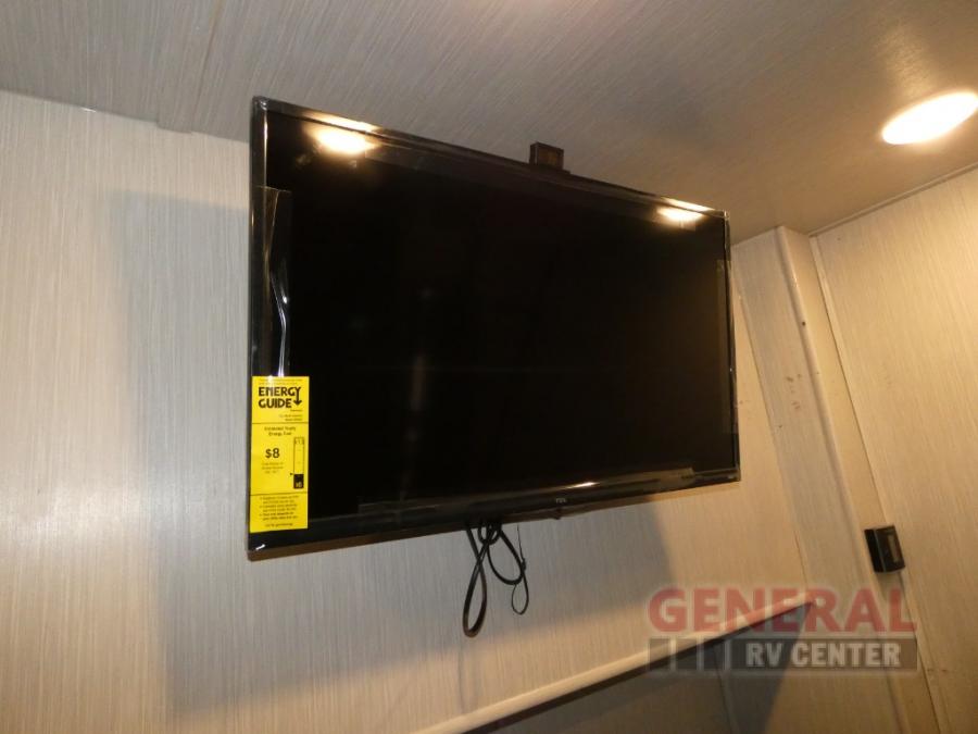 With the convenience of two kitchens (one inside and one outside) who wouldn’t want this 4115 Cyclone toy hauler fifth wheel by Heartland RV? The outside kitchen lets you breathe in some fresh air and watch the kids playing while you cook dinner. With the large garage (15’1”) you can easily bring along your favorite off-road toys whether that is a few dirt bikes or a four wheeler.  At night this area offers an electric queen bed and during the day the split bench seat is below so you can relax and unwind after a fun outdoors on the toys. And someone can retire in the comfortable front bedroom where you will find a tilting king bed, and plenty of storage with the wardrobe slide and cabinet that stretches into the hallway!