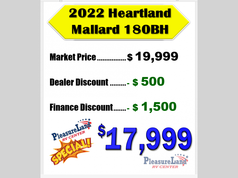 The Heartland Mallard travel trailer is quite impressive with its innovative features! The flip-down exterior steps and glow-in-the-dark graphics are some of the top exterior features, and the all-new Master Chef kitchen with Infinity edge countertops and a stainless steel undermount sink is one of the top interior features that will make camping life easier. The forced-air heated and enclosed underbelly is a great feature that protects your trailer from the outside weather, and the Wide Traxx axle system, leaf spring suspension, E-Z lube hubs, and aluminum rims all work together to give you a great ride to the campsite. The Mallard has also been prepped for a solar panel, Wi-Fi, and a back-up camera, and it also has a cable-ready hook-up.