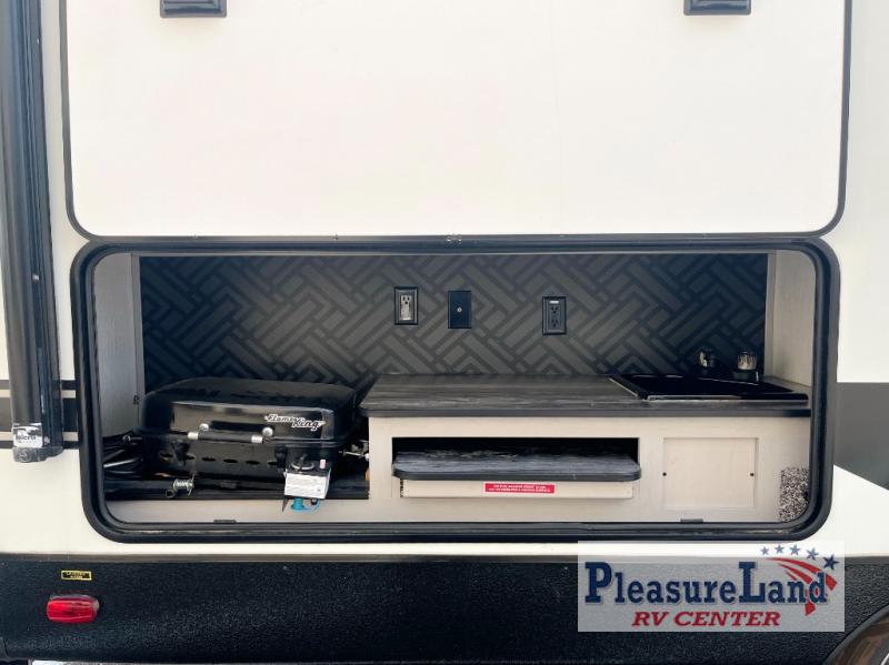 You can relax outside under the 15' power awning with LED lighting to stay up all night, and make a few meals using the outside kitchen on this Mallard travel trailer. When you are ready to retire for the evening, the front of the trailer offers a Murphy bed with a privacy curtain, and the back of this trailer gives the kids their own space with a set of queen bunk beds. The full kitchen inside allows you to make meals no matter what the camping weather is, and the full bathroom gives you a place to get cleaned up for dinner or bedtime.