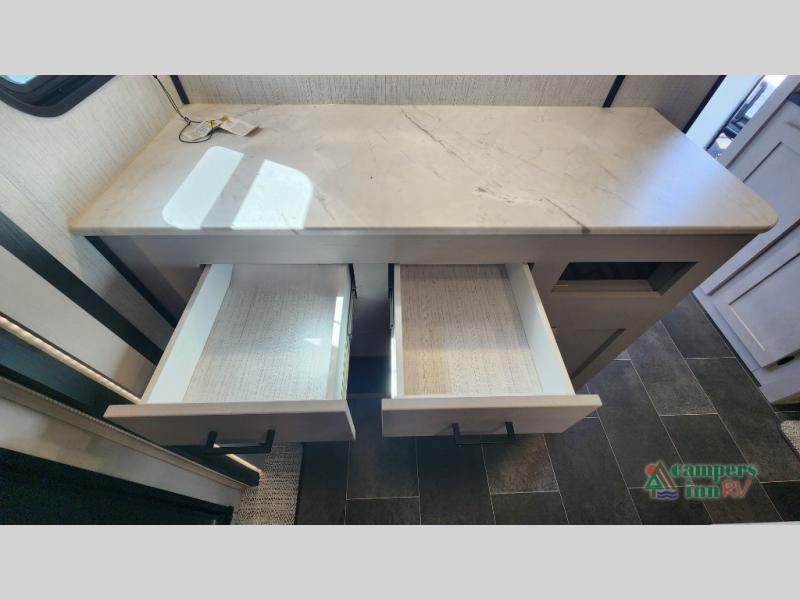 Dual opposing slide-outs create open-concept living space