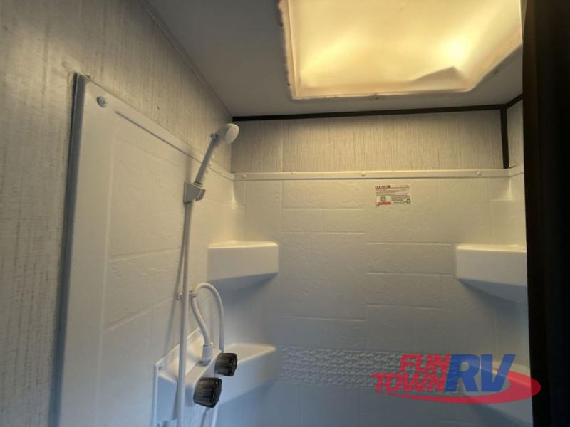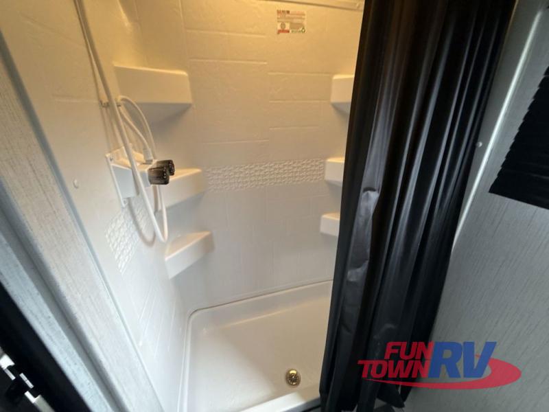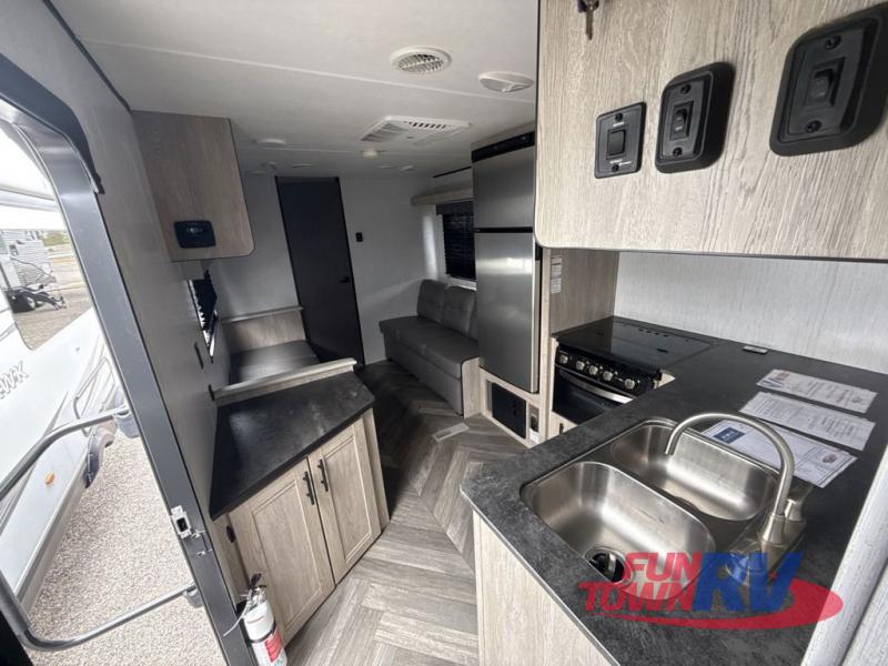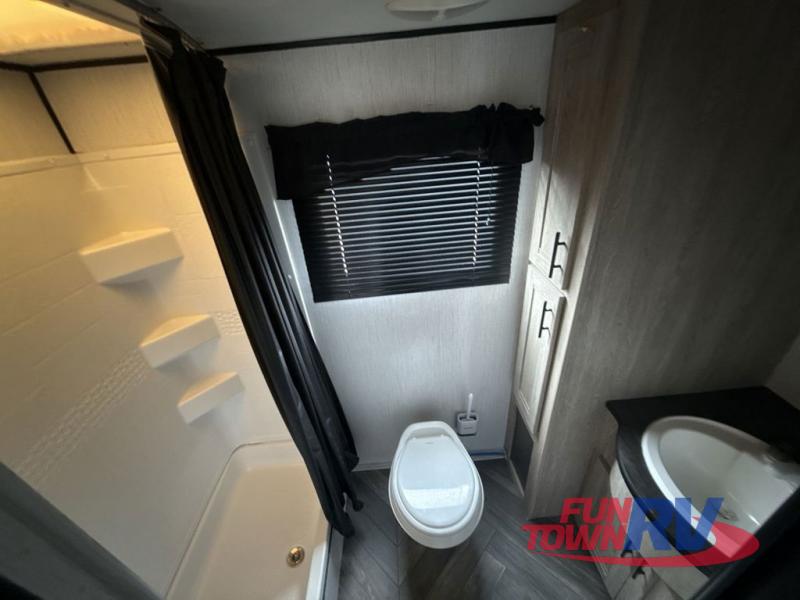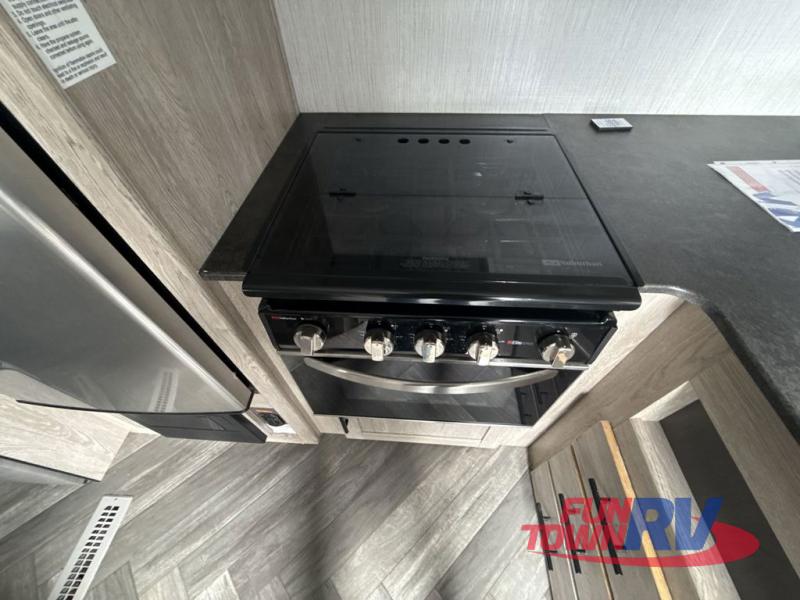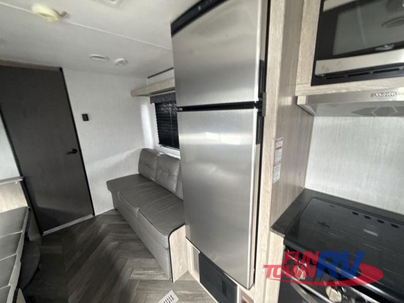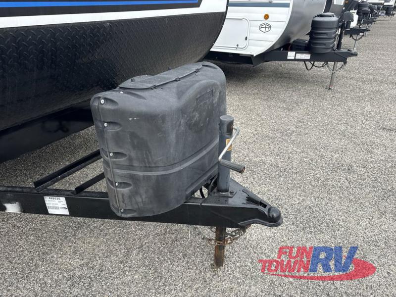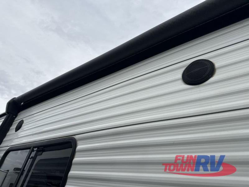 Head to the lake in this cozy travel trailer for four! The full rear bath will provide privacy everyone will appreciate, and the front private bedroom will feel just like home. This Prowler kitchen includes everything you need to prepare meals each day, including a three burner cooktop, a microwave oven, and a 10 cu. ft. 12V stainless steel refrigerator for leftovers. This model also includes a 14' power awning with LED lights for outdoor fun and relaxation!