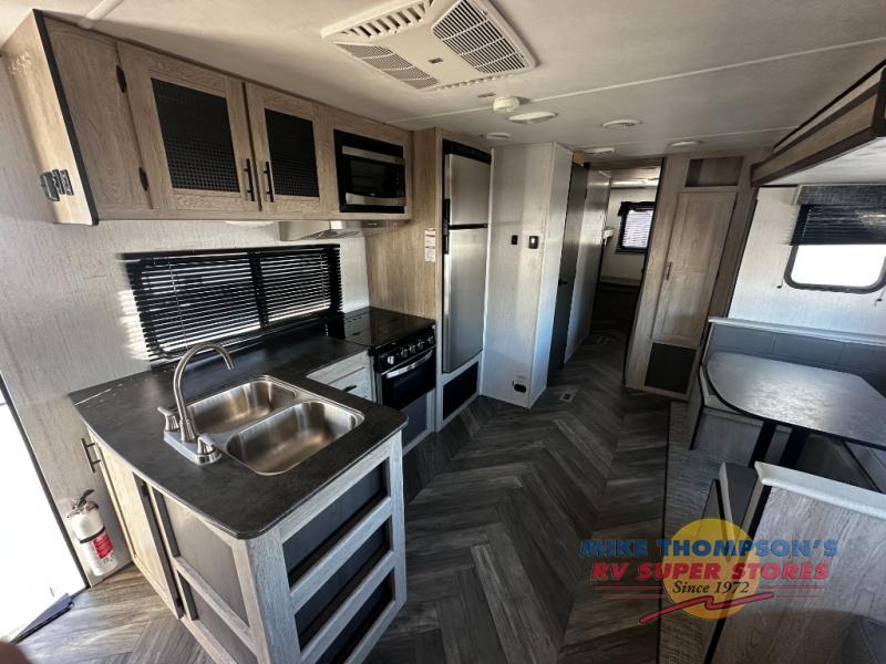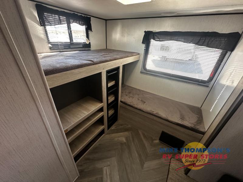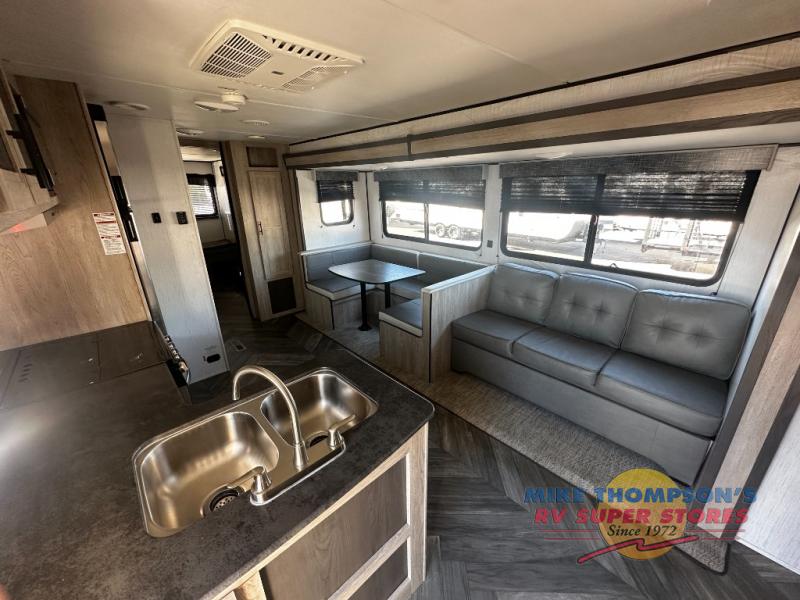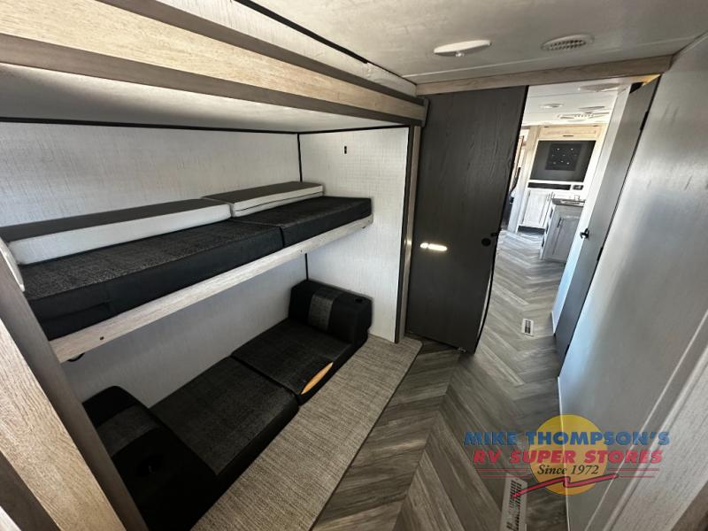 You can't go wrong with this double slide travel trailer in tow! The chef of your group can prepare lunch on the outdoor kitchen with a griddle before you all head off on a trail. The full bath includes its own exterior entry door for convenience, and you'll find a second entry door leading into the main living area. The bunkhouse includes a slide out for more space, three bunks, plus game chairs below one bunk the little ones are sure to love. You'll find a sofa and U-shaped dinette within the living area, and all the kitchen appliances needed to prepare at-home meals. This model also includes a front private bedroom with a queen bed for all-around comfort!