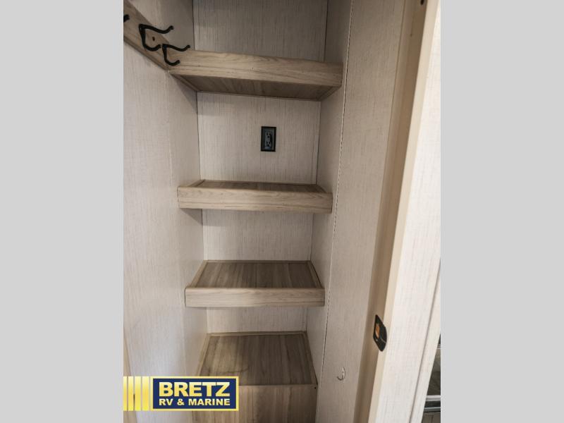 This Sundance Ultra Lite travel trailer has extra convenience because it offers you two entry doors! Now you can enter the bedroom directly, or you can come in the back to get to the rear kitchen. There is a walk-in pantry directly to the left when you come in the kitchen entrance, so you'll be able to grab snacks quickly when you're outside playing. The sofa sits across from the area where you can add the optional 39" LED TV, so you'll be able to watch a show in comfort. The booth dinette is multi-functional because it can serve as a dining or sleeping space, and the queen-size bed is where the owners will want to spend their nights.