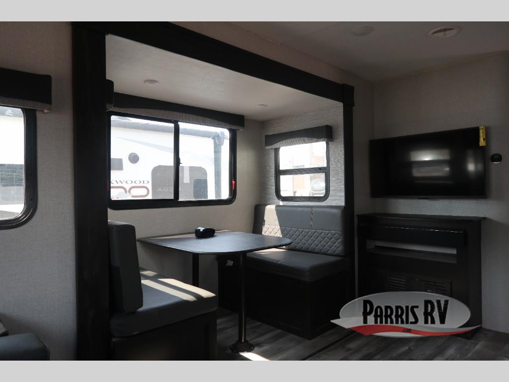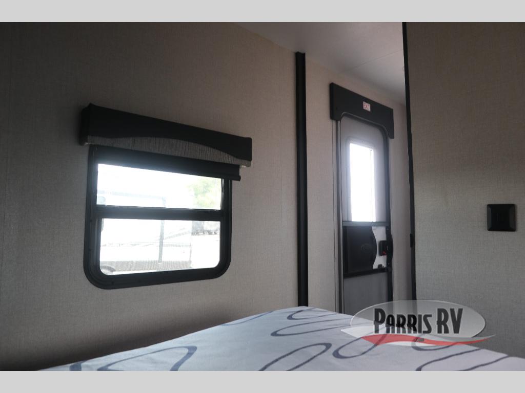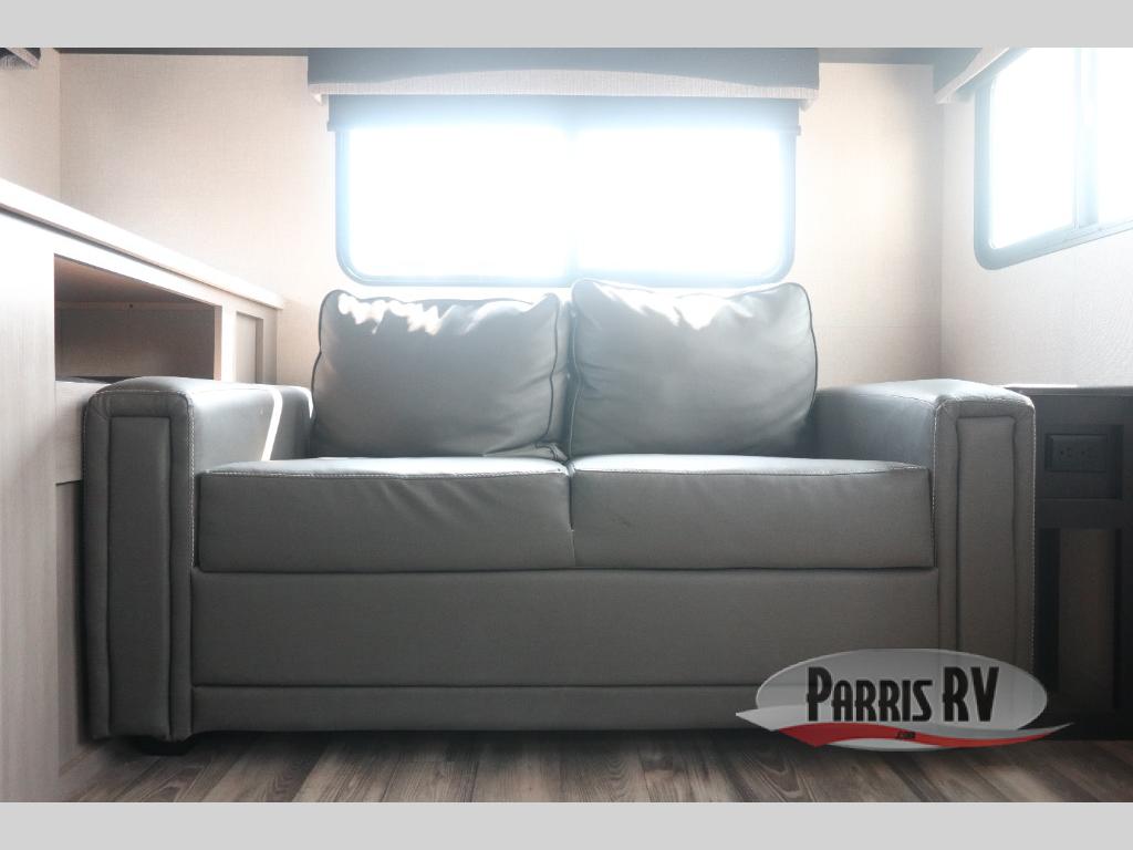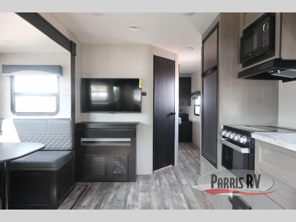 You will have everything you could need for a fun camping trip in this travel trailer! Inside the front private bedroom is a queen bed with drawers underneath for extra blankets, wardrobes on either side to keep your clothes out of the way, and an entrance into the dual entry bathroom. The booth dinette offers a comfortable place to enjoy your meals, play games, and even transform into an extra sleeping space. If mother nature is raining on your parade then head to the rear tri-fold sofa to watch a movie on the LED HDTV at the entertainment center!