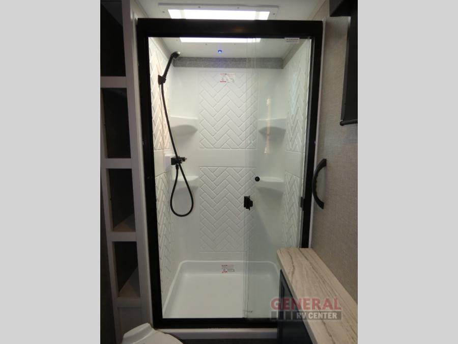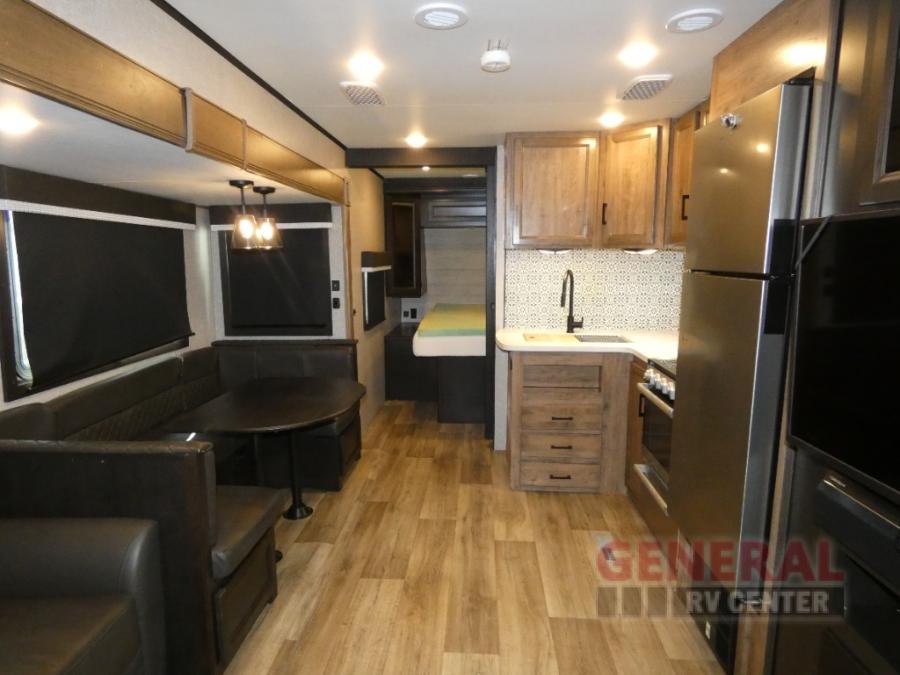 There's a lot to love about this travel trailer! From the set of 48" x 80" bunk beds with storage in the steps to the walk-in pantry behind the swing-out entertainment center with a fireplace for a cozy evening indoors. Everyone can freshen up in the rear corner bathroom with the shower, keep their towel close by with the linen closet, and have plenty of countertop space to get ready in the mornings. The tri-fold sofa and U-shaped dinette slide offer comfortable places to sit, dine, and play games, as well as transform into extra sleeping spaces. The front private bedroom has a queen bed with wardrobes on either side and another wardrobe to keep your clothes looking their best. You even have an outside kitchen to cook your meals at while watching others play a game of cornhole!
