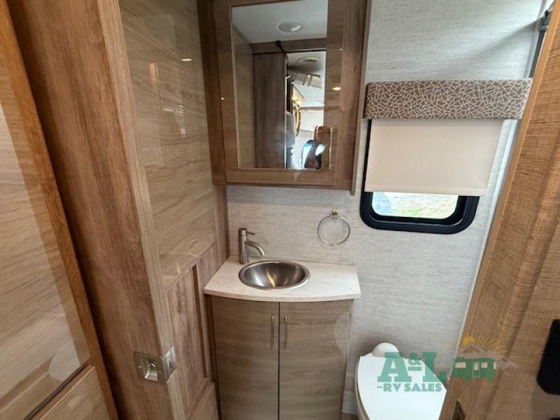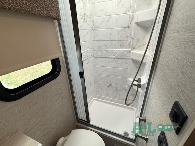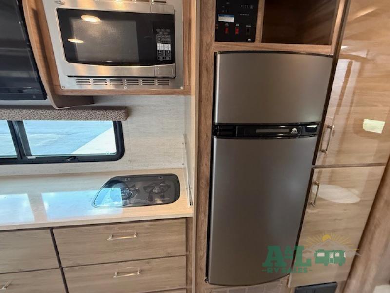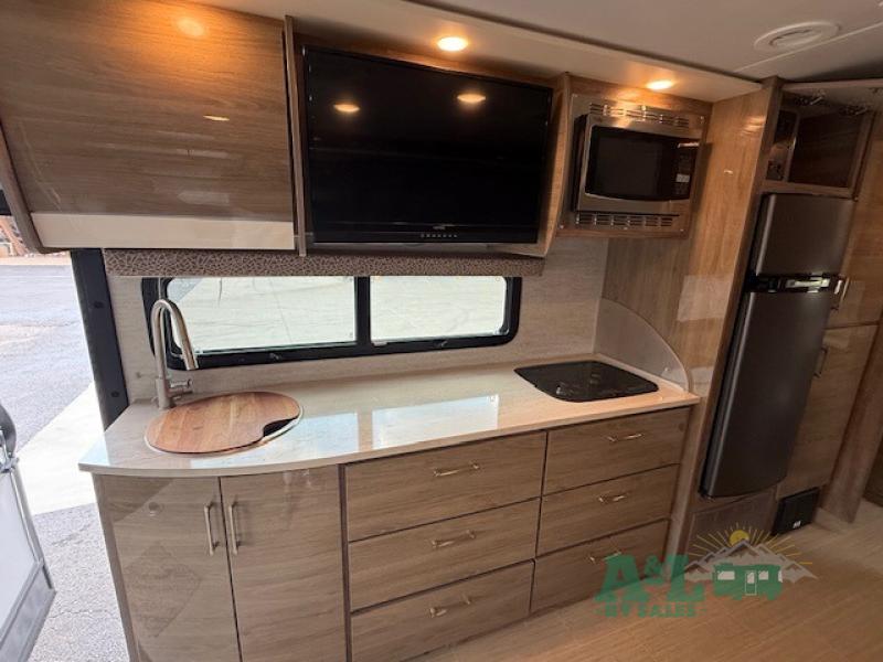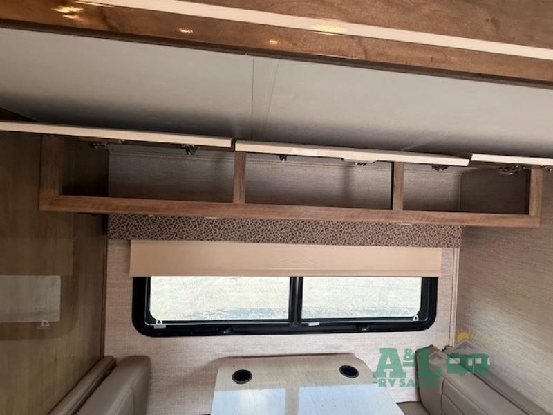 Each Melbourne Class C diesel motorhome by Jayco features durable Stronghold VBL lamination, bead-foam insulation, and a seamless front cap that resists wear and tear from the elements. There are seatbelts in all designated seating locations, and the captain's seats swivel around so they can become a part of the living area once parked. You'll appreciate an Onan 3,600-watt LP generator on board, as well as a 13,500 BTU A/C and a 30,000 BTU furnace to keep you comfortable year around. The interior of the Melbourne will have you feeling right at home with high-intensity LED lights, an 83" interior height with a padded vinyl ceiling, hardwood cabinet doors and drawers, and more!