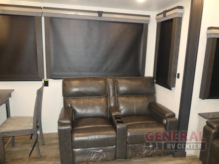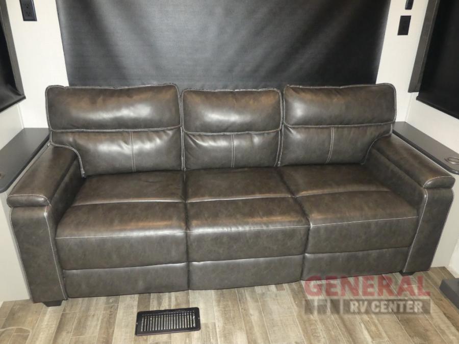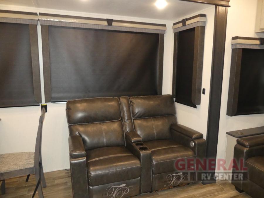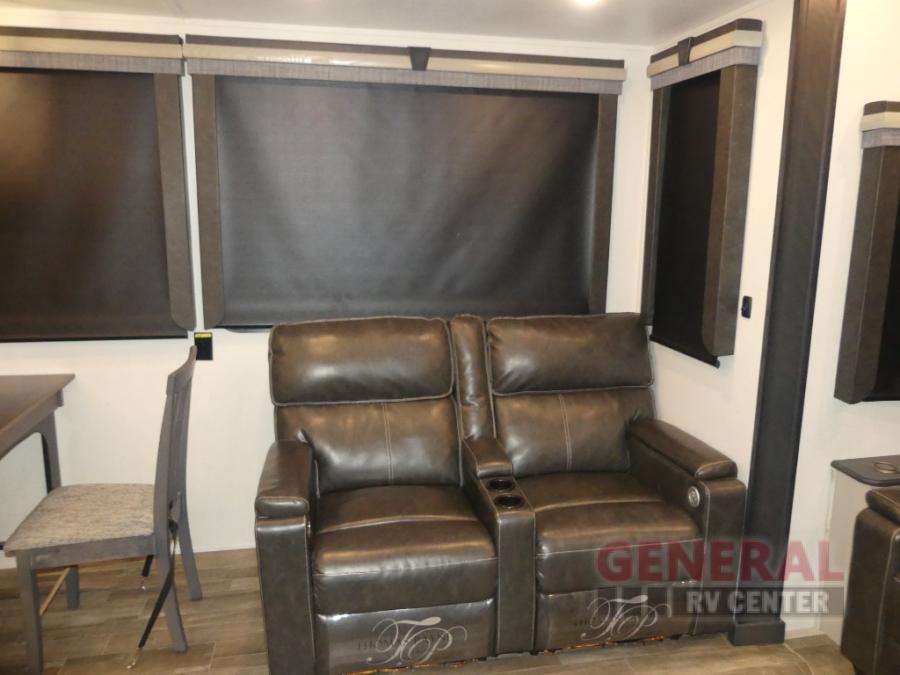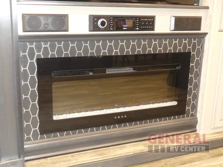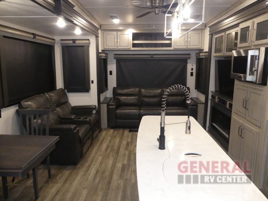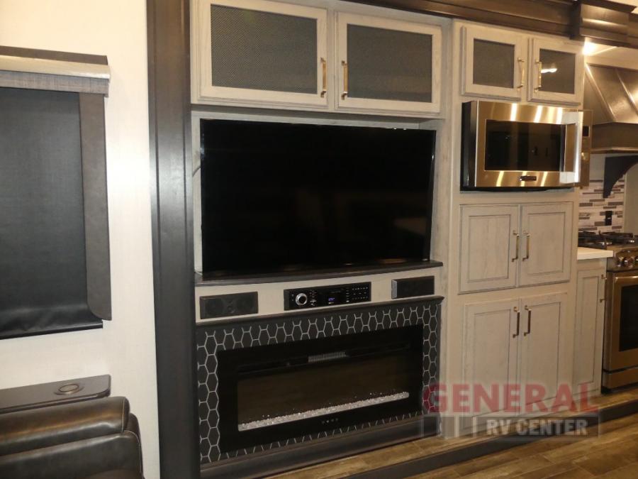 You will feel right at home camping in this fifth wheel! The chef will have lots of countertop space to prepare their best meals along with a kitchen island, a hutch to store your dishes, and a 18 cu. ft. gas/electric refrigerator to store any leftovers. The free standing dinette offers a comfortable place to enjoy your meals then play a card game or you can relax on the hide-a-bed sofa sleeper or the Thomas Payne theater seating equipped with heat, massage, LED lights, and a USB charging station across from the entertainment center with a 40" fireplace and a 50" TV. The dual entry bathroom has a shower with a seat and is easy for everyone to access especially those staying in the front private bedroom. The bedroom also has a king bed slide with storage underneath for extra blankets, a bench next to a chest, and a front master closet.