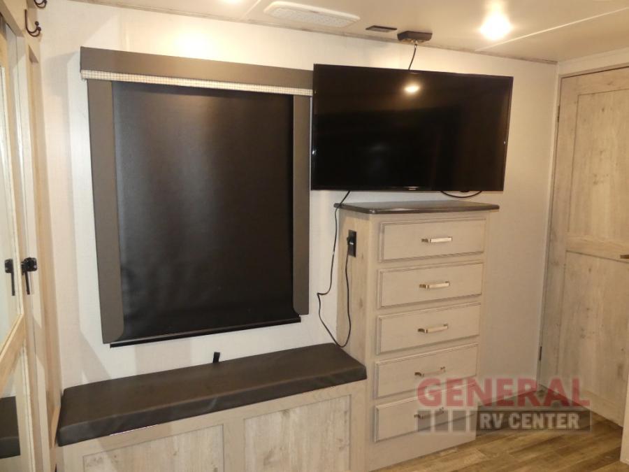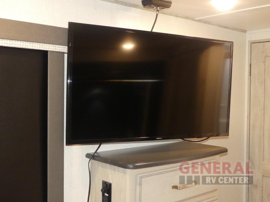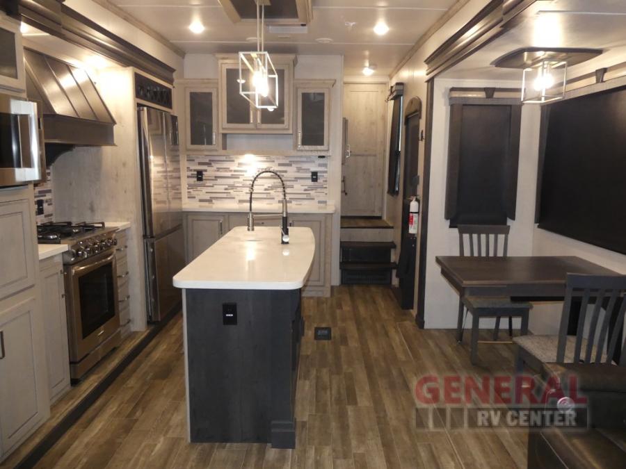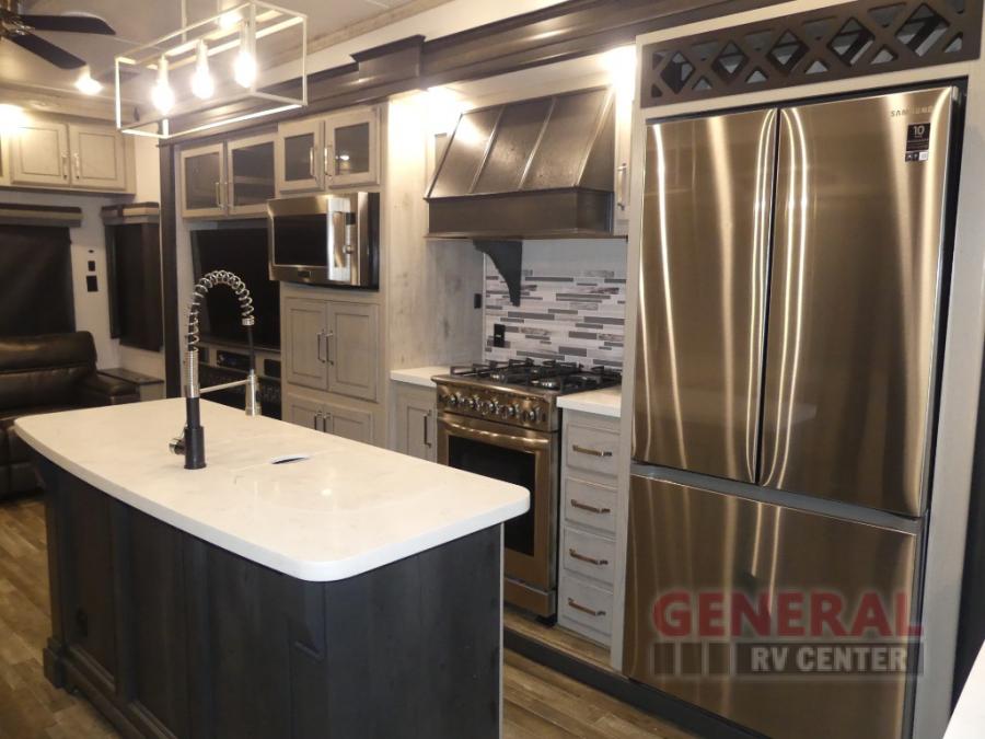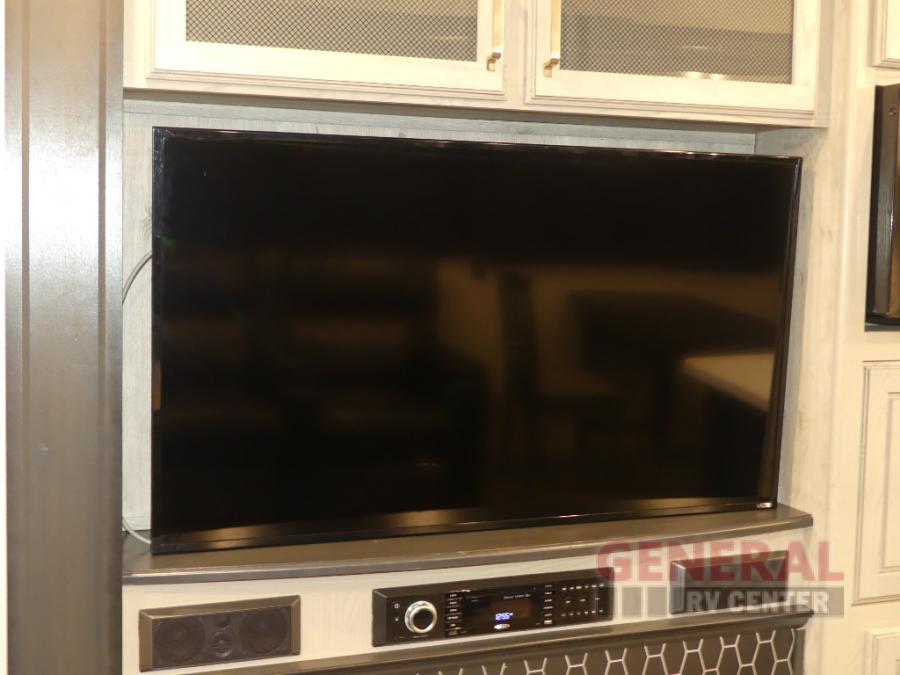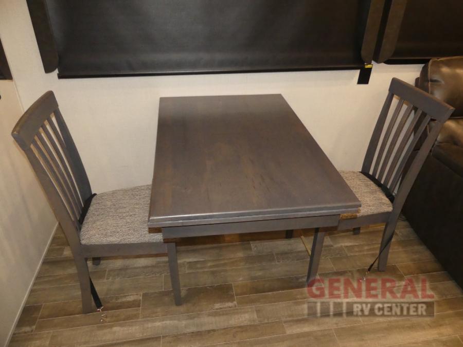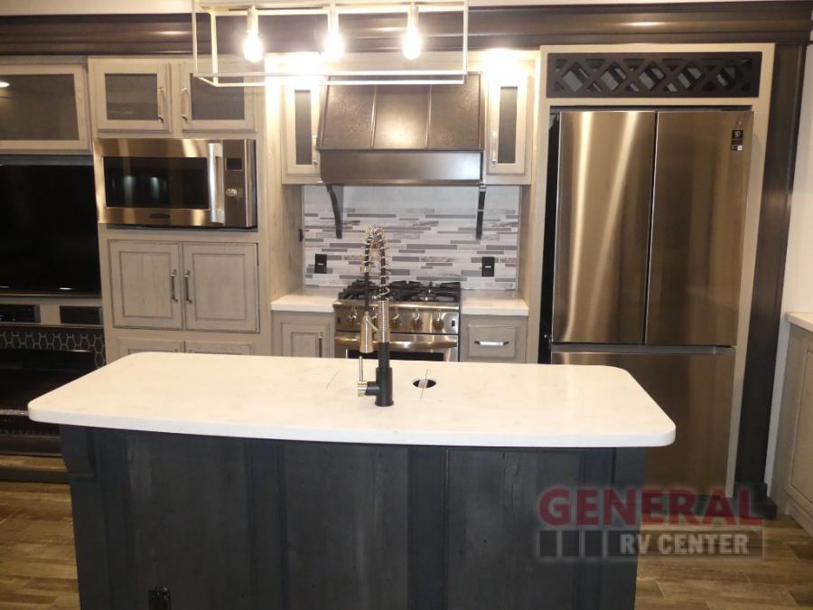 You will feel right at home camping in this fifth wheel! The chef will have lots of countertop space to prepare their best meals along with a kitchen island, a hutch to store your dishes, and a 18 cu. ft. gas/electric refrigerator to store any leftovers. The free standing dinette offers a comfortable place to enjoy your meals then play a card game or you can relax on the hide-a-bed sofa sleeper or the Thomas Payne theater seating equipped with heat, massage, LED lights, and a USB charging station across from the entertainment center with a 40" fireplace and a 50" TV. The dual entry bathroom has a shower with a seat and is easy for everyone to access especially those staying in the front private bedroom. The bedroom also has a king bed slide with storage underneath for extra blankets, a bench next to a chest, and a front master closet.