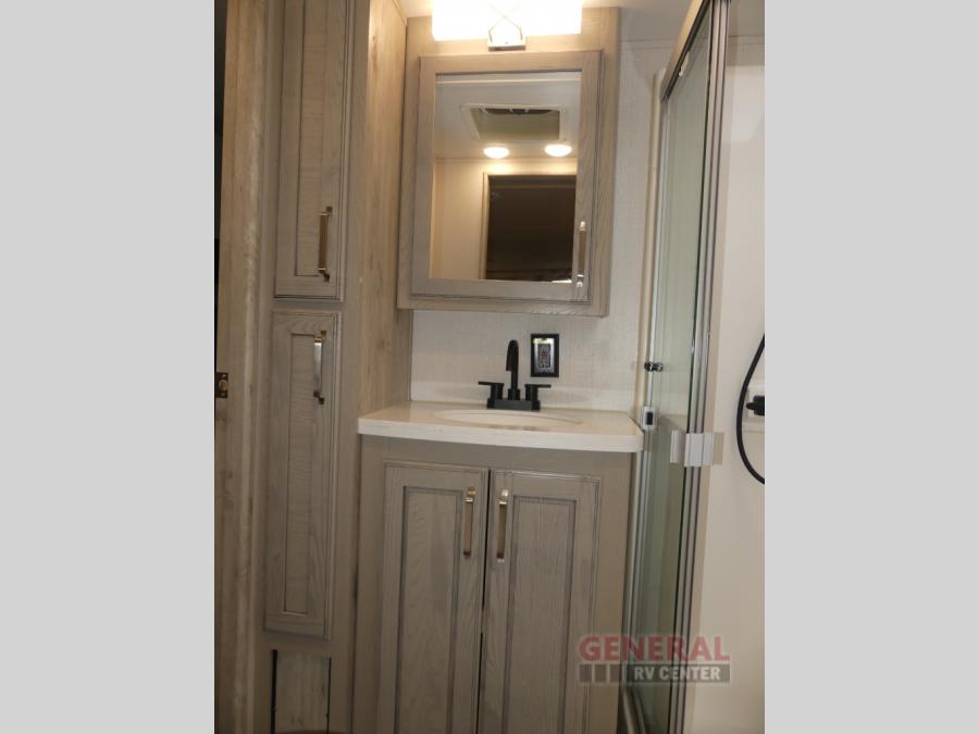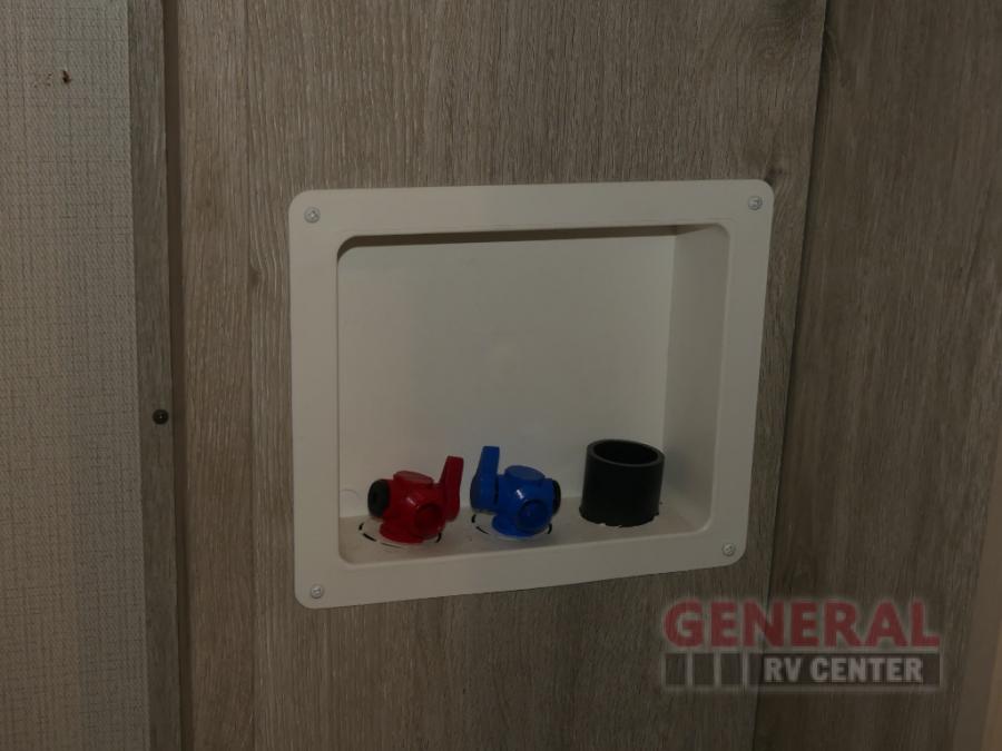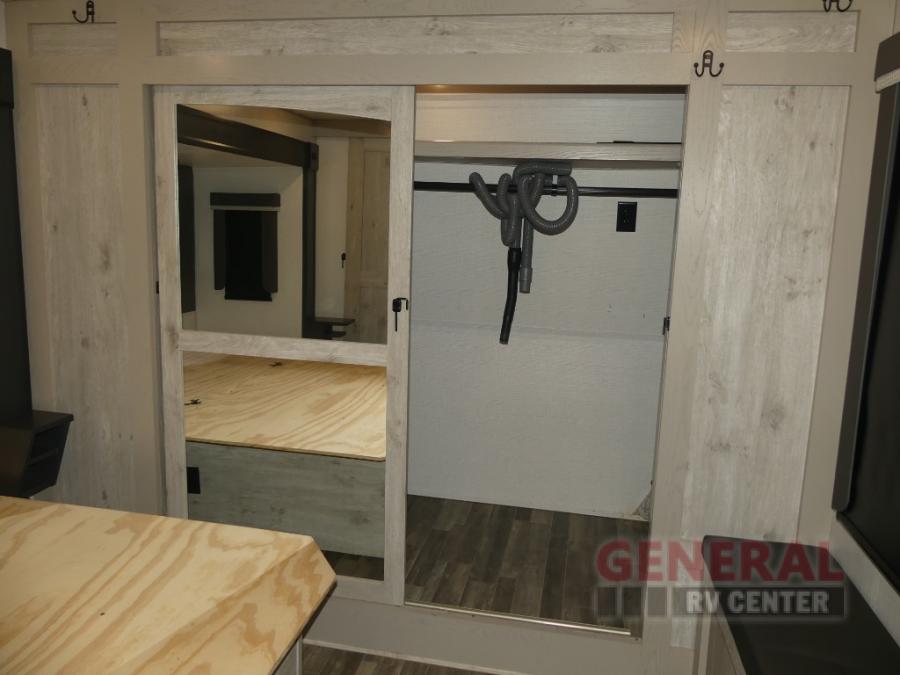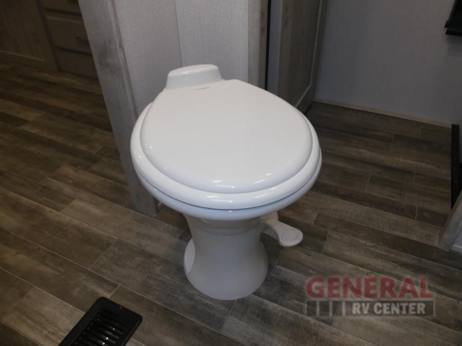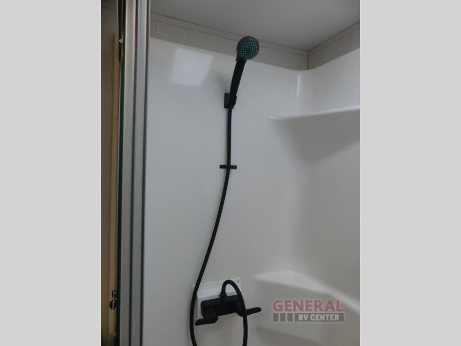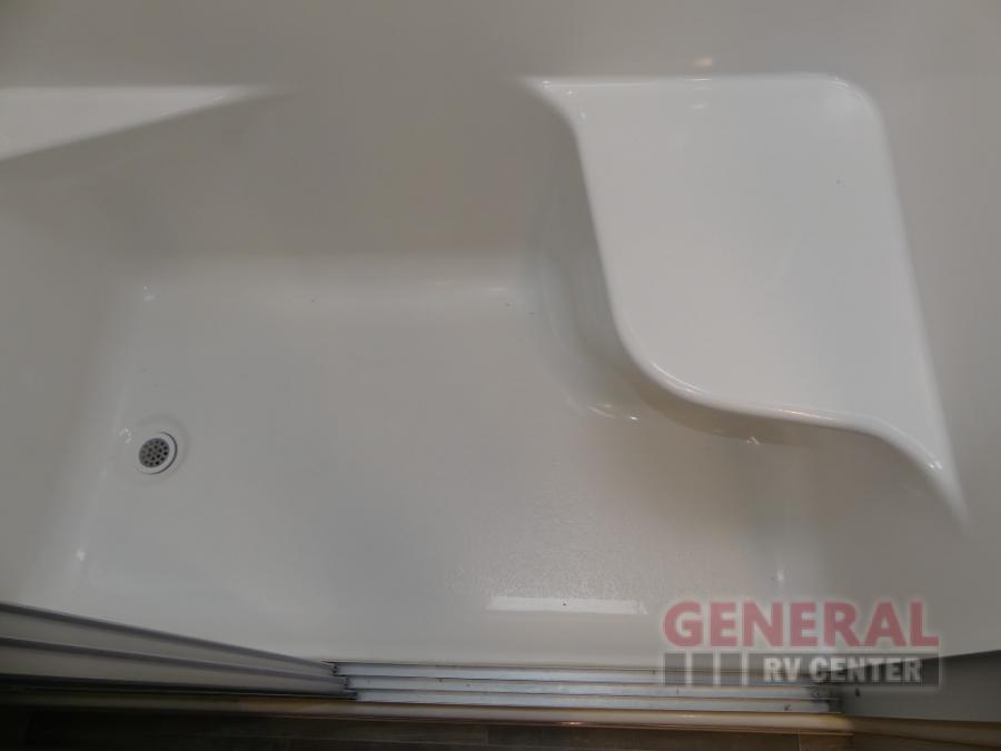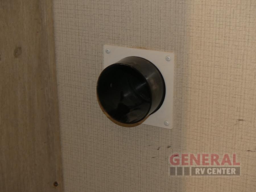 You will feel right at home camping in this fifth wheel! The chef will have lots of countertop space to prepare their best meals along with a kitchen island, a hutch to store your dishes, and a 18 cu. ft. gas/electric refrigerator to store any leftovers. The free standing dinette offers a comfortable place to enjoy your meals then play a card game or you can relax on the hide-a-bed sofa sleeper or the Thomas Payne theater seating equipped with heat, massage, LED lights, and a USB charging station across from the entertainment center with a 40" fireplace and a 50" TV. The dual entry bathroom has a shower with a seat and is easy for everyone to access especially those staying in the front private bedroom. The bedroom also has a king bed slide with storage underneath for extra blankets, a bench next to a chest, and a front master closet.