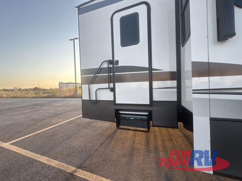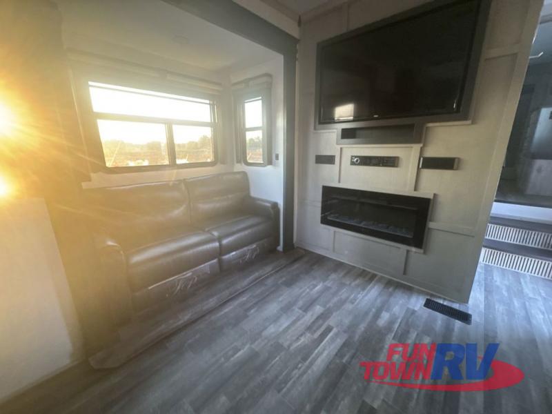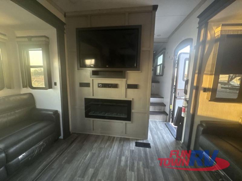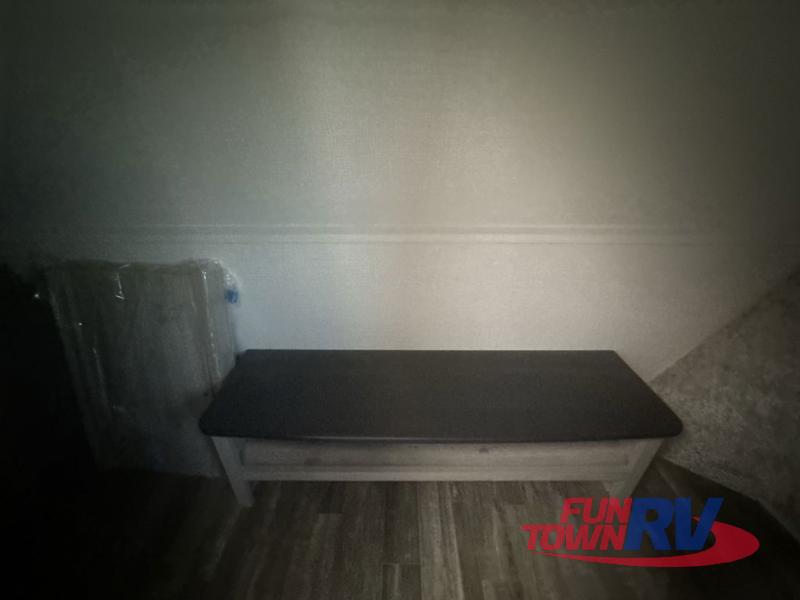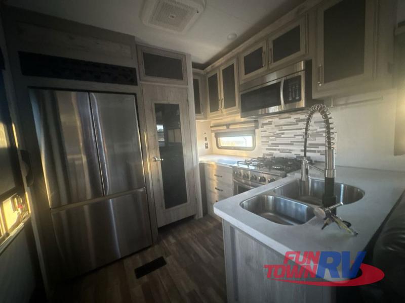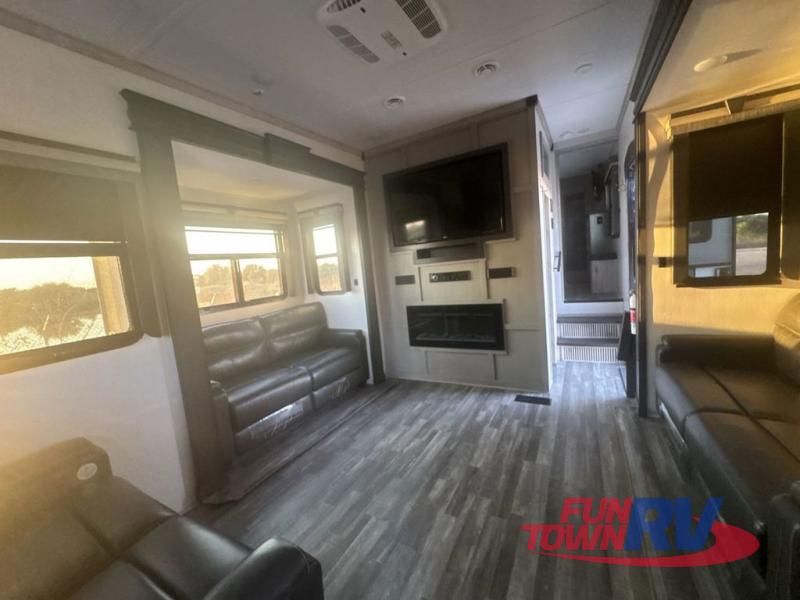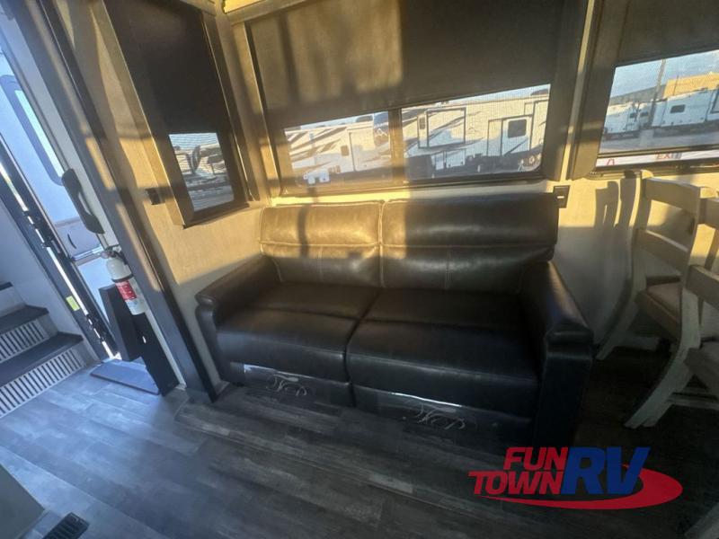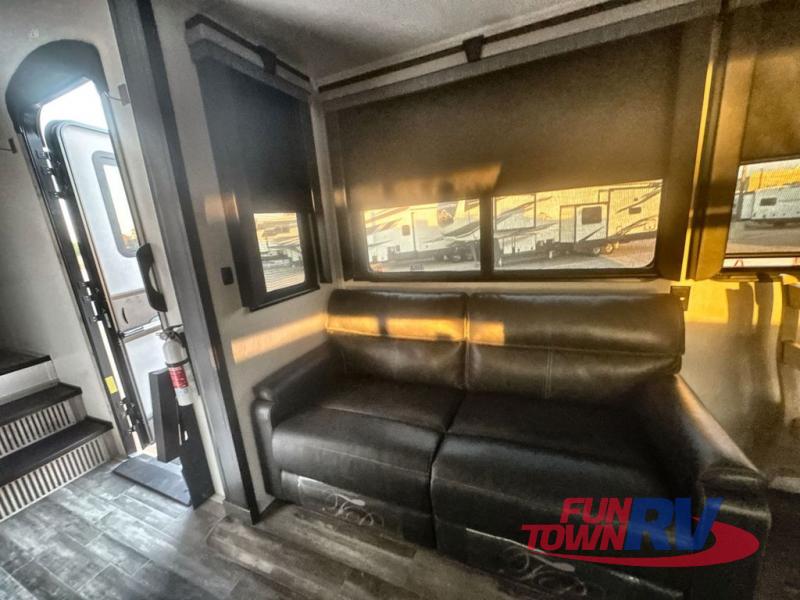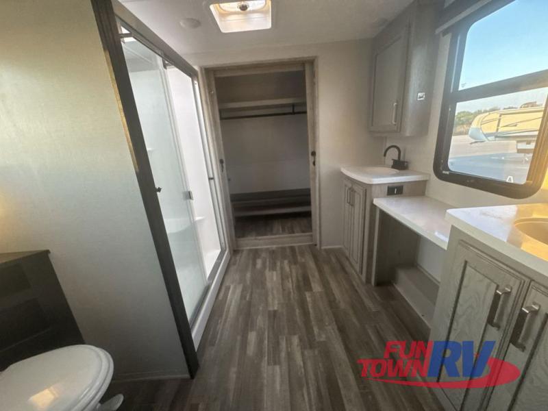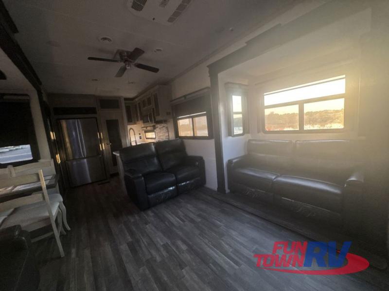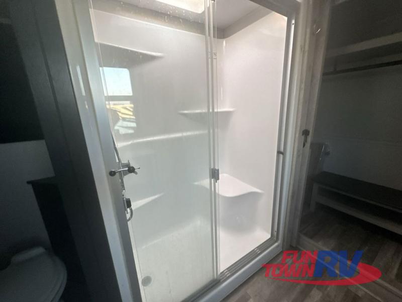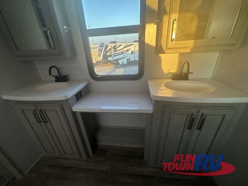 With a bath and a half, it's a clean decision to take this fifth wheel with you on your next camping trip! One of the dual entry doors leads directly into the rear kitchen which has a large pantry and a 18 cu. ft. gas/electric refrigerator to store your food items. The free standing dinette and tri-fold sofa sleeper slide and opposing tri-fold sofa sleeper slide opens up the middle living area for more walking around space. The half bathroom is conveniently next to the living area and has an area prepped to add the an optional washer and dryer for clean clothes throughout your entire trip. The master suite not only has a king bed slide with storage underneath and a bench next to a dresser, but also access into the front full bathroom which has a dual sink vanity, a shower with a seat, and a toilet with privacy walls!
