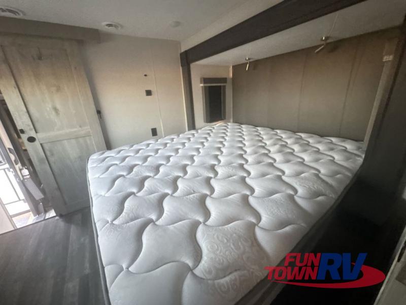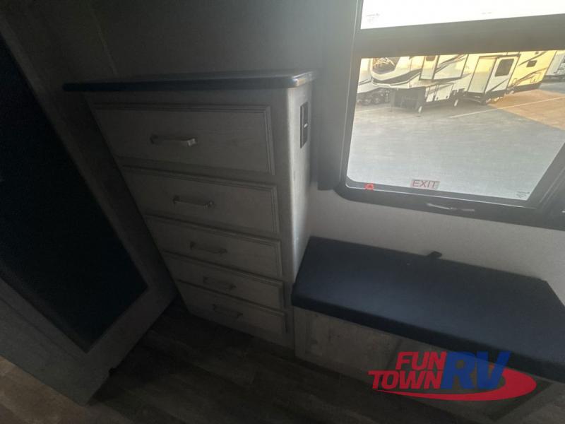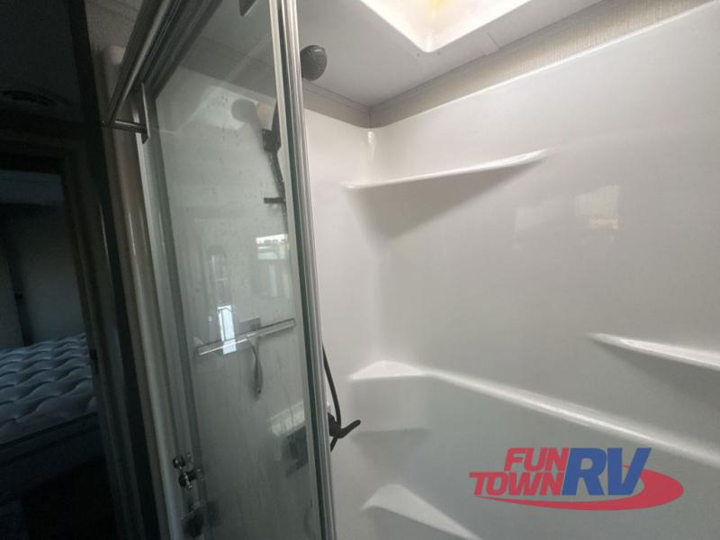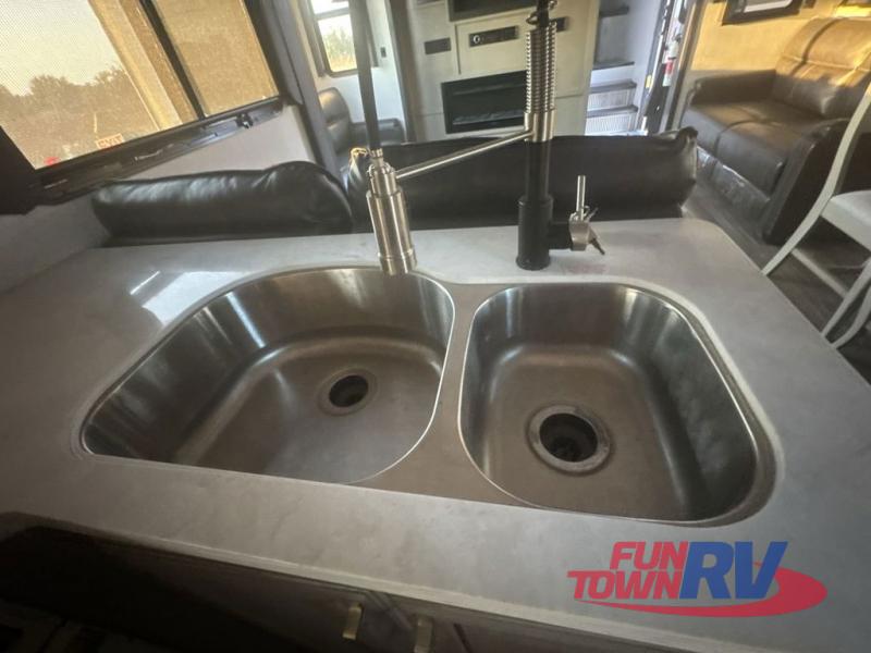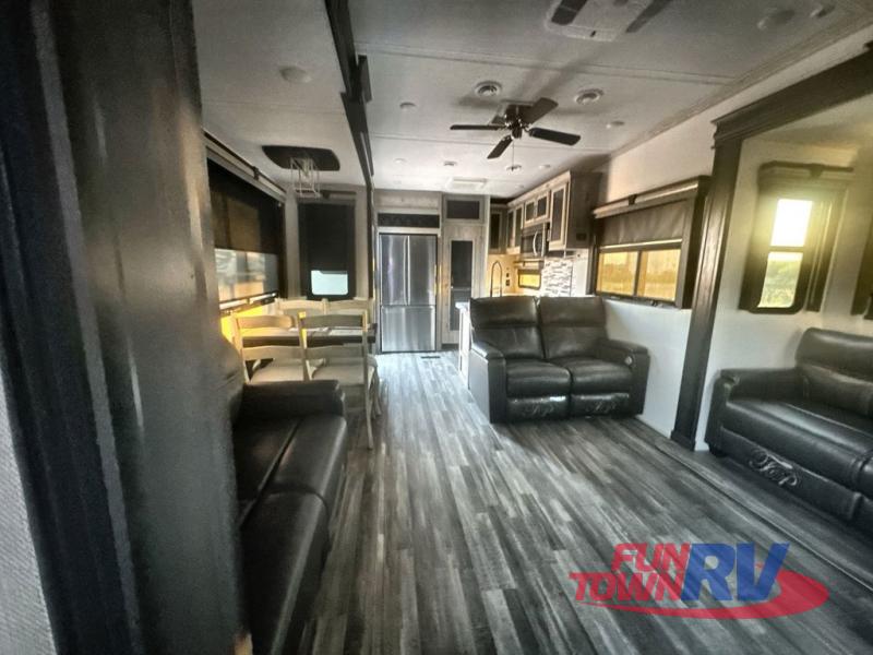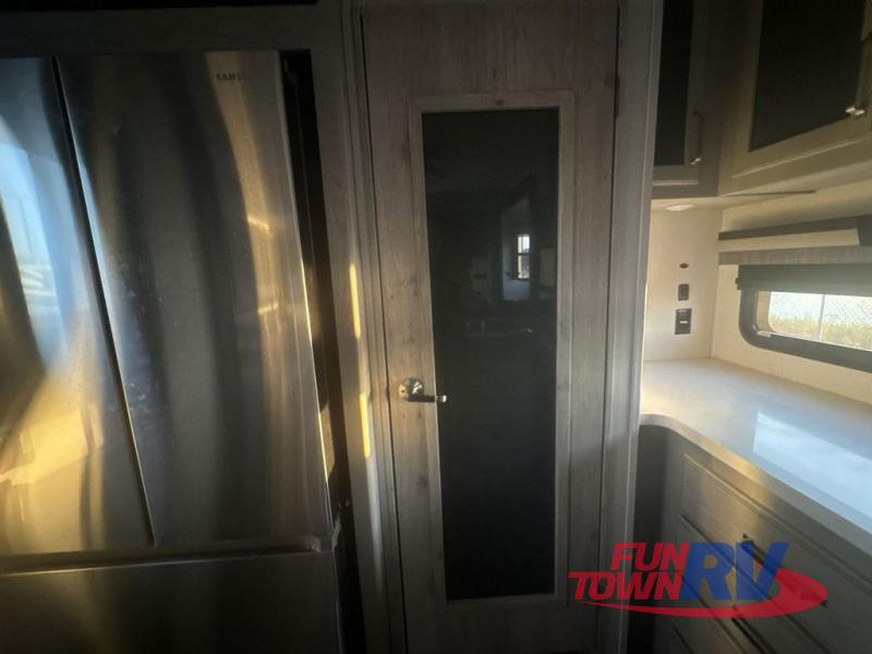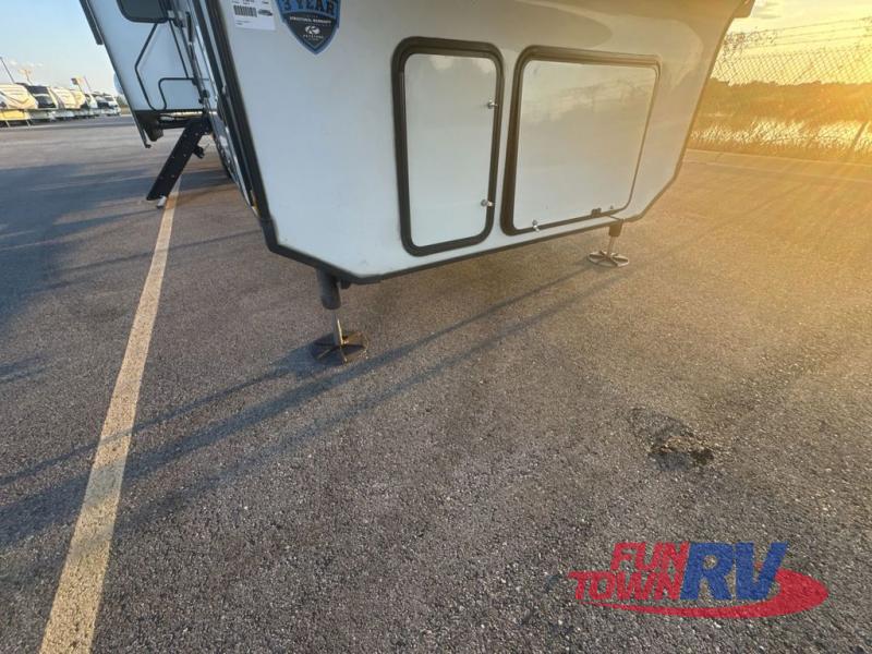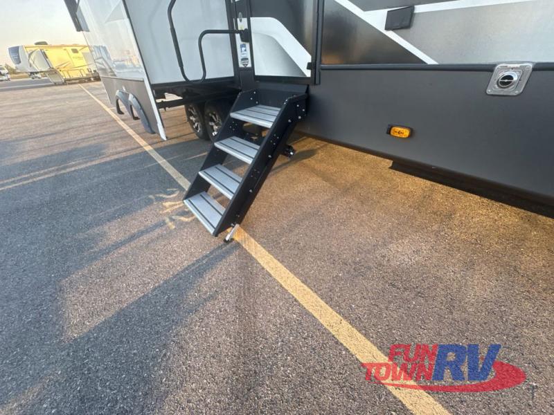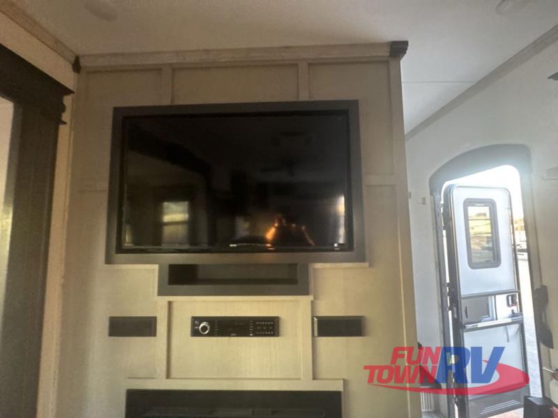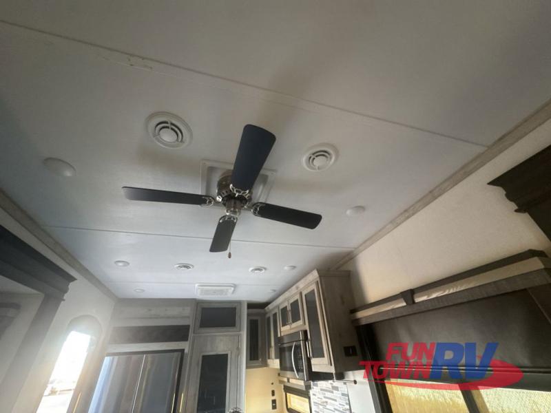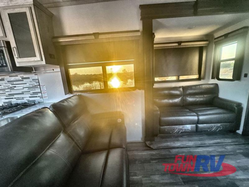 With a bath and a half, it's a clean decision to take this fifth wheel with you on your next camping trip! One of the dual entry doors leads directly into the rear kitchen which has a large pantry and a 18 cu. ft. gas/electric refrigerator to store your food items. The free standing dinette and tri-fold sofa sleeper slide and opposing tri-fold sofa sleeper slide opens up the middle living area for more walking around space. The half bathroom is conveniently next to the living area and has an area prepped to add the an optional washer and dryer for clean clothes throughout your entire trip. The master suite not only has a king bed slide with storage underneath and a bench next to a dresser, but also access into the front full bathroom which has a dual sink vanity, a shower with a seat, and a toilet with privacy walls!