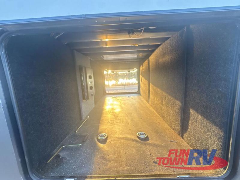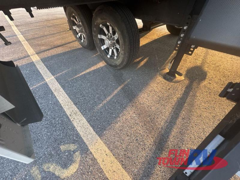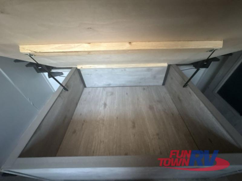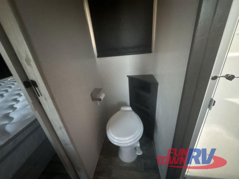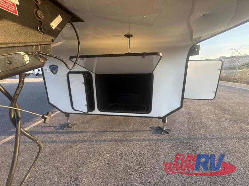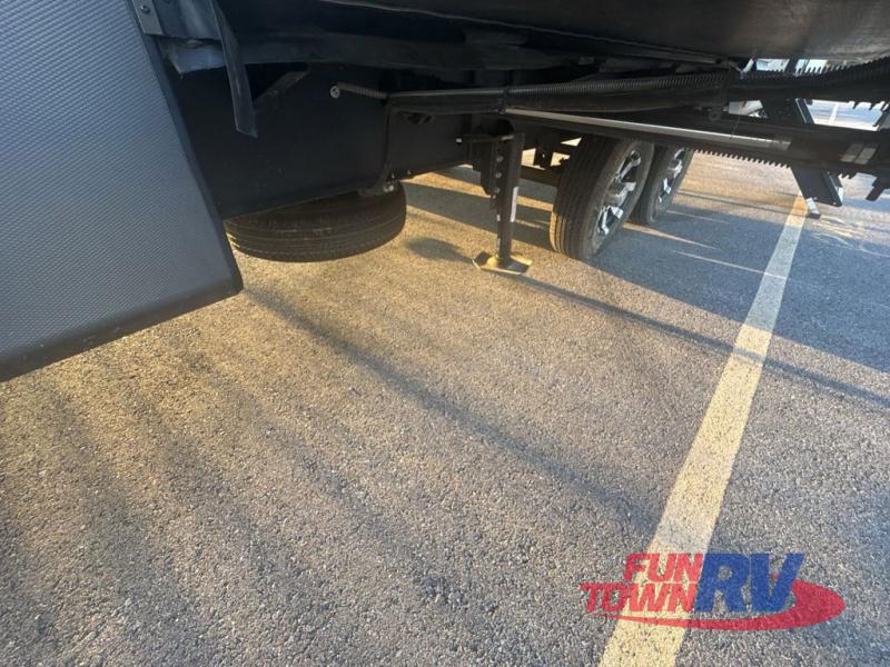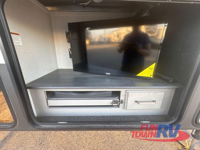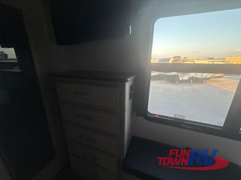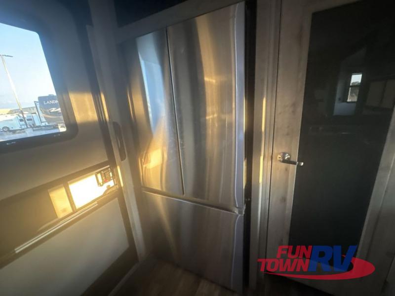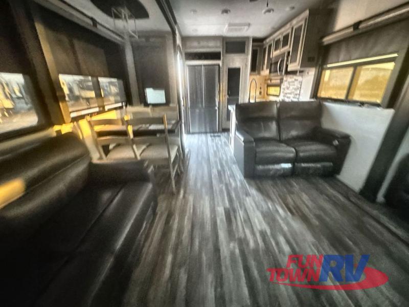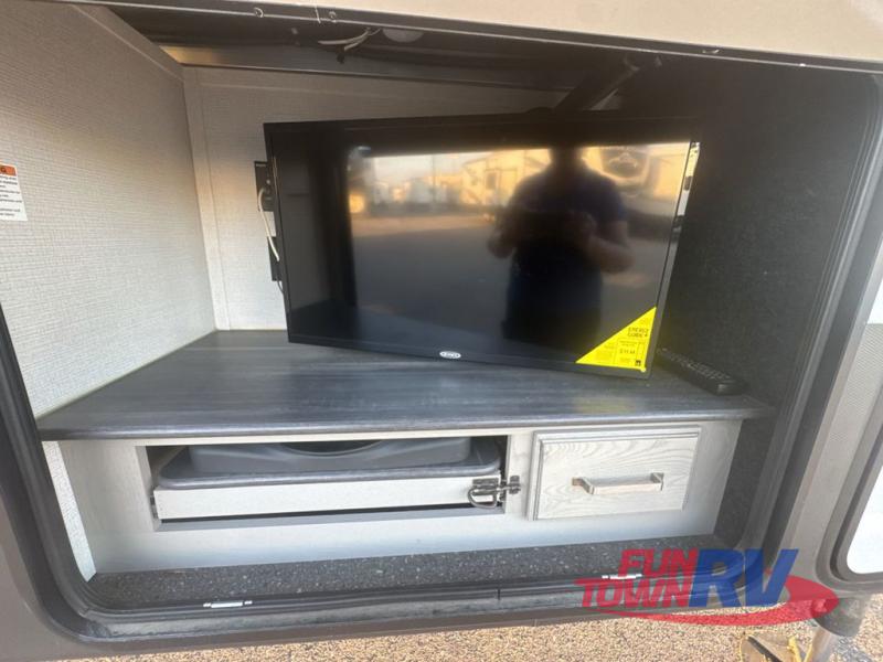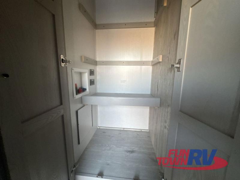 With a bath and a half, it's a clean decision to take this fifth wheel with you on your next camping trip! One of the dual entry doors leads directly into the rear kitchen which has a large pantry and a 18 cu. ft. gas/electric refrigerator to store your food items. The free standing dinette and tri-fold sofa sleeper slide and opposing tri-fold sofa sleeper slide opens up the middle living area for more walking around space. The half bathroom is conveniently next to the living area and has an area prepped to add the an optional washer and dryer for clean clothes throughout your entire trip. The master suite not only has a king bed slide with storage underneath and a bench next to a dresser, but also access into the front full bathroom which has a dual sink vanity, a shower with a seat, and a toilet with privacy walls!