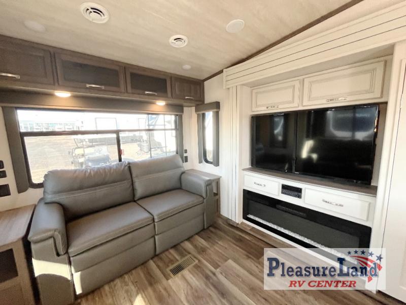 You will have the time of your life in this Cougar Half-Ton fifth wheel! There is so much comfort with the theater seating and 68" tri-fold sleeper sofa with end tables in the living area, and the comfort is taken up a notch with the addition of the fireplace below the entertainment center. You also have lots of space in this area because of the opposing slides, so you can work freely around the kitchen island preparing dinner or washing dishes. The dinette is right next to the kitchen, so you won't have to go far to set the table. The pantry is big enough to keep your favorite foods stored away, and the 8-cubic foot refrigerator can hold the items that need to be kept chilled.
