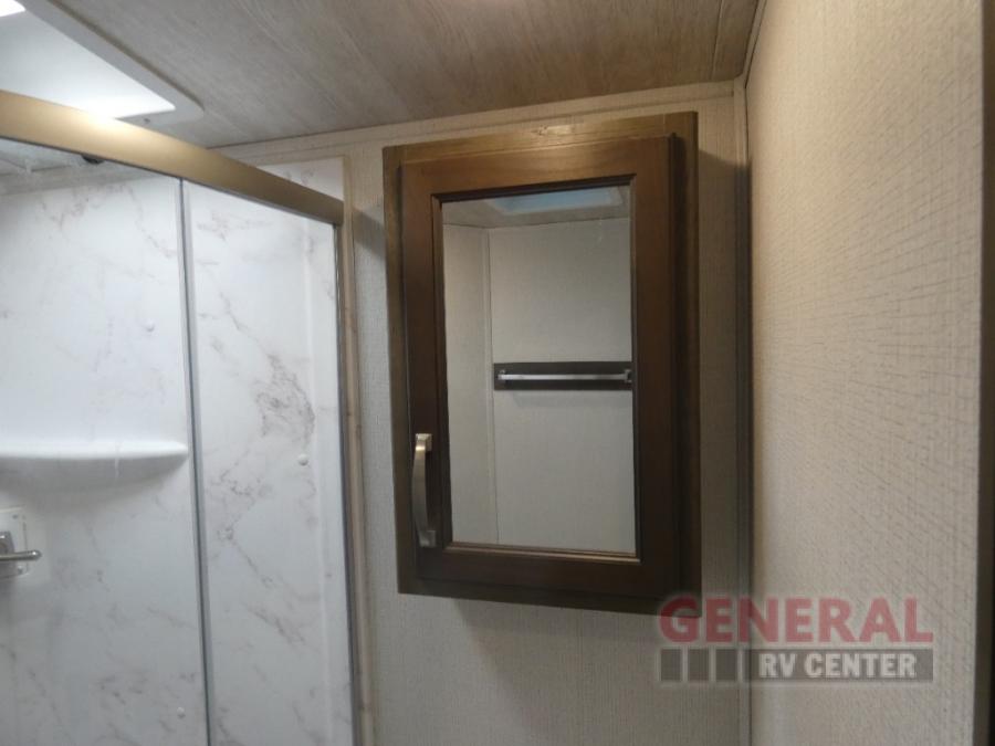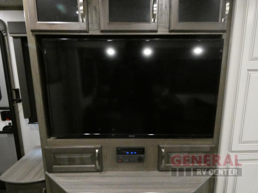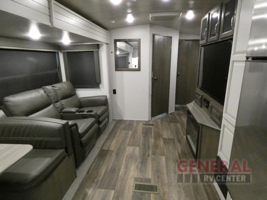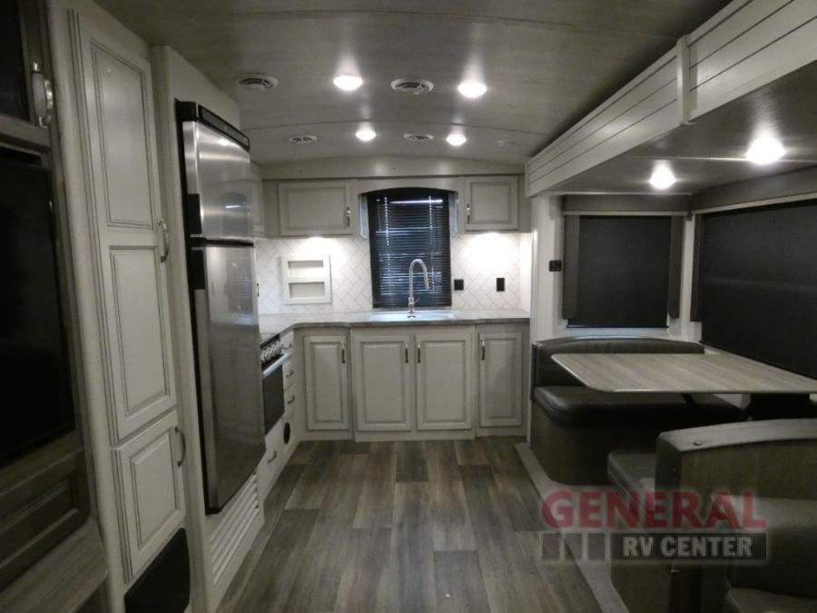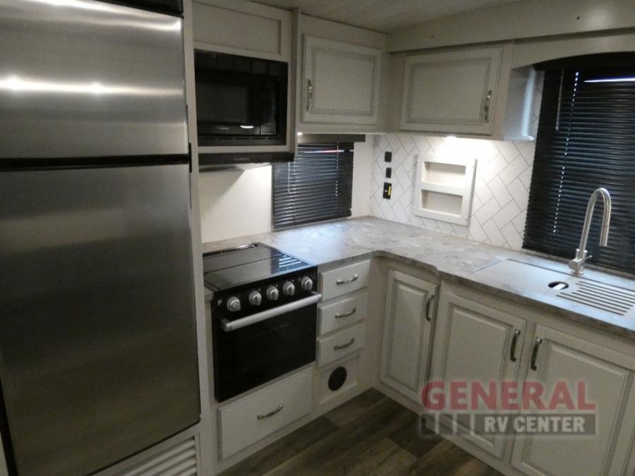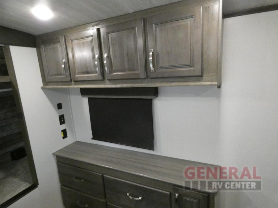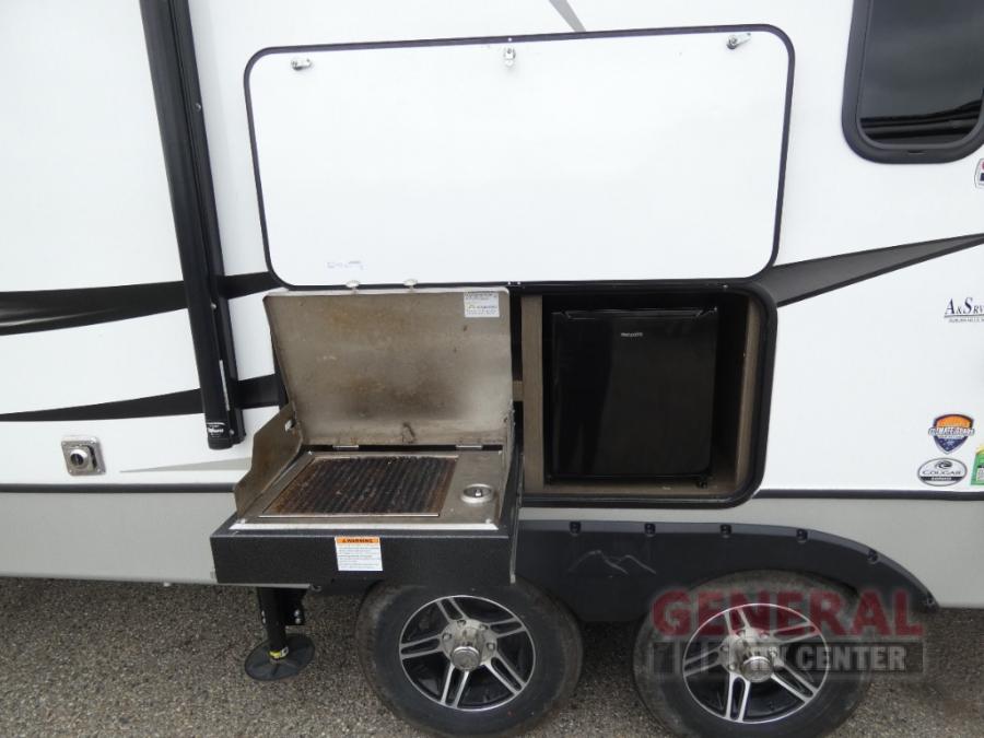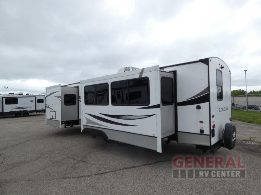 How does a king bed slide within a master suite sound? With this Cougar Half-Ton travel trailer, you'll have extra floor space and a full-width wardrobe allowing you to stay at your favorite campsite for long periods of time. The second slide located in the main living and kitchen area opens up this space for you to enjoy time spent inside just as much as outdoor adventures. The furniture even doubles as sleeping space for the kids or overnight guests. The rear kitchen layout is a convenience, and you will appreciate all the counter space for preparing and serving meals. You will find hidden storage behind the entertainment center, and next to the entertainment center is a pantry where you can store your favorite snacks.