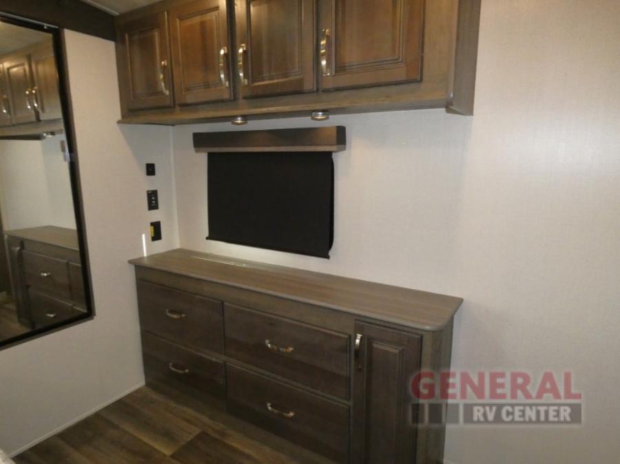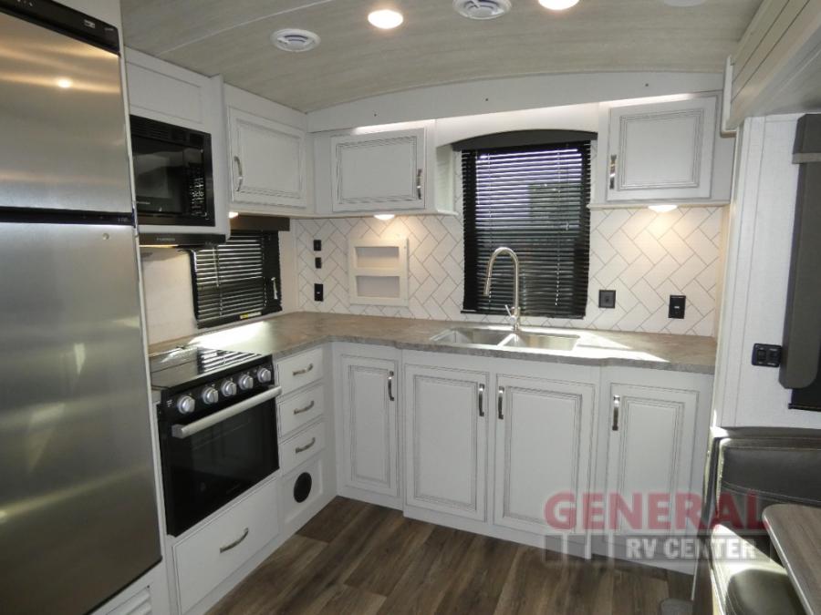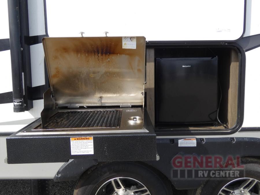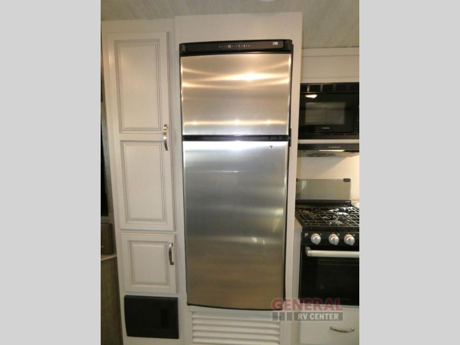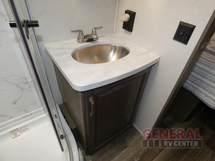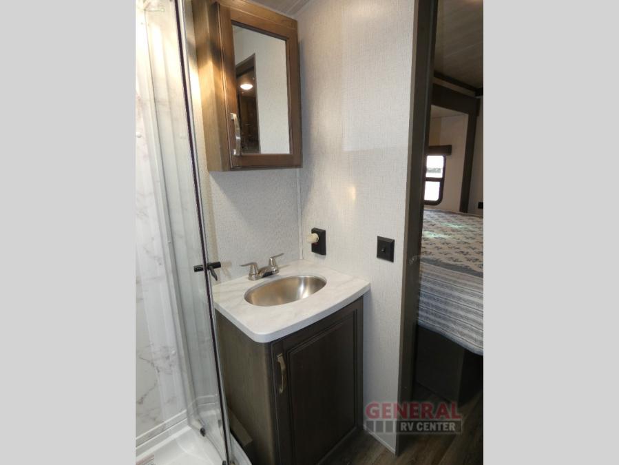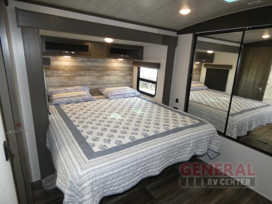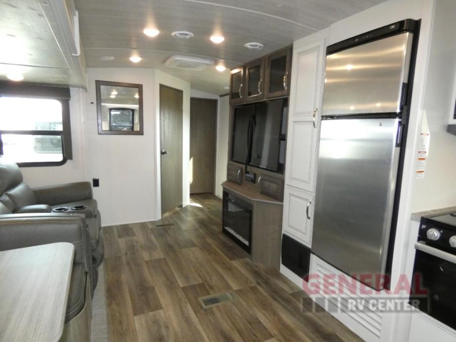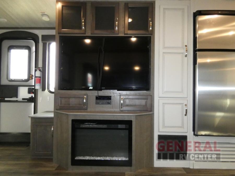 How does a king bed slide within a master suite sound? With this Cougar Half-Ton travel trailer, you'll have extra floor space and a full-width wardrobe allowing you to stay at your favorite campsite for long periods of time. The second slide located in the main living and kitchen area opens up this space for you to enjoy time spent inside just as much as outdoor adventures. The furniture even doubles as sleeping space for the kids or overnight guests. The rear kitchen layout is a convenience, and you will appreciate all the counter space for preparing and serving meals. You will find hidden storage behind the entertainment center, and next to the entertainment center is a pantry where you can store your favorite snacks.