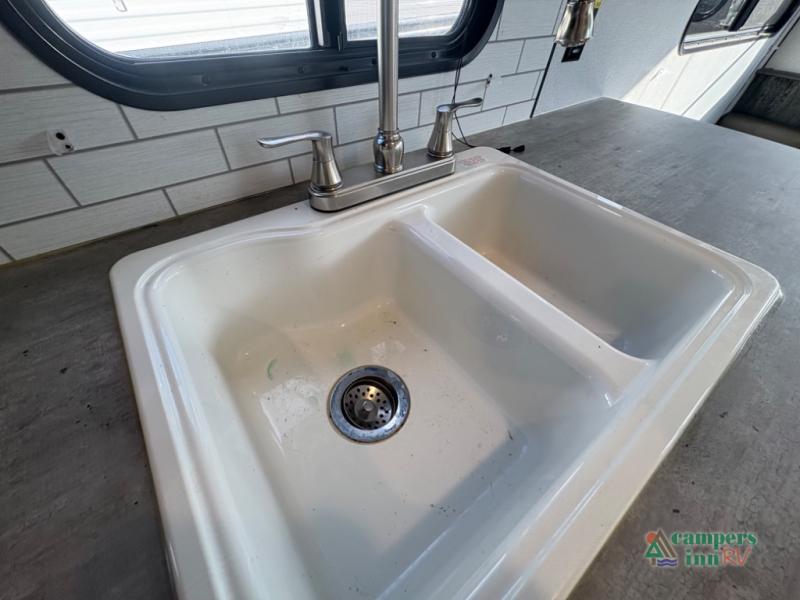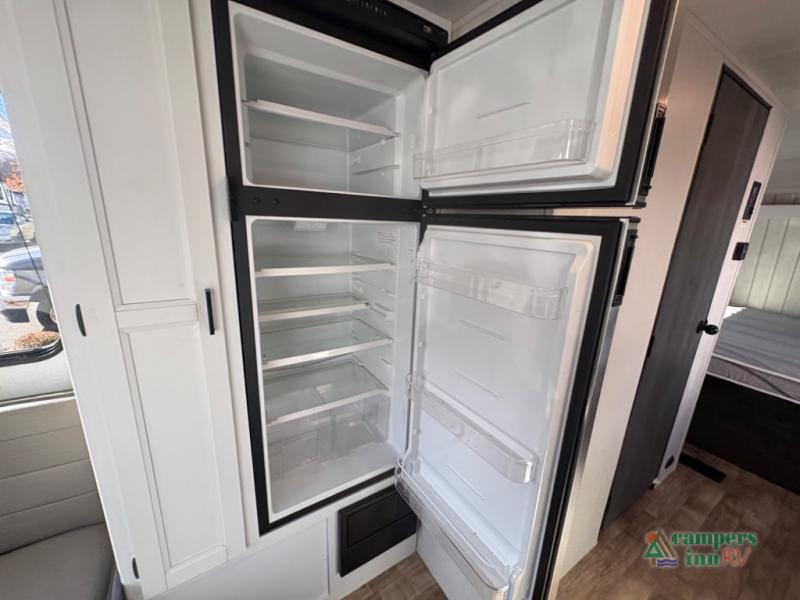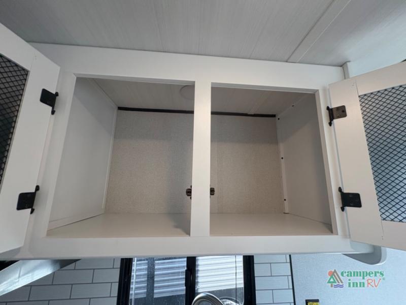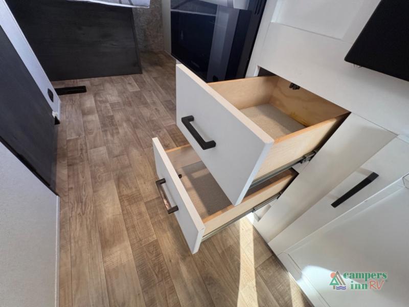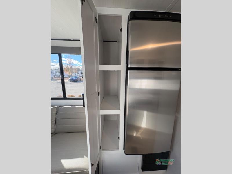 The kitchen is thoughtfully equipped with everything you need for easy, enjoyable meal prep. With a two-burner cooktop, microwave, refrigerator, generous counter space, and well-placed storage cabinets, you can cook your favorites whether you’re deep in the mountains or relaxing by the lake. Moving toward the front, you’ll find a comfortable queen-size bed, wardrobe storage, and nightstands that make settling in for the night feel effortless.