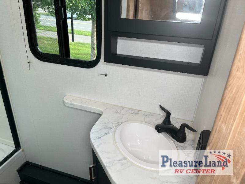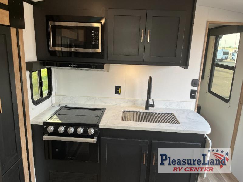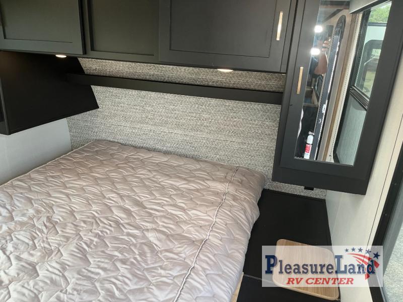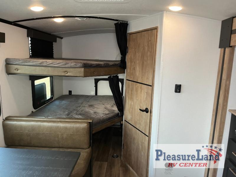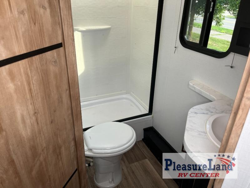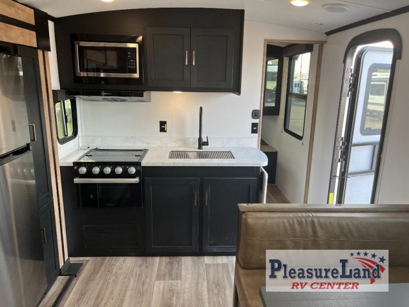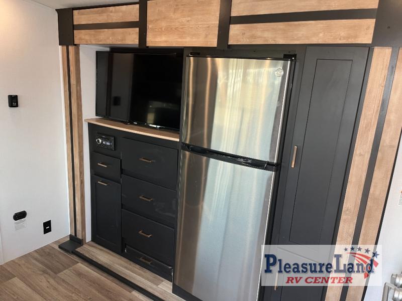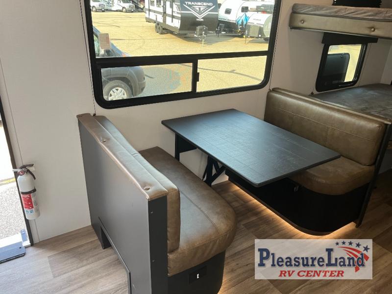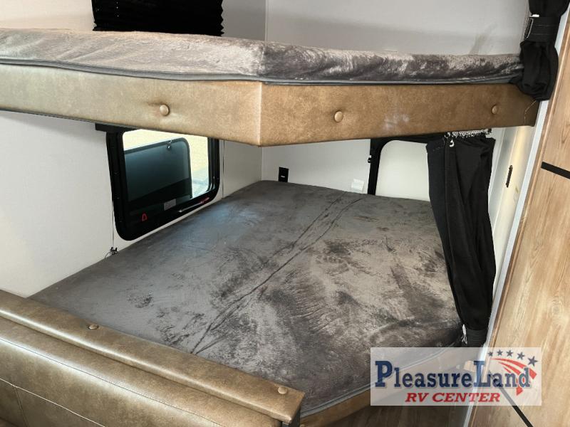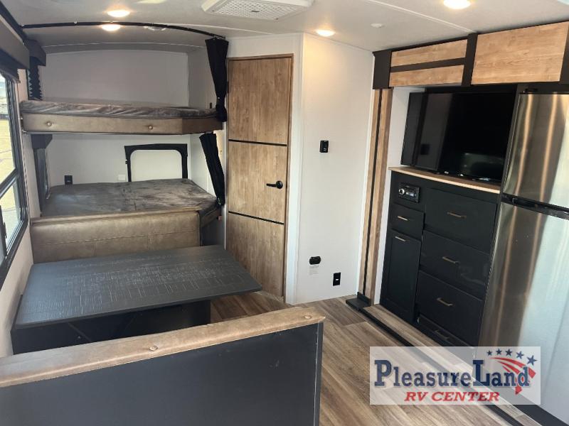 Why not enjoy double-the-fun when you camp next time! There is a set of double-size bunks in the rear corner with storage underneath. You can easily pack bikes or cargo through the rear exterior bike/cargo door for them to safely travel inside. The booth dinette offers a great place to dine and visit while the cook utilizes all the kitchen appliances and you watch the 40" TV. There are handy pull-out dog dishes, shoe storage and a counter extension for more space to dry the dishes and such. The rear corner full bathroom will keep everyone refreshed, the outside kitchen gives the cook more choices when making meals, plus the front bedroom allows you to sleep like a queen, and your pet to have their own space.