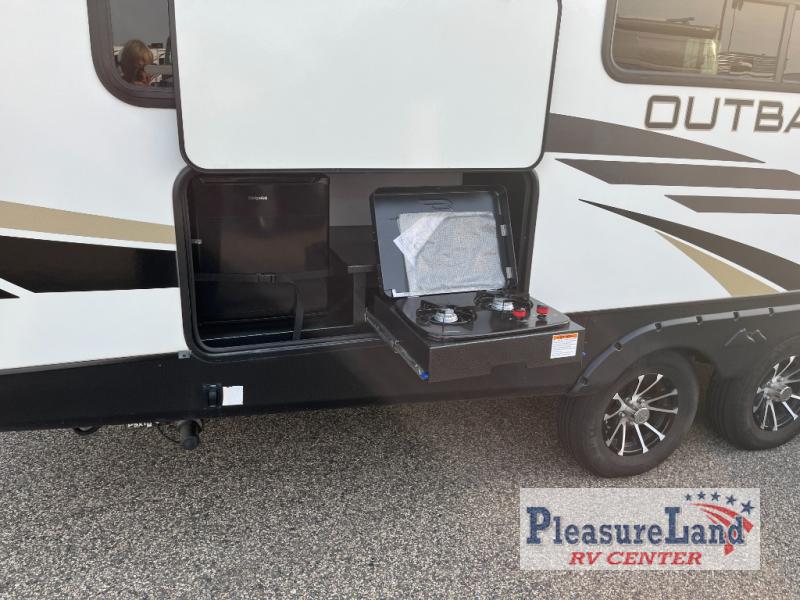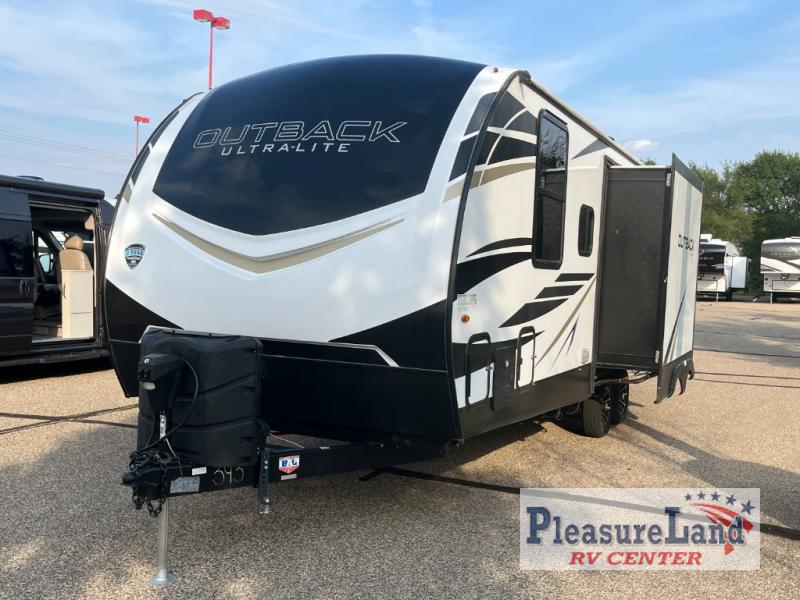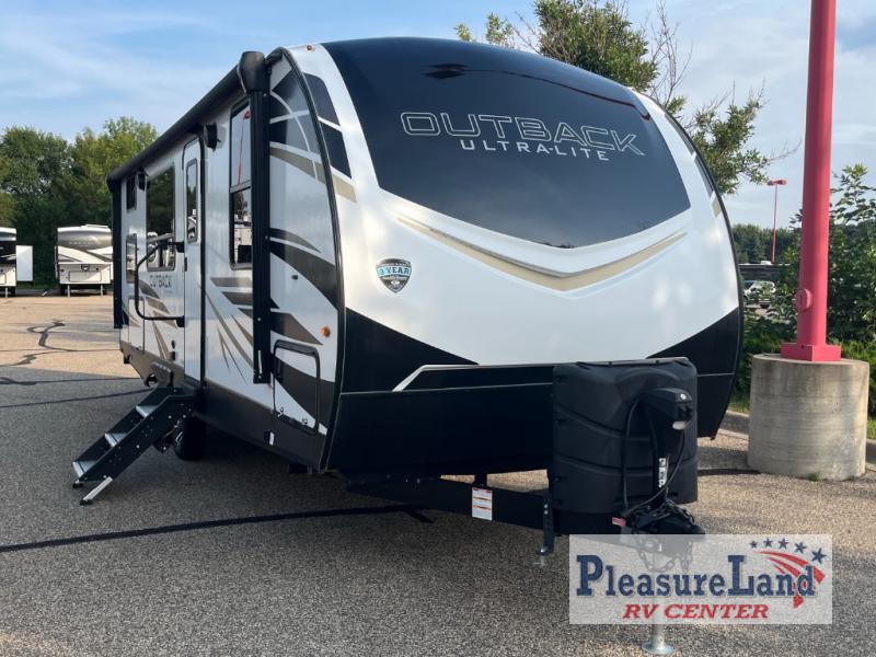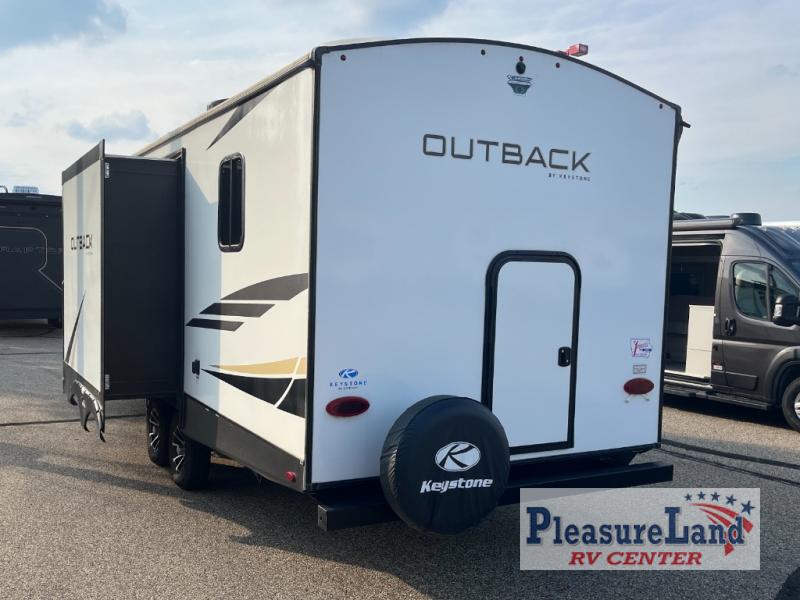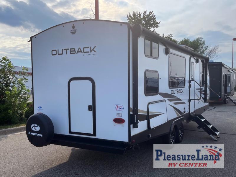With any Outback Ultra Lite travel trailer or toy hauler by Keystone, you begin with a BAL Norco huck bolted "Z" channel frame, and there is a pinch rolled laminated gel-coated fiberglass exterior, a leaf spring suspension system, large panoramic black framed tinted safety glass windows, plus a power tongue jack and LCI power stabilizing jacks for easy setup. The interior offers pre-drilled and screwed hand-glazed modern cabinetry, extra tall slide height for maximum space, in-floor heating ducts, a Dream dinette with max-store for more storage space, and an On Demand hot water heater to mention a few highlights. Make your lightweight towing decision today, choose a comfortable and stylish Outback Ultra Lite today!